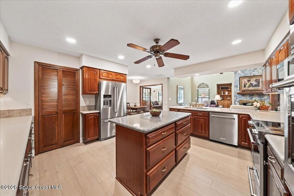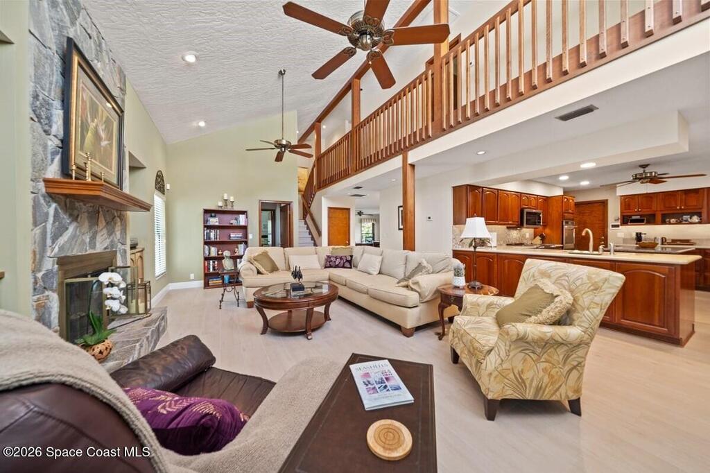 Exceptional Indialantic Island living in a prime location between the Melbourne and Eau Gallie Causeways! This beautifully remodeled residence offers over 3,554 sq. ft. with a bright, open layout and soaring 20-ft ceilings in the Great Room, highlighted by transom windows and a wood-burning fireplace with custom built-ins. The updated kitchen features custom cabinetry, new appliances, pantry, and breakfast nook, all seamlessly open to the main living area. The second-floor primary suite is a private retreat with a spa-inspired bath, two large walk-in closets, and a balcony. A first-floor guest en-suite with private entrance and patio adds flexibility. Additional features include a bonus game room, dedicated office, oversized bedrooms, impact windows, concrete tile roof, and paver patio. Just minutes to the beach, shopping, and dining--enjoy the best of Indialantic coastal living!