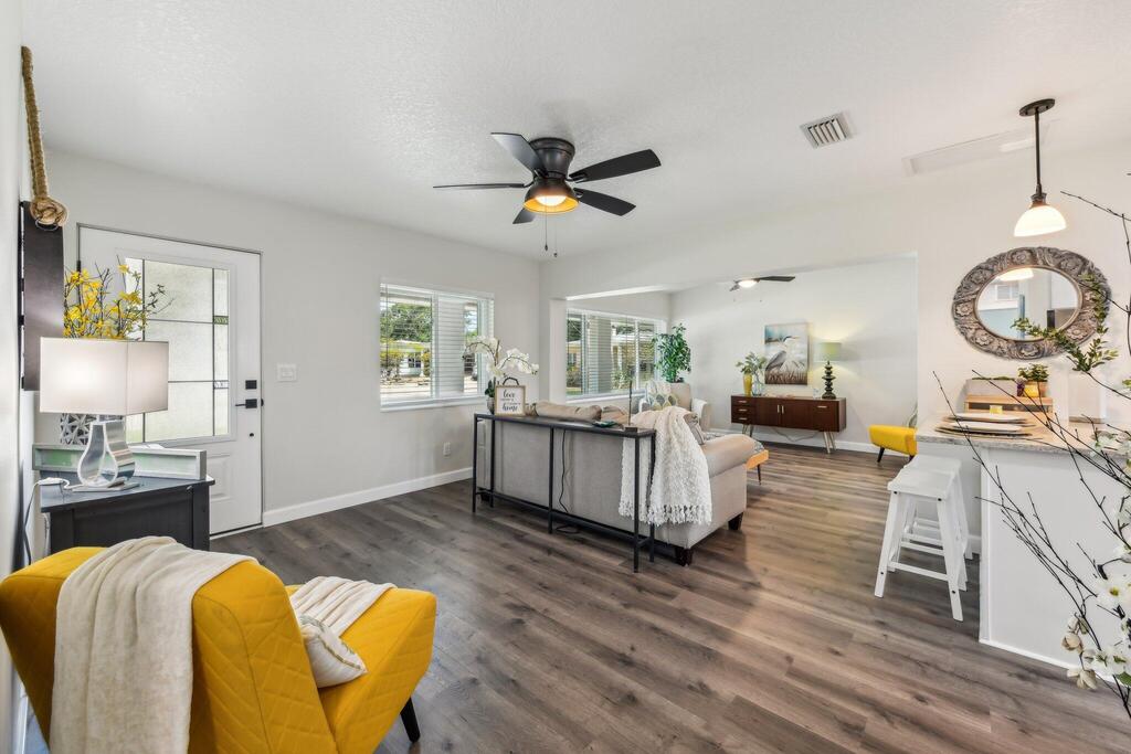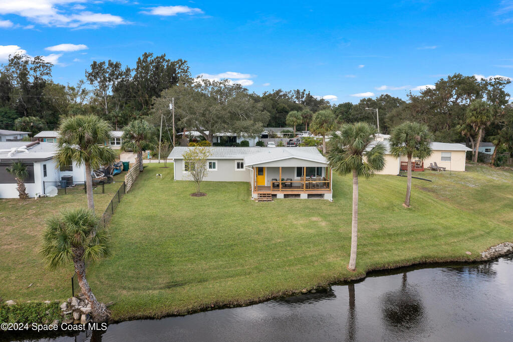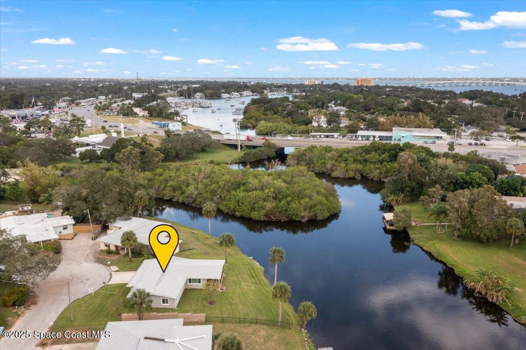 Tucked away at the end of a peaceful cul-de-sac, this completely renovated waterfront gem (including plumbing, electrical, AC and roof) offers the perfect blend of modern luxury and Florida charm. This home offers a light, bright, and open 3-bedroom, 2-bath split plan retreat with an inside laundry room. The upgraded kitchen seamlessly connects to the spacious family room, high-end Pergo flooring flows throughout an airy, open concept design which includes a vaulted master suite with stunning water views. Perched along the dredged Elbow Creek, the property provides easy access for larger boats to the Indian River, with a fixed bridge offering over 20 feet of clearance. There is ample space on this third of an acre lot to install your own dock and boat lift. Spend your mornings on the expansive back porch marveling at gentle manatees and playful dolphins and savor breathtaking sunrises as the Atlantic lights up the horizon. Quick access by boat or car to Frigate's
