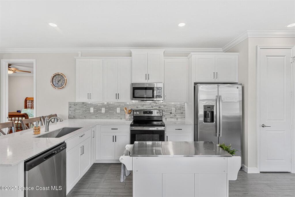 Must See 1565 Sq. ft. waterfront home in in Bridgewater, Viera's sought after 55+ resort style gated community! This 2 bedroom plus study, 2 bath, 2 car oversized garage (20X21) home checks off all the boxes: plank tile floors and crown molding throughout, 8' doors, deluxe light package with LED lights in Great Room and Primary Bedroom, and 5 ceiling fans. Designer kitchen with staggered white cabinets, marble look quartz counters, decorator backsplash, and portable island with extra drawers and cabinets! Luxury primary bath with large shower w/ bench, quartz counters and upgraded faucets! Study with double doors includes a murphy bed for those out-of-town guests! Laundry Rm has extra closet! Private screened-in entry and 270 sq. ft. back porch. Unwind at the private clubhouse, featuring a heated pool w/ waterfall & spa, fitness room, billiard room, coffee lounge, lit tennis & pickle ball courts, and a movie theater! The HOA covers lawn care! Short car ride to Atlantic beaches!