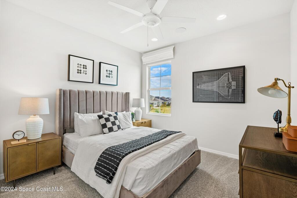Lakefront Former Model Home in Viera where modern elegance meets an active, amenity-rich lifestyle. Built in 2023 and sited for long water views, this home welcomes you with brand new luxury vinyl plank flooring through the main living areas and an open floorplan with high ceilings that frame the lake from an oversized screened porch an ideal spot for morning coffee, sunset gatherings, or relaxed entertaining. The gourmet island kitchen features quartz countertops, stainless steel appliances, a pantry, and a large dining area overlooking the water, while a dedicated office with French doors provides a quiet workspace. The downstairs primary suite offers an expansive walk-in closet and a spa-like bath with double sinks, and two additional bedrooms plus two full baths on the main level ensure comfortable space for family and guests. Upstairs a spacious loft serves as a flexible family or recreation room accompanied by an additional bedroom and full bath. Located in Viera's award