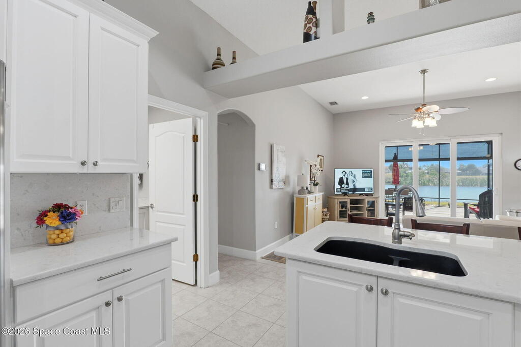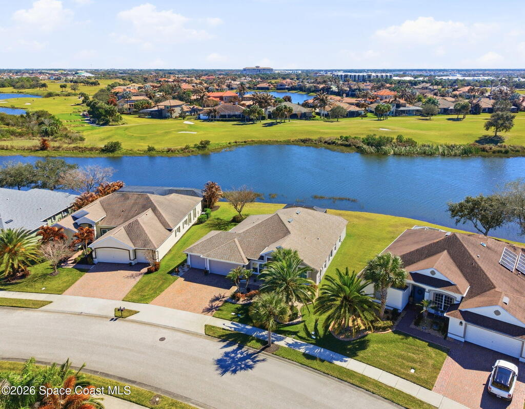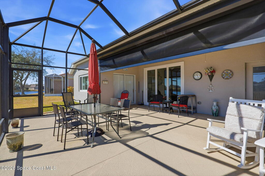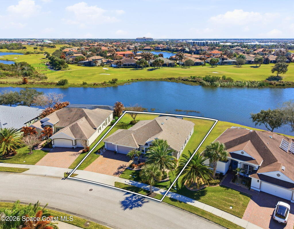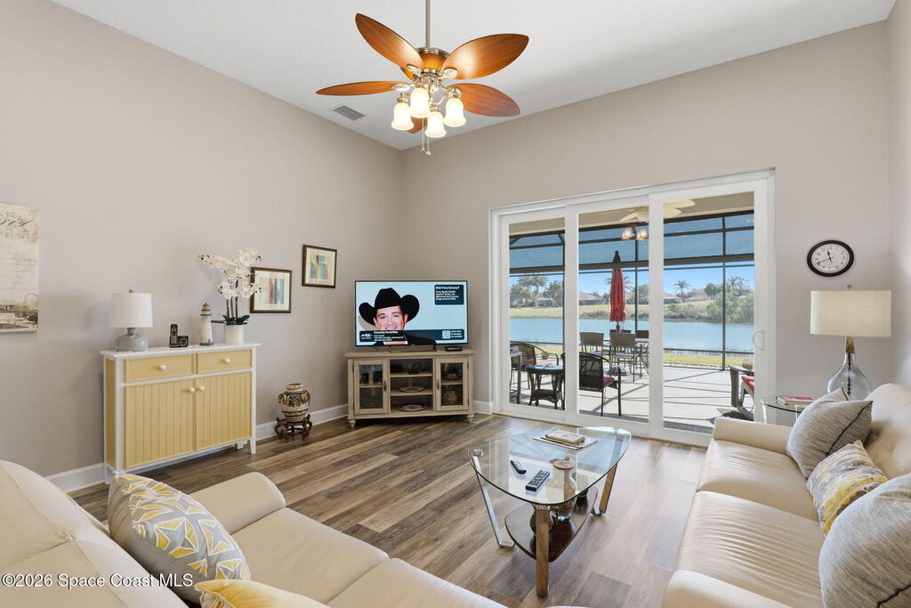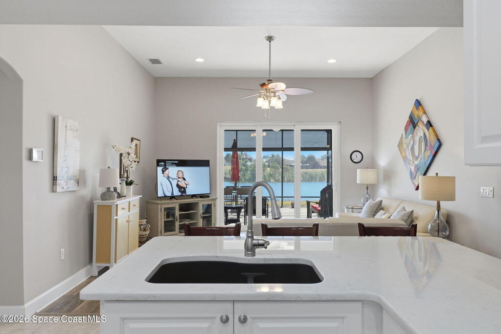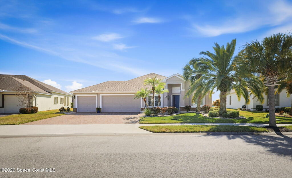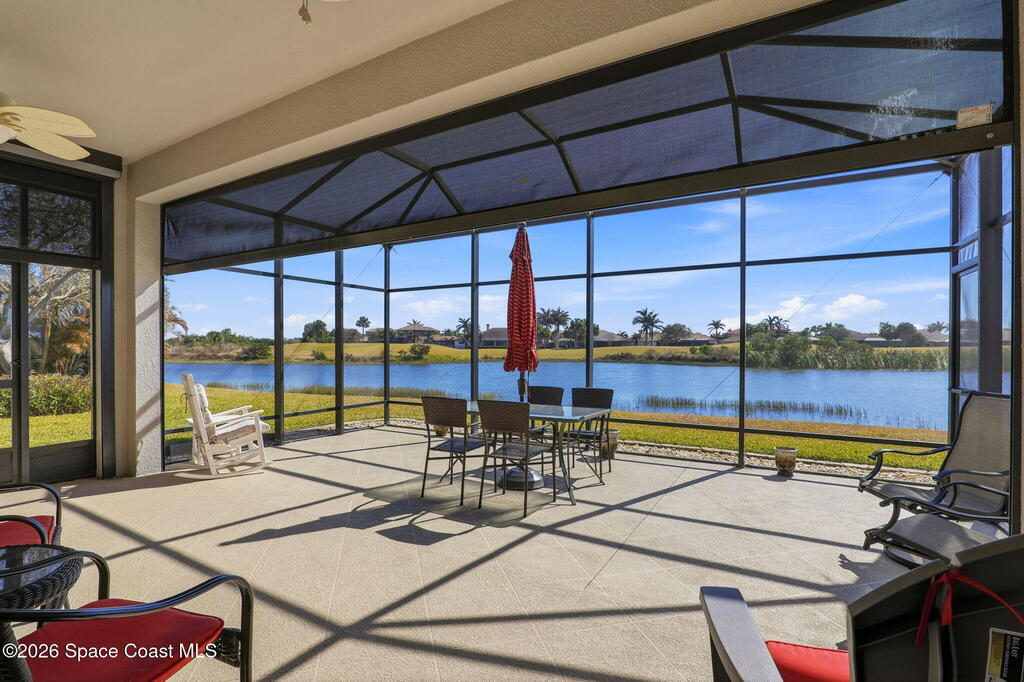Welcome to this beautifully maintained one of a kind 3-bedroom, 2-bath Estate home located in sought after 55+ Heritage Isle Community. Enjoy serene waterfront and golf course views from your backyard and abundant natural light throughout the home. The updated kitchen and bathrooms feature modern finishes such as quartz countertops, under cabinet lighting and soft close cabinet doors. Tile and laminate flooring throughout home complemented by impact glass windows enhanced with thoughtfully appointed plantation shutters for peace of mind and energy efficiency. Spacious three car garage offers ample storage and convenience. Gain the confidence you deserve with professionally installed hurricane screens, offering quick and convenient storm protection with a touch of a button while enjoying shade and privacy the rest of the year. This home combines comfort, style, and low maintenance living in a prime location perfect for relaxing and entertaining.