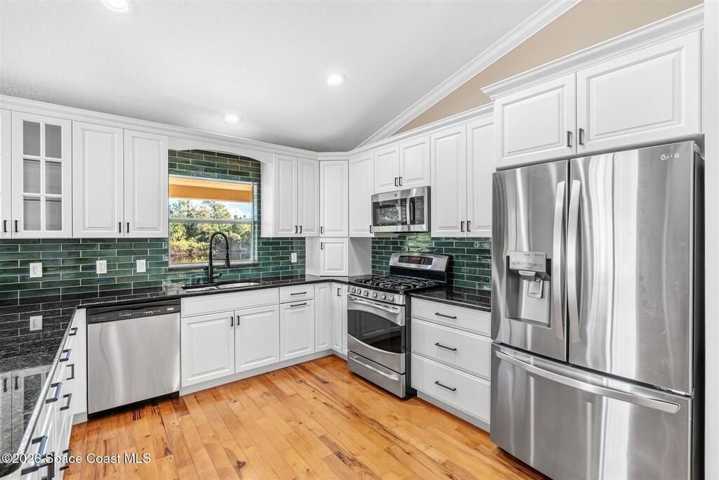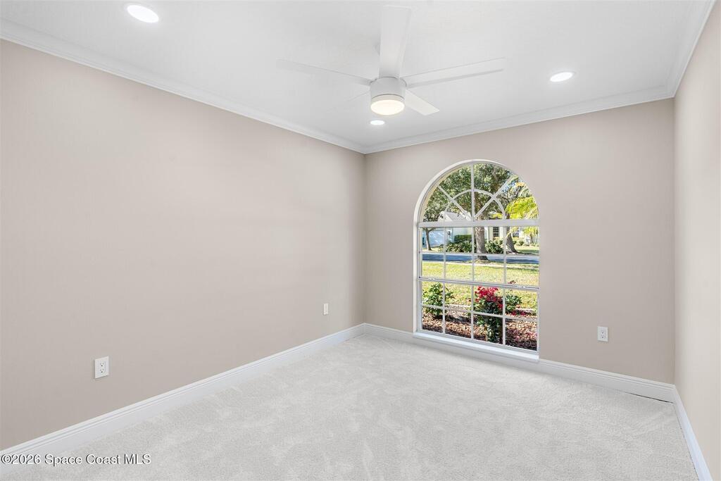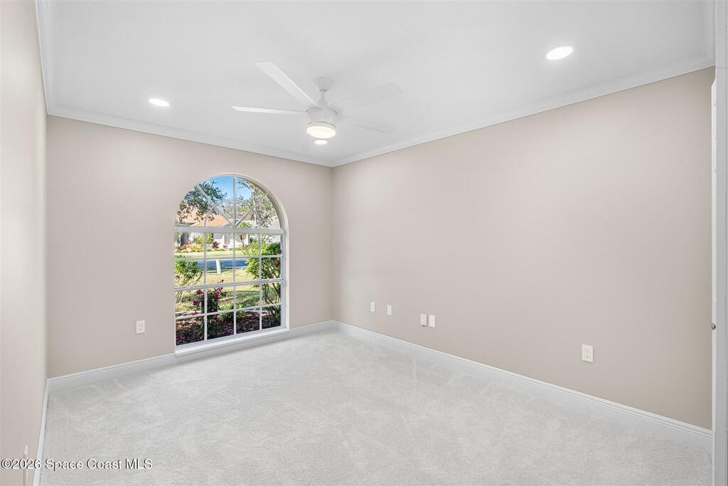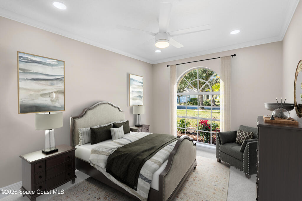 This custom-built waterfront home offers modern updates, and peaceful privacy. The entryway opens to serene backyard and water views, setting the tone for the home's thoughtful design. The exterior was freshly painted in 2026, including the patio deck and entire garage, and is complemented by updated landscaping and a shingle roof installed in 2018. Inside, the home shines with new carpet installed December 2025, fresh interior paint, new windowsills, and LED recessed lighting in every room. Additional upgrades include new outlets with screwless cover plates, six ceiling fans, and a washer and dryer installed in 2022. The updated kitchen features painted cabinets, a stylish backsplash, stainless steel appliances, and overlooks the tranquil waterfront. Crown molding throughout and chair rail accents add elegant detail. The primary suite offers a spacious bath, walk-in closet, and beautiful water views. This home blends custom design, modern comfort, and a special waterfront setting.