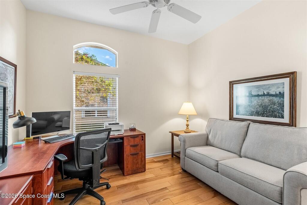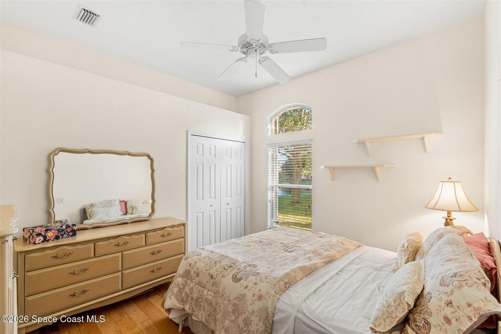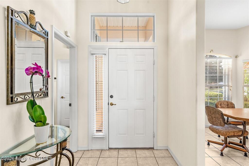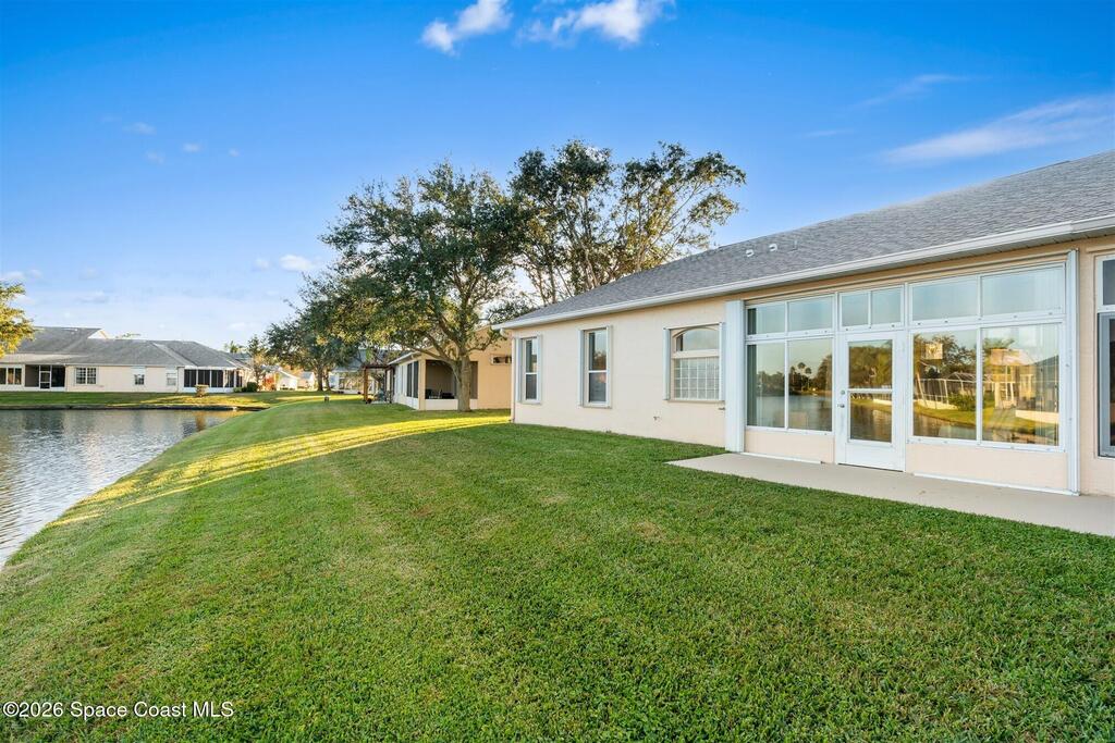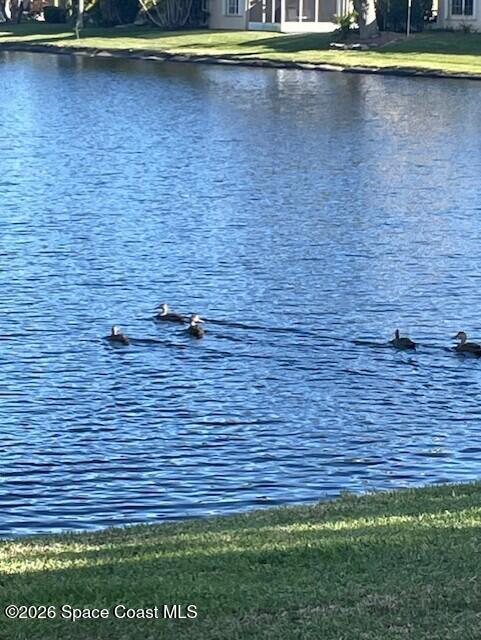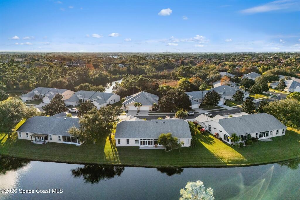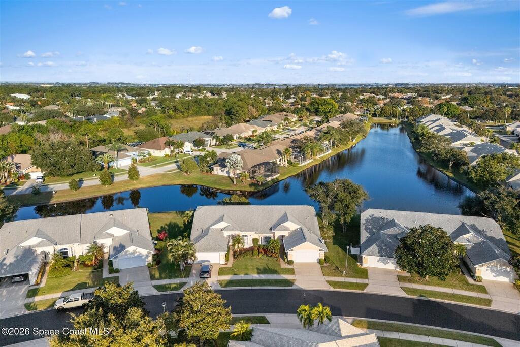 Enter through the community gate of Magnolia Pointe in Suntree and follow around to this 3-bedroom, 2-bath, 2-car garage home with water views! This popular one level floor plan has upgrades that include: granite countertops, new shower in hall bathroom, 140 sq. ft. porch with air (total sq. footage= 1,921), engineered wood flooring by Classic Wood Floors in the main living areas and all bedrooms (no carpet). Enjoy the east facing views and watch the ducks and wildlife on the waterway from the patio, porch, great room or primary bedroom.This half-duplex offers a low-maintenance lifestyle which includes lawn and sprinkler care, roof replacement, exterior painting, exterior insurance and more. A community pool and cabana complete the picture for a great lifestyle in a quiet community near shopping and restaurants.Original owners leaving their much-loved home and community to be closer to children. Roof (2016 by HOA), Water Heater (2014, HVAC (2016)