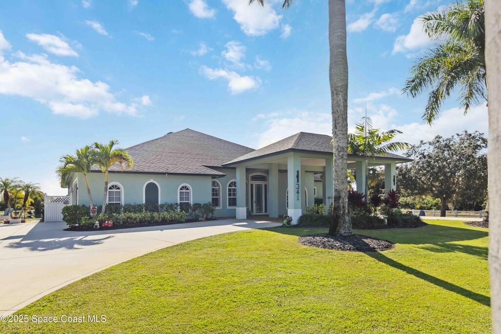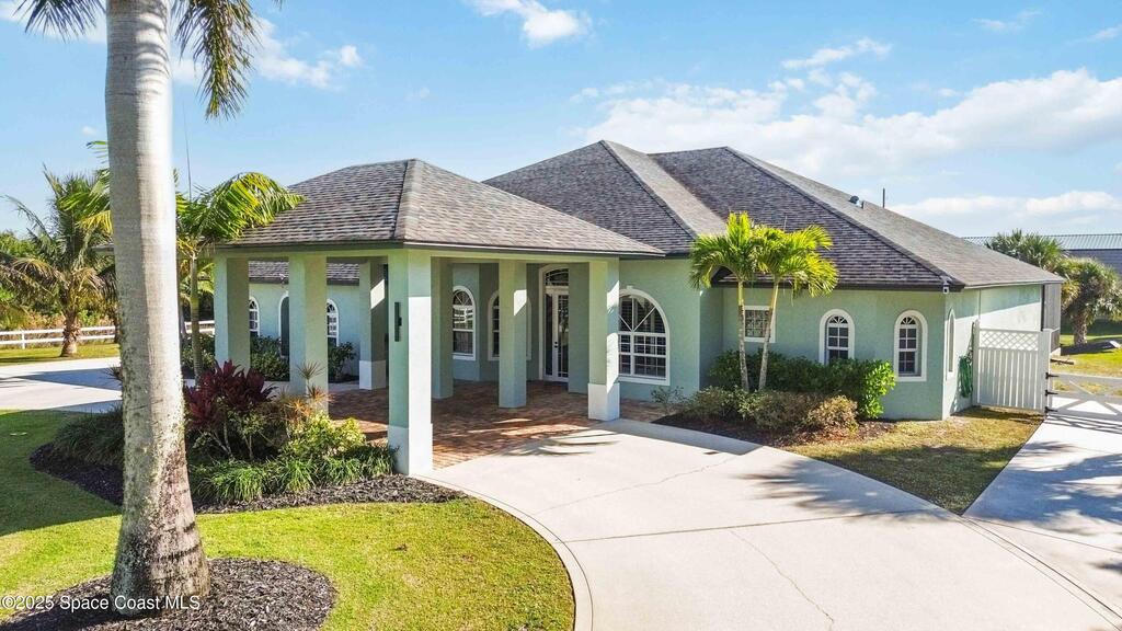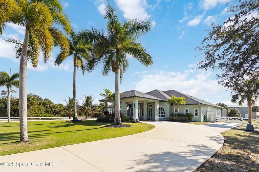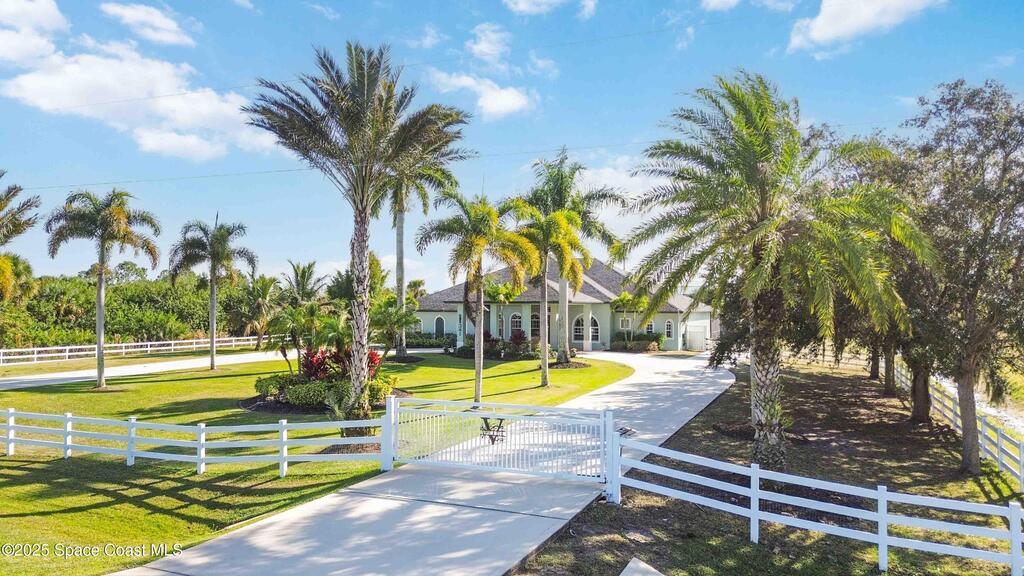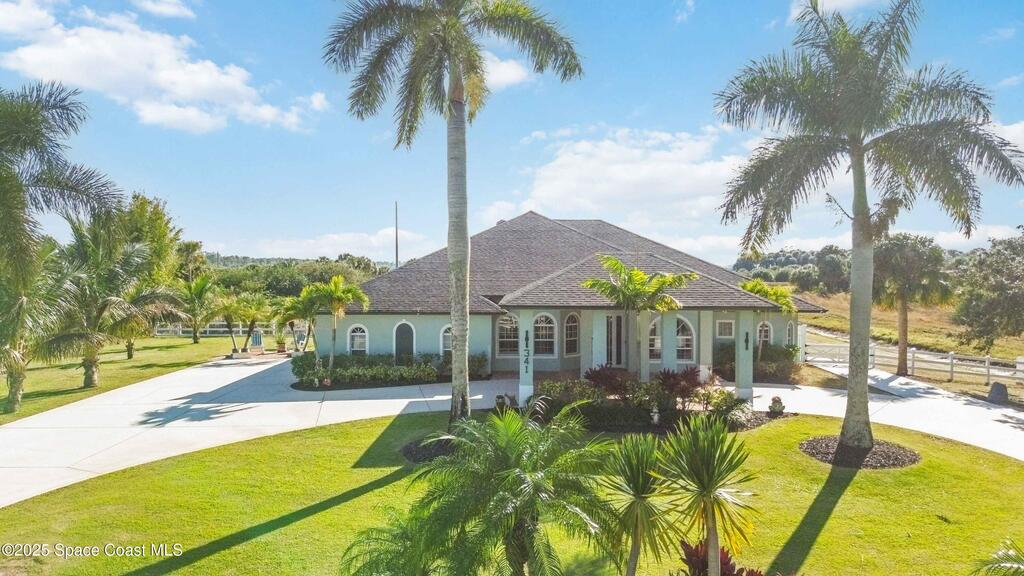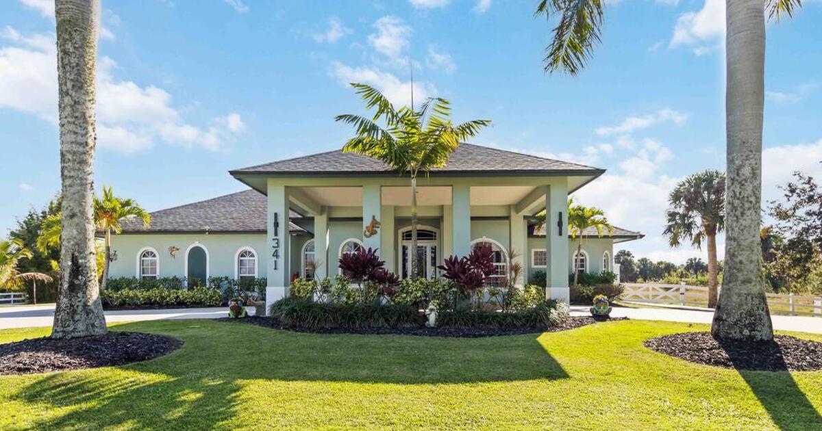Welcome to 341 Buckskin Street, an extraordinary custom-built estate located in the highly desirable equestrian community of Deer Run. Built in 2008 by a family-owned contracting business, this home was thoughtfully designed for durability, comfort, and unforgettable gatherings--all while offering the peace and privacy of nearly 3 acres of beautifully landscaped land.Bring your horses and enjoy true Florida living with a pond, lush tropical landscaping, and no close neighbors. A stunning circular driveway--capable of accommodating up to 25 vehicles--is framed by a charming white fence and secured by two large electric aluminum gates with keypad access, creating an impressive and private entrance. Many of the mature palm and tropical trees were brought from Miami, adding a resort-style, tropical aesthetic throughout the property.This home was built with exceptional craftsmanship and hurricane-resistant construction.