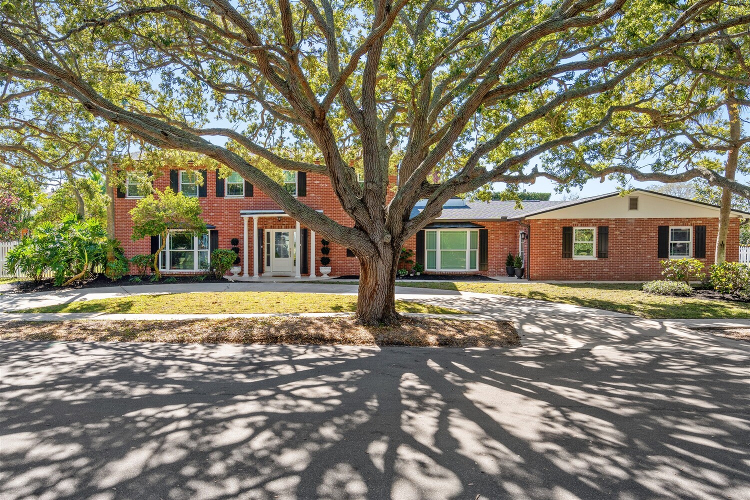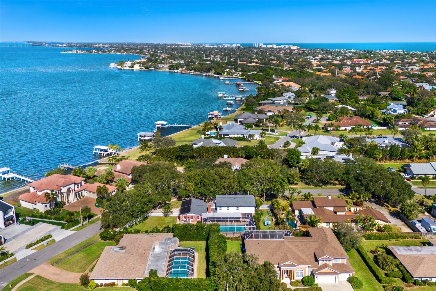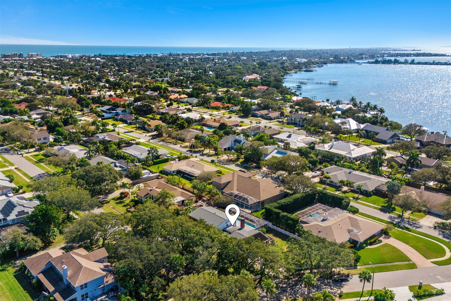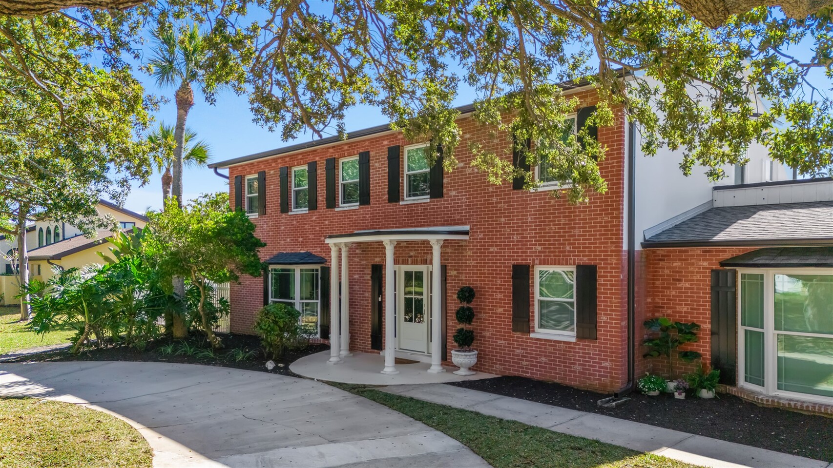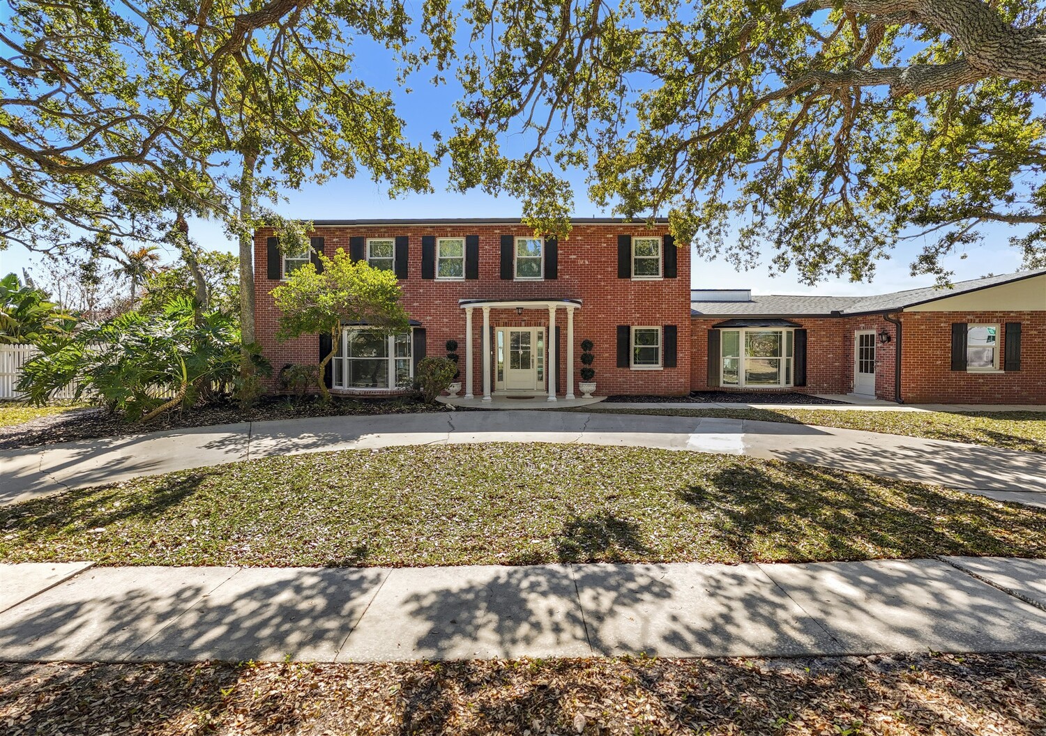 Remodeled in 2025 with impact windows, new 1st floor owner's suite, roof new in 2020, acs 2021 and 2025! Enjoy crisp river breezes in Indialantic in this gorgeous traditional concrete block house featuring 4 beds and 4 baths (2 owner suites) on a large corner lot. Stately oaks grace the grounds and a circular drive allows for guest parking. Neutral plank tile throughout the first floor reflects the feeling of sand beneath your feet. The charming contemporary kitchen includes a breakfast bar, ample cabinetry, a stylish tile backsplash, and stainless steel appliances. Nearby, a spacious living and dining room offer the perfect space for entertaining, and the huge family room features a cozy fireplace. A dedicated office makes the perfect area for a WFH setup, home gym, or studio. The stunning new owners' suite on the first floor offers a spa-like bathroom with a soaking tub, frameless shower, and large walk-in closet. Step outside to find a huge, fenced backyard where you can soak up the Florida sun and lounge by the pool. Upstairs, find three additional bedrooms including a large secondary owners' suite with remodeled bath and two additional generously sized bedrooms. This house has newly installed impact windows, new A/C, and a fenced lot. There is plenty of room for a large or multigenerational family. Located close to shops, restaurants and a bike ride to the beach, this lovely house is ready for a new family.