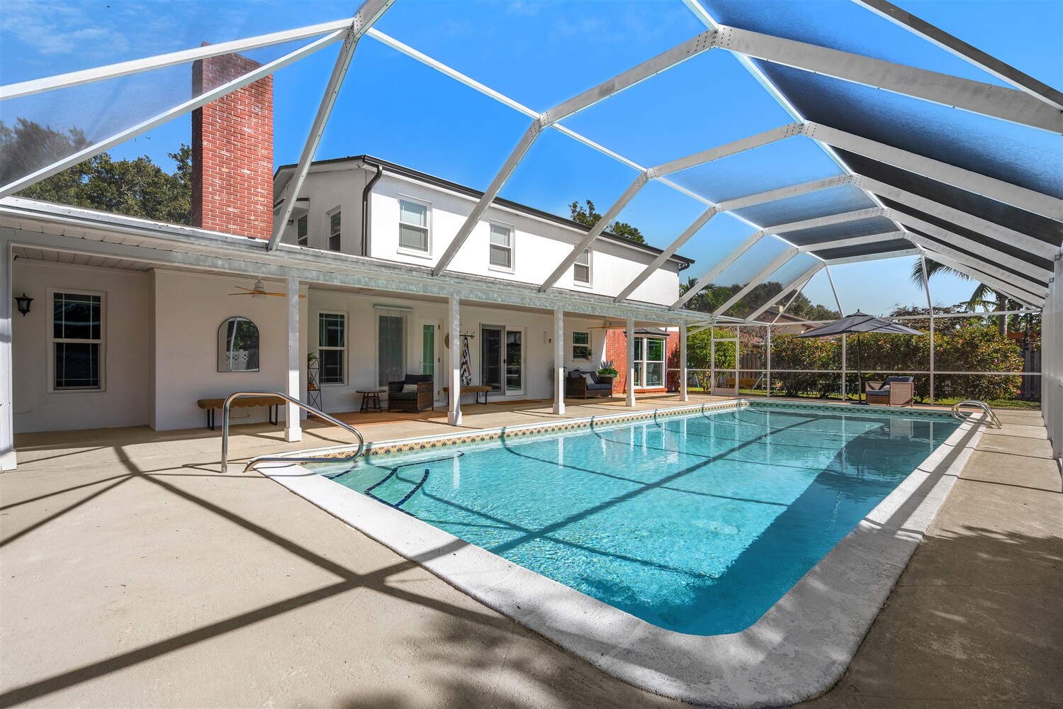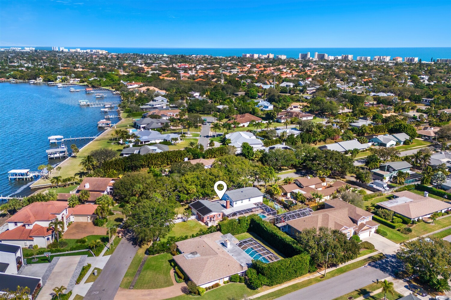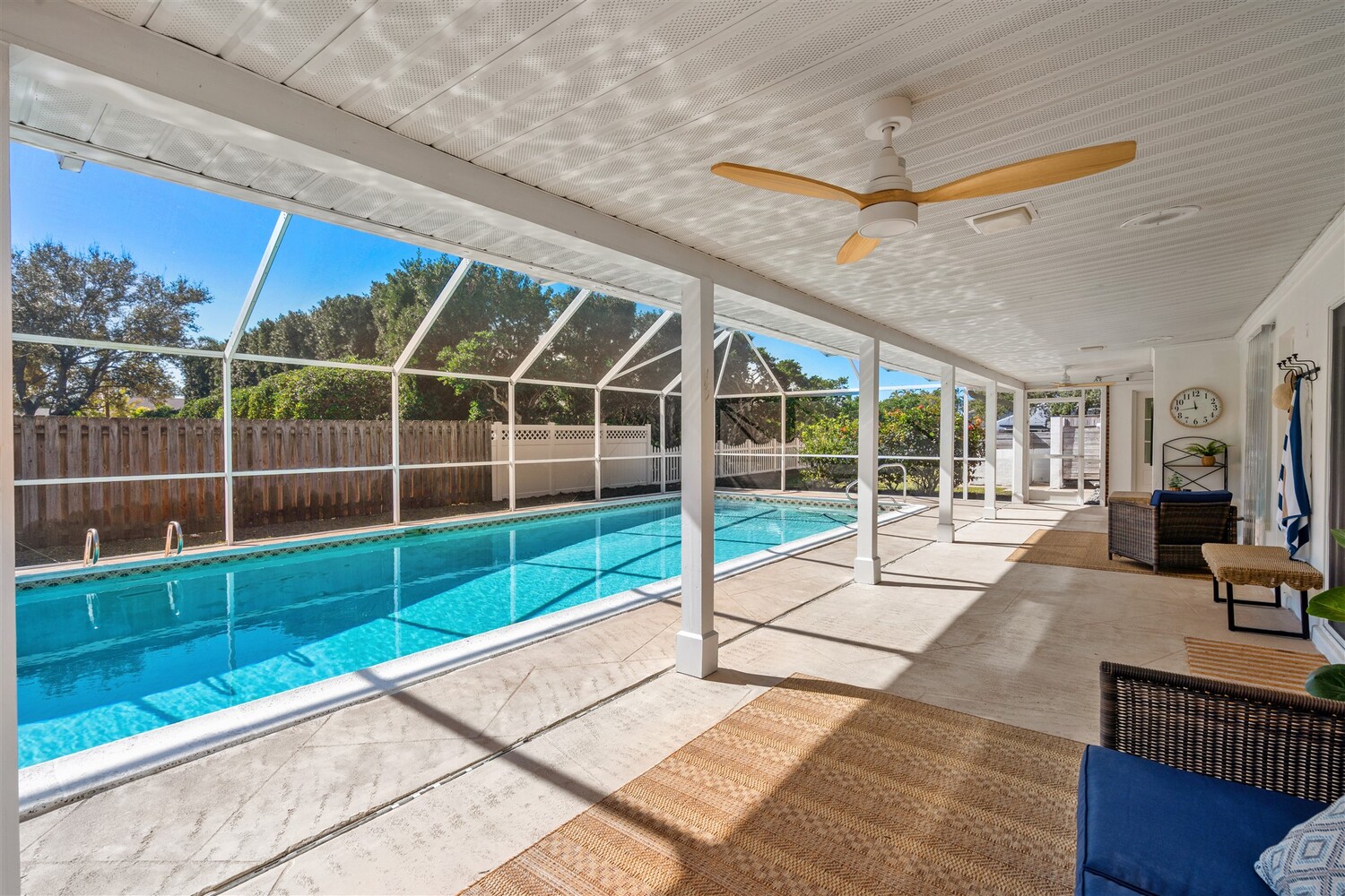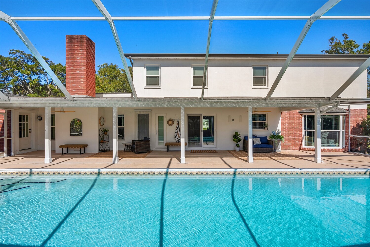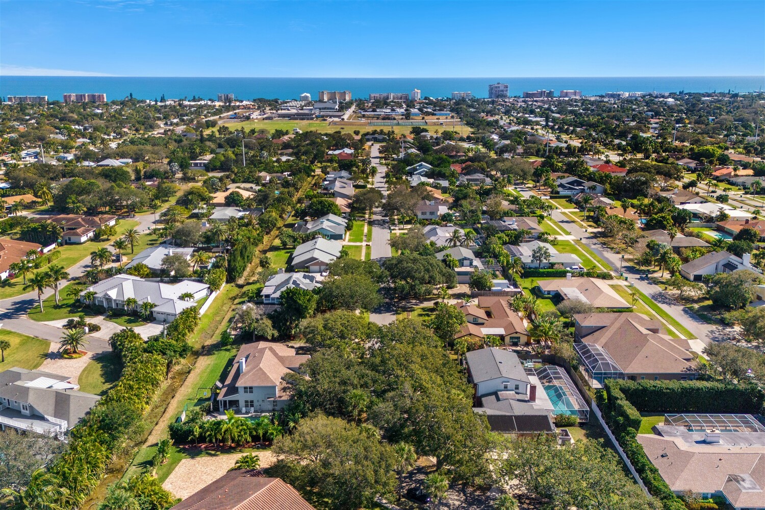 Remodeled in 2025 with impact windows, new 1st floor owner's suite, roof new in 2020, acs 2021 and 2025! Enjoy crisp river breezes in Indialantic in this gorgeous traditional concrete block house featuring 4 beds and 4 baths (2 owner suites) on a large corner lot. Stately oaks grace the grounds and a circular drive allows for guest parking. Neutral plank tile throughout the first floor reflects the feeling of sand beneath your feet. The charming contemporary kitchen includes a breakfast bar, ample cabinetry, a stylish tile backsplash, and stainless steel appliances. Nearby, a spacious living and dining room offer the perfect space for entertaining, and the huge family room features a cozy fireplace. A dedicated office makes the perfect area for a WFH setup, home gym, or studio. The stunning new owners' suite on the first floor offers a spa-like bathroom with a soaking tub, frameless shower, and large walk-in closet. Step outside to find a huge, fenced backyard where you can soak up the Florida sun and lounge by the pool. Upstairs, find three additional bedrooms including a large secondary owners' suite with remodeled bath and two additional generously sized bedrooms. This house has newly installed impact windows, new A/C, and a fenced lot. There is plenty of room for a large or multigenerational family. Located close to shops, restaurants and a bike ride to the beach, this lovely house is ready for a new family.