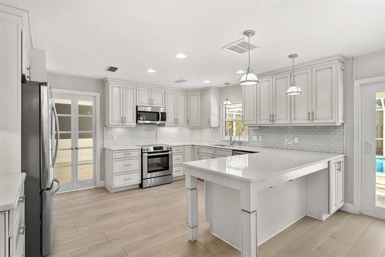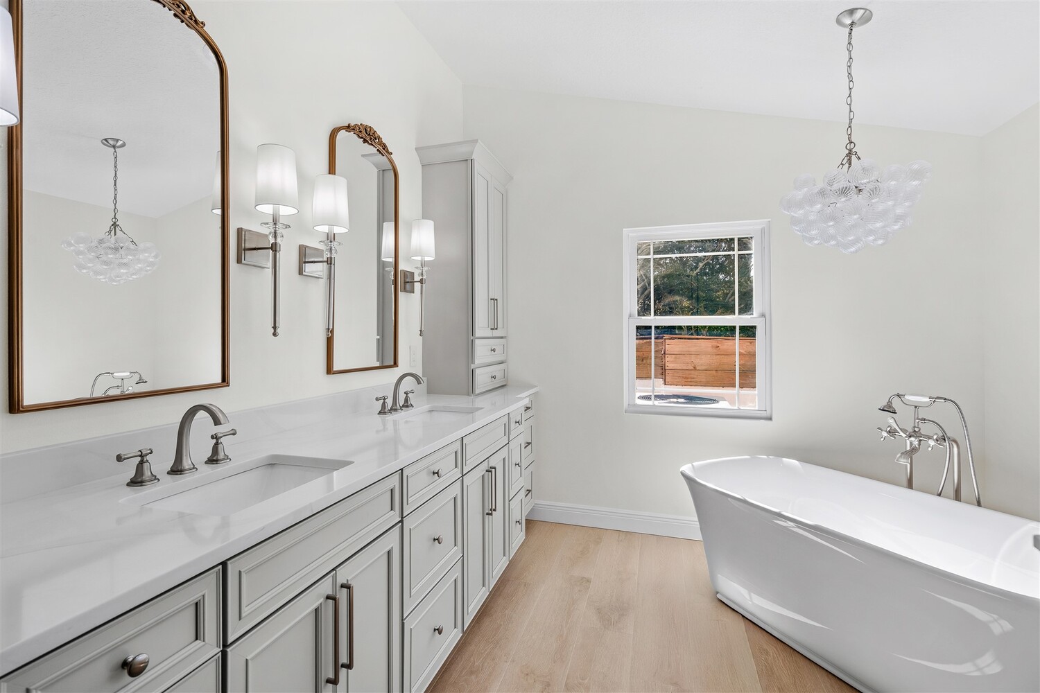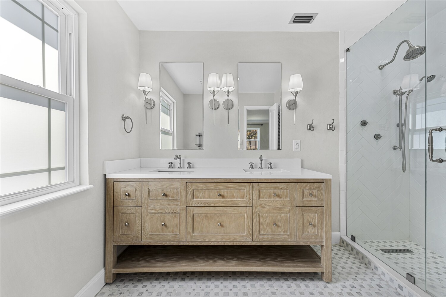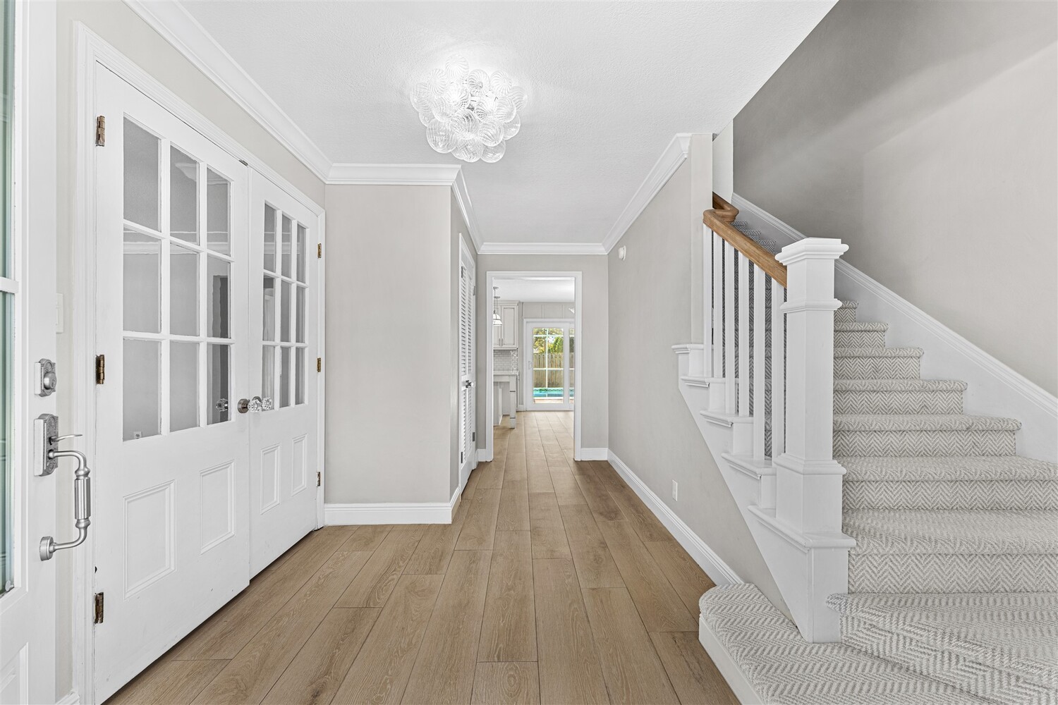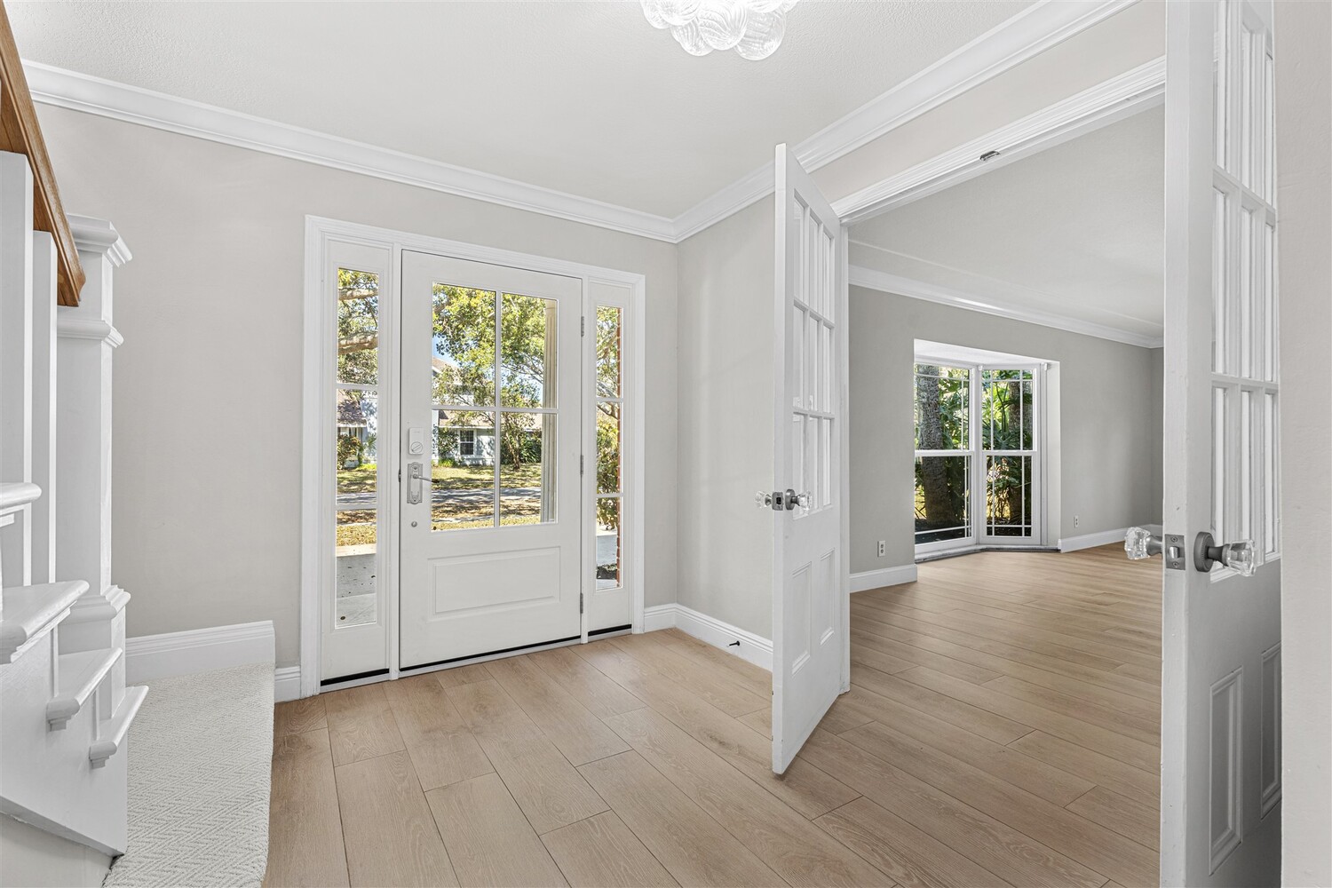 Remodeled in 2025 with impact windows, new 1st floor owner's suite, roof new in 2020, acs 2021 and 2025! Enjoy crisp river breezes in Indialantic in this gorgeous traditional concrete block house featuring 4 beds and 4 baths (2 owner suites) on a large corner lot. Stately oaks grace the grounds and a circular drive allows for guest parking. Neutral plank tile throughout the first floor reflects the feeling of sand beneath your feet. The charming contemporary kitchen includes a breakfast bar, ample cabinetry, a stylish tile backsplash, and stainless steel appliances. Nearby, a spacious living and dining room offer the perfect space for entertaining, and the huge family room features a cozy fireplace. A dedicated office makes the perfect area for a WFH setup, home gym, or studio. The stunning new owners' suite on the first floor offers a spa-like bathroom with a soaking tub, frameless shower, and large walk-in closet. Step outside to find a huge, fenced backyard where you can soak up the Florida sun and lounge by the pool. Upstairs, find three additional bedrooms including a large secondary owners' suite with remodeled bath and two additional generously sized bedrooms. This house has newly installed impact windows, new A/C, and a fenced lot. There is plenty of room for a large or multigenerational family. Located close to shops, restaurants and a bike ride to the beach, this lovely house is ready for a new family.