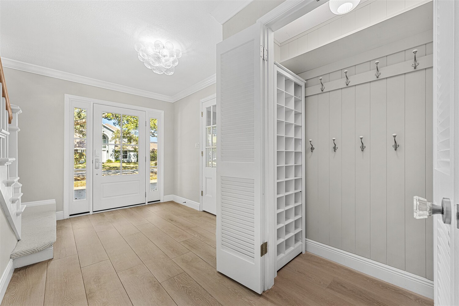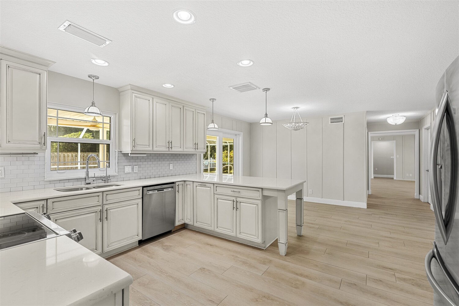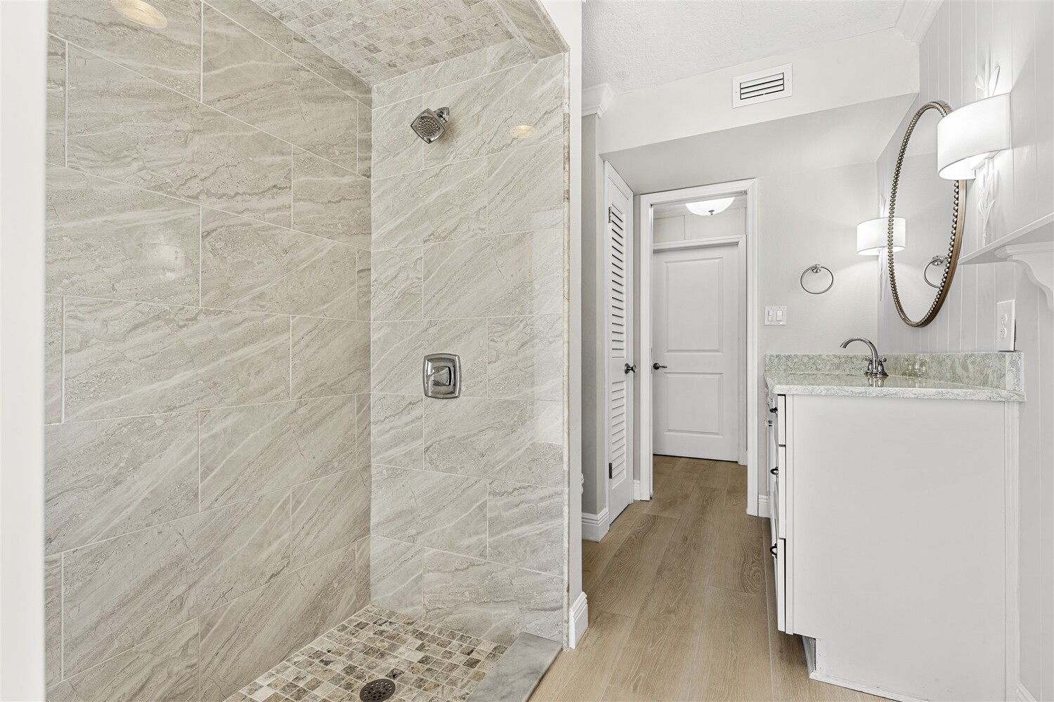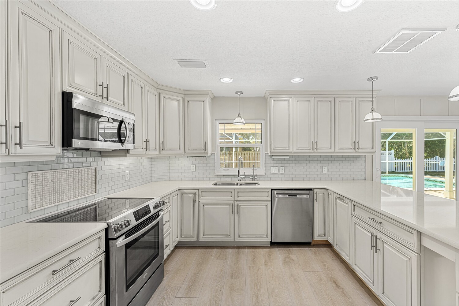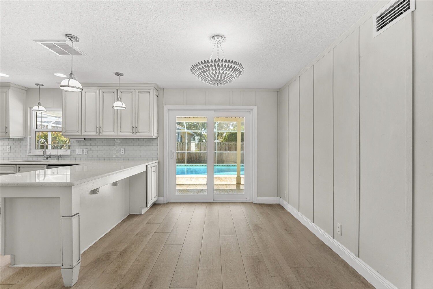 Remodeled in 2025 with impact windows, new 1st floor owner's suite, roof new in 2020, acs 2021 and 2025! Enjoy crisp river breezes in Indialantic in this gorgeous traditional concrete block house featuring 4 beds and 4 baths (2 owner suites) on a large corner lot. Stately oaks grace the grounds and a circular drive allows for guest parking. Neutral plank tile throughout the first floor reflects the feeling of sand beneath your feet. The charming contemporary kitchen includes a breakfast bar, ample cabinetry, a stylish tile backsplash, and stainless steel appliances. Nearby, a spacious living and dining room offer the perfect space for entertaining, and the huge family room features a cozy fireplace. A dedicated office makes the perfect area for a WFH setup, home gym, or studio. The stunning new owners' suite on the first floor offers a spa-like bathroom with a soaking tub, frameless shower, and large walk-in closet. Step outside to find a huge, fenced backyard where you can soak up the Florida sun and lounge by the pool. Upstairs, find three additional bedrooms including a large secondary owners' suite with remodeled bath and two additional generously sized bedrooms. This house has newly installed impact windows, new A/C, and a fenced lot. There is plenty of room for a large or multigenerational family. Located close to shops, restaurants and a bike ride to the beach, this lovely house is ready for a new family.