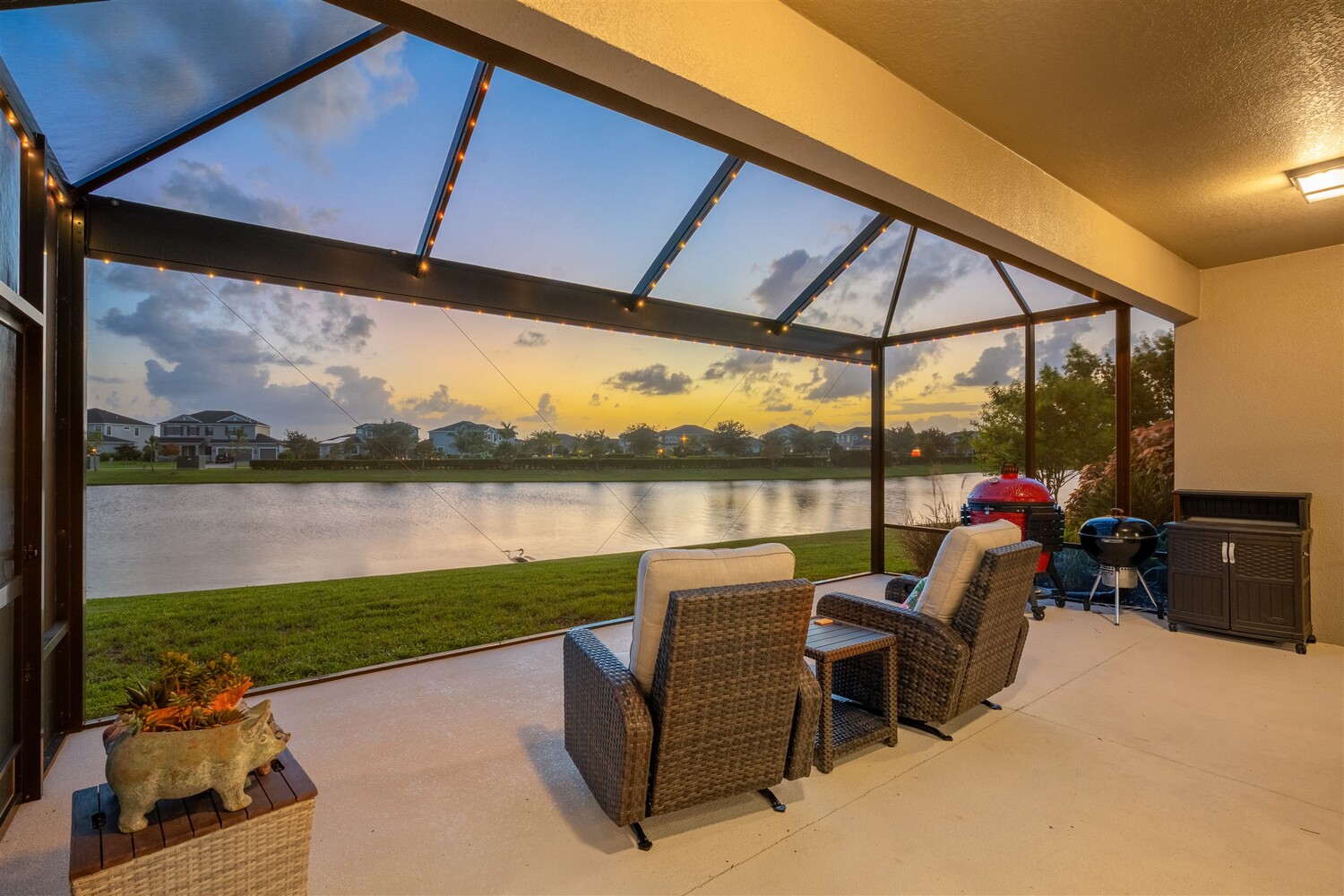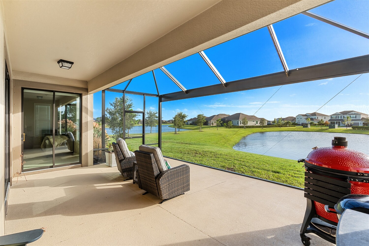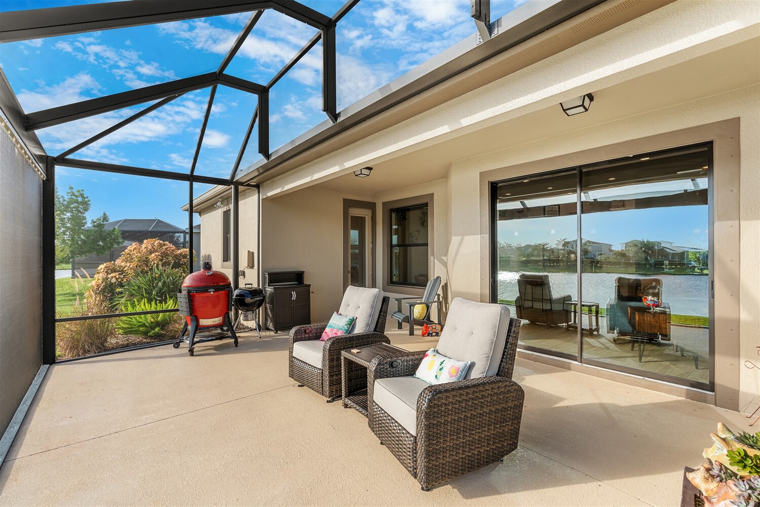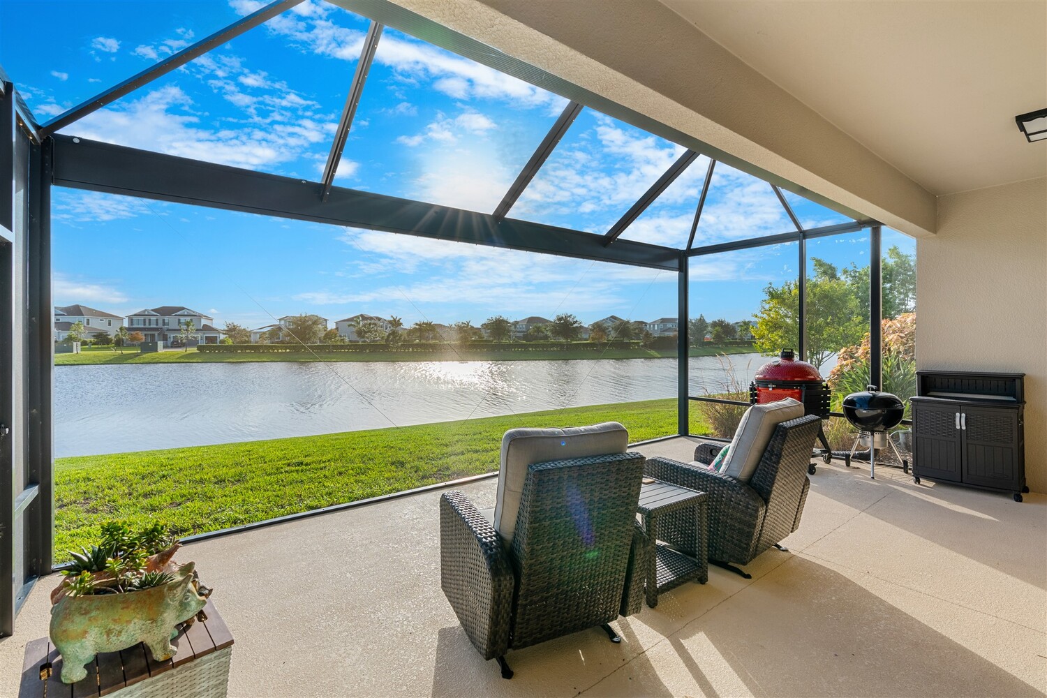 Enjoy gorgeous lakefront views in this meticulously maintained contemporary CBS home in the sought-after gated community of Stonecrest at Viera. Located on one of the larger lots in the neighborhood, this house boasts 117 ft of waterfront. Decorating for the seasons is as easy as pushing a button with the exterior custom lighting system. A glass-door entryway welcomes you into the open floorplan, with a formal dining room and flex/bonus room to either side of the foyer. Natural light from large double pane windows guide you through to the kitchen, great room, and breakfast nook. At the heart of the home, the light and bright kitchen offers stainless steel appliances, a vented hood, gas range, convention oven, a breakfast bar and pantry. Move through the 8 ft. sliders to the extended screened patio and take in the sparkling lake views while cooking on the grill. The expansive primary bedroom with its own sitting area includes a spacious ensuite with dual vanities, a soaking tub and a glass and tile shower. Three additional bedrooms offer space and functionality for a growing family, visitors, or even a studio workspace. Garage is oversized and can accommodate a golf cart plus 2 vehicles. The exclusive gated community of Stonecrest offers walking trails, sports courts, and access to Addison Village Club, and keeps you close to the very best restaurants, shopping, and entertainment that Brevard has to offer.
