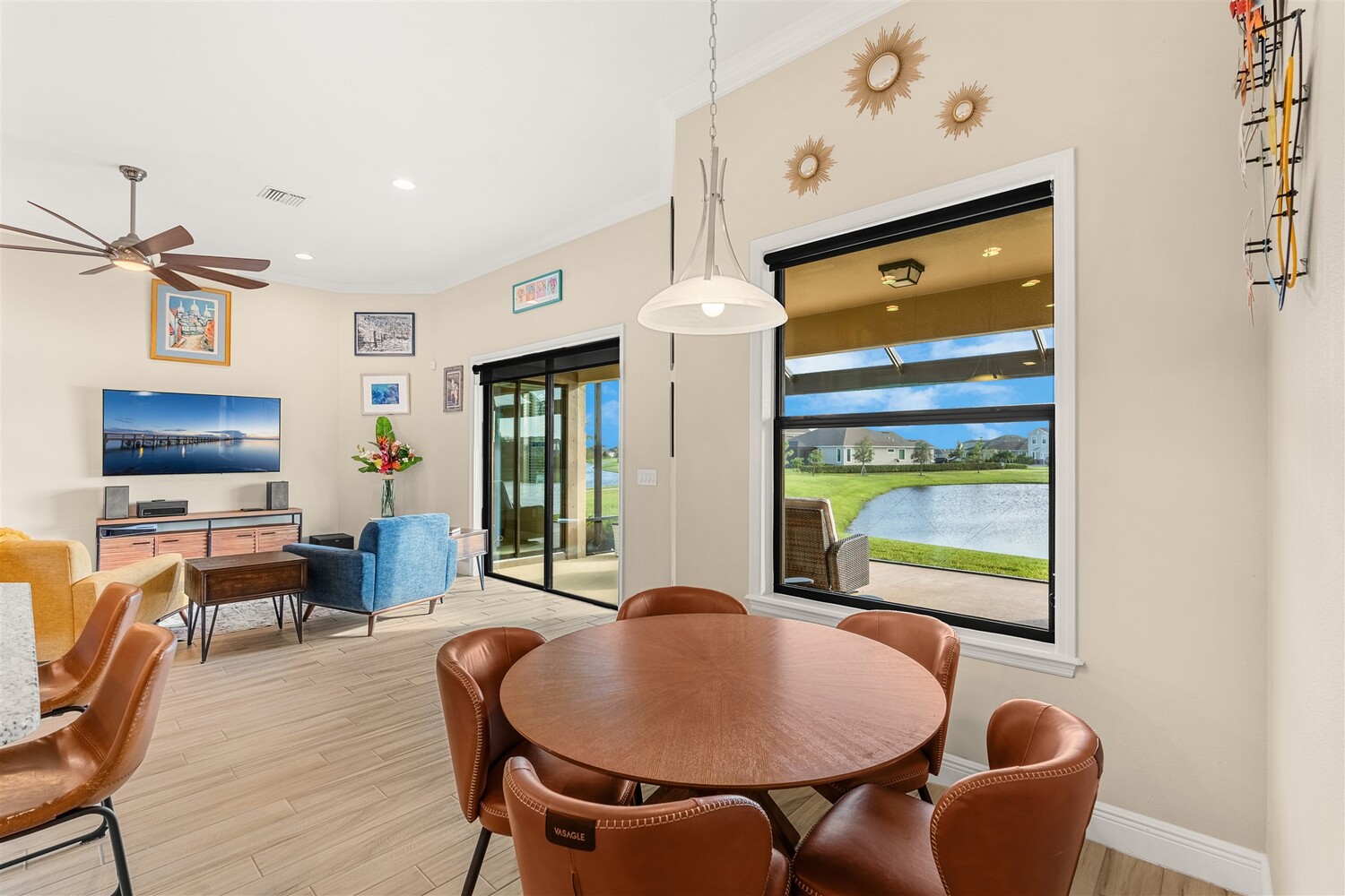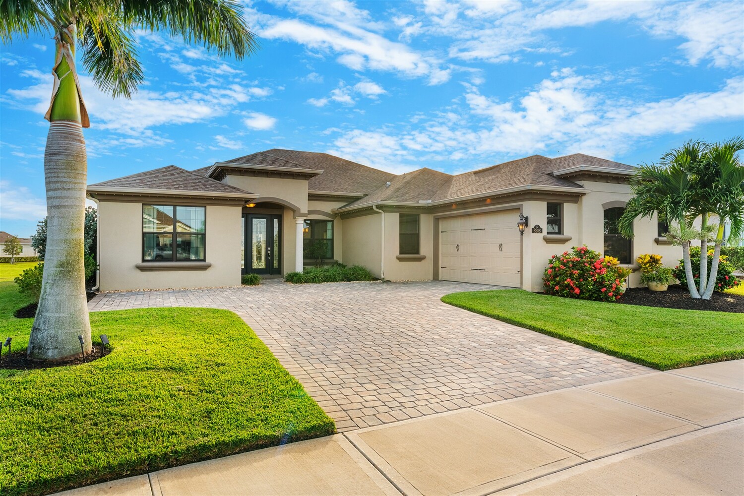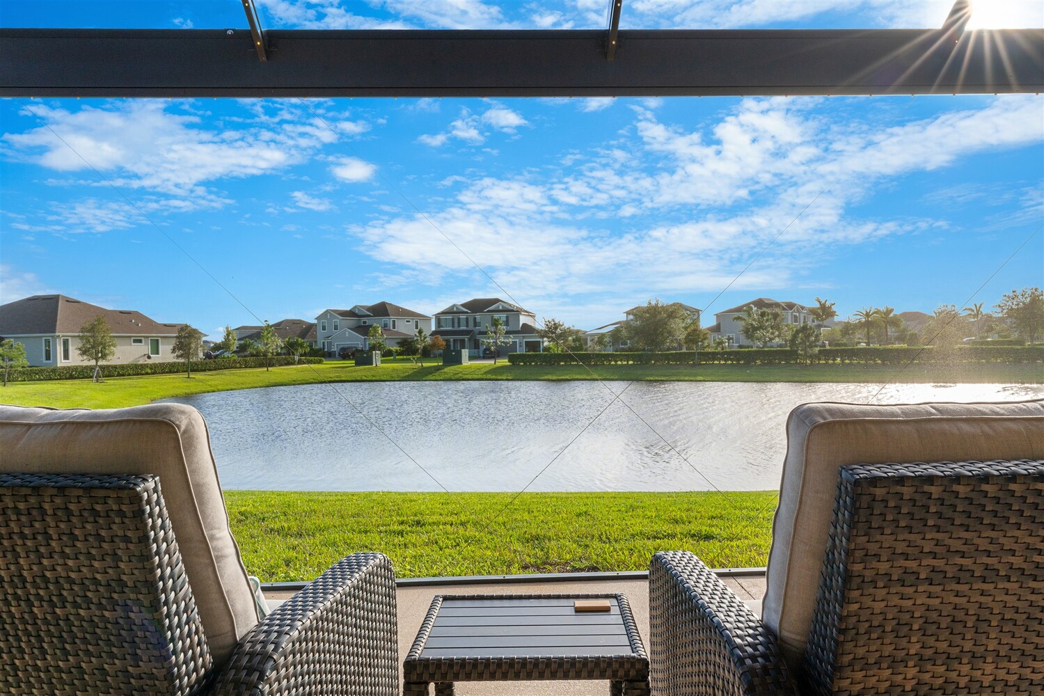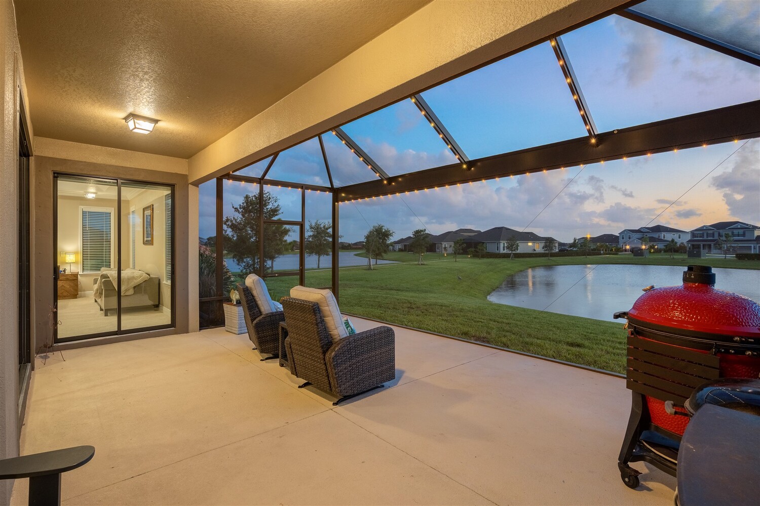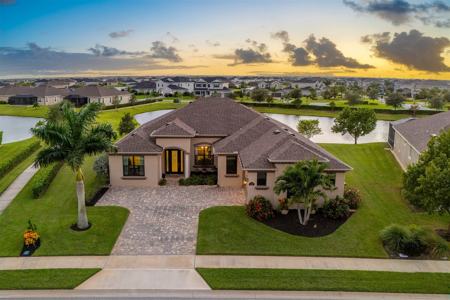 Enjoy gorgeous lakefront views in this meticulously maintained contemporary CBS home in the sought-after gated community of Stonecrest at Viera. Located on one of the larger lots in the neighborhood, this house boasts 117 ft of waterfront. Decorating for the seasons is as easy as pushing a button with the exterior custom lighting system. A glass-door entryway welcomes you into the open floorplan, with a formal dining room and flex/bonus room to either side of the foyer. Natural light from large double pane windows guide you through to the kitchen, great room, and breakfast nook. At the heart of the home, the light and bright kitchen offers stainless steel appliances, a vented hood, gas range, convention oven, a breakfast bar and pantry. Move through the 8 ft. sliders to the extended screened patio and take in the sparkling lake views while cooking on the grill. The expansive primary bedroom with its own sitting area includes a spacious ensuite with dual vanities, a soaking tub and a glass and tile shower. Three additional bedrooms offer space and functionality for a growing family, visitors, or even a studio workspace. Garage is oversized and can accommodate a golf cart plus 2 vehicles. The exclusive gated community of Stonecrest offers walking trails, sports courts, and access to Addison Village Club, and keeps you close to the very best restaurants, shopping, and entertainment that Brevard has to offer.