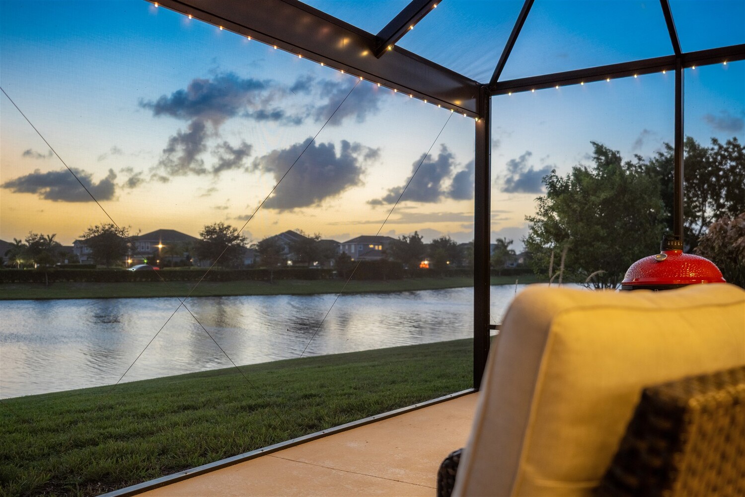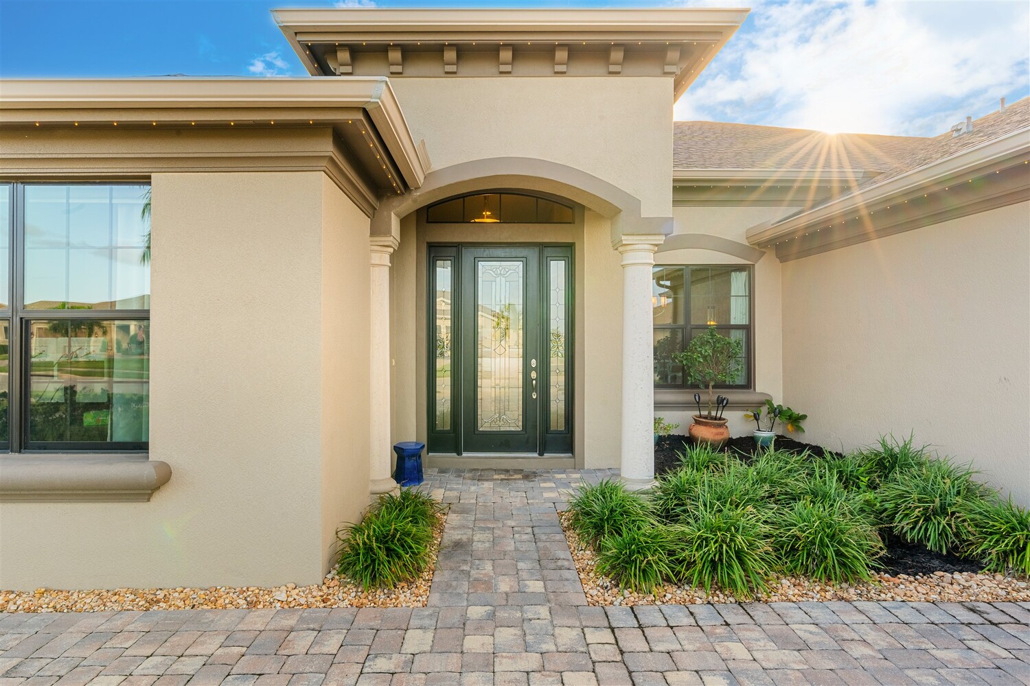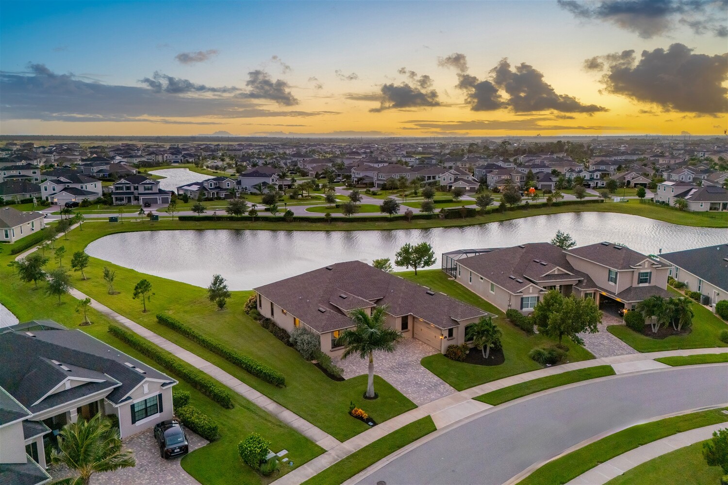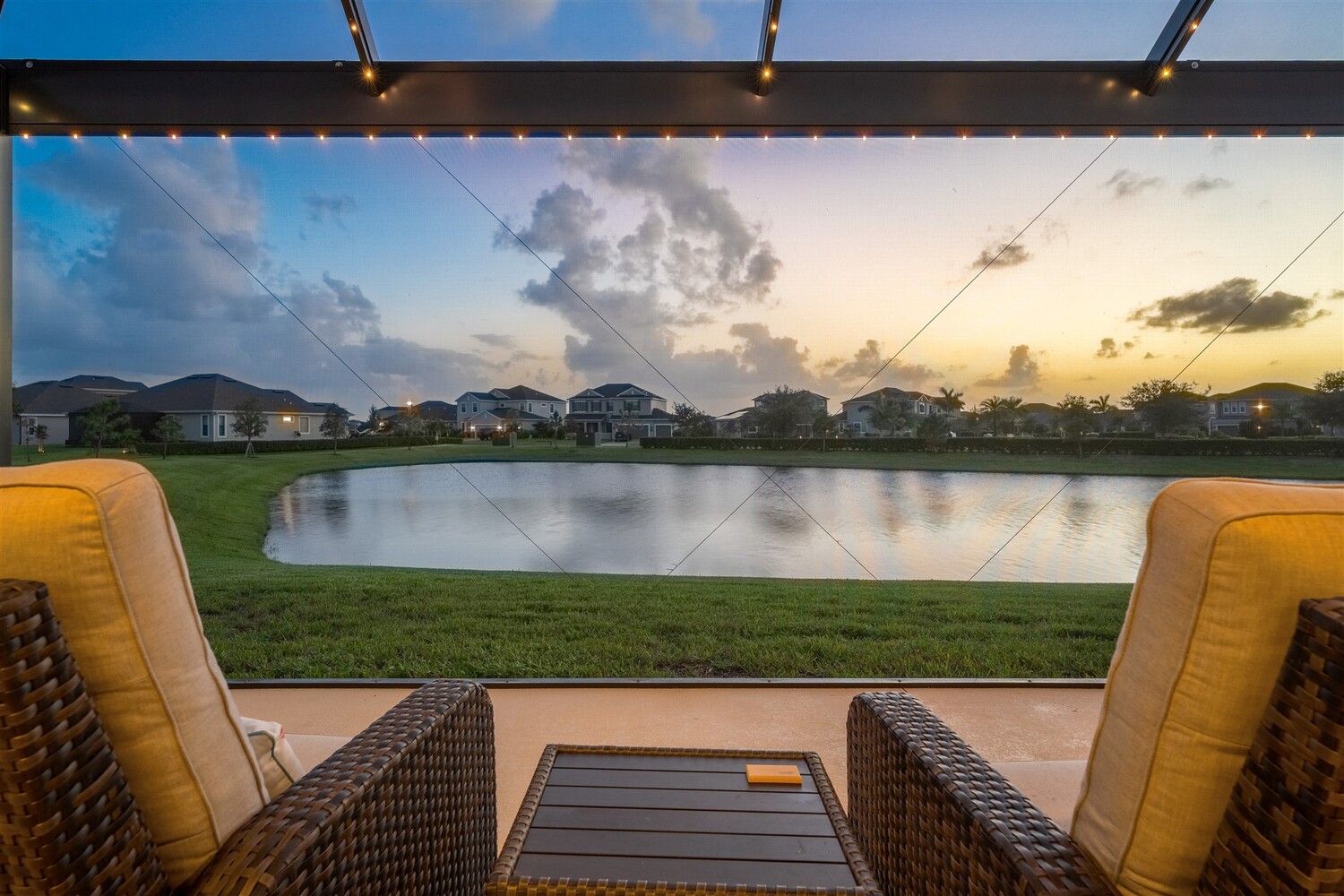 Enjoy gorgeous lakefront views in this meticulously maintained contemporary CBS home in the sought-after gated community of Stonecrest at Viera. Located on one of the larger lots in the neighborhood, this house boasts 117 ft of waterfront. Decorating for the seasons is as easy as pushing a button with the exterior custom lighting system. A glass-door entryway welcomes you into the open floorplan, with a formal dining room and flex/bonus room to either side of the foyer. Natural light from large double pane windows guide you through to the kitchen, great room, and breakfast nook. At the heart of the home, the light and bright kitchen offers stainless steel appliances, a vented hood, gas range, convention oven, a breakfast bar and pantry. Move through the 8 ft. sliders to the extended screened patio and take in the sparkling lake views while cooking on the grill. The expansive primary bedroom with its own sitting area includes a spacious ensuite with dual vanities, a soaking tub and a glass and tile shower. Three additional bedrooms offer space and functionality for a growing family, visitors, or even a studio workspace. Garage is oversized and can accommodate a golf cart plus 2 vehicles. The exclusive gated community of Stonecrest offers walking trails, sports courts, and access to Addison Village Club, and keeps you close to the very best restaurants, shopping, and entertainment that Brevard has to offer.