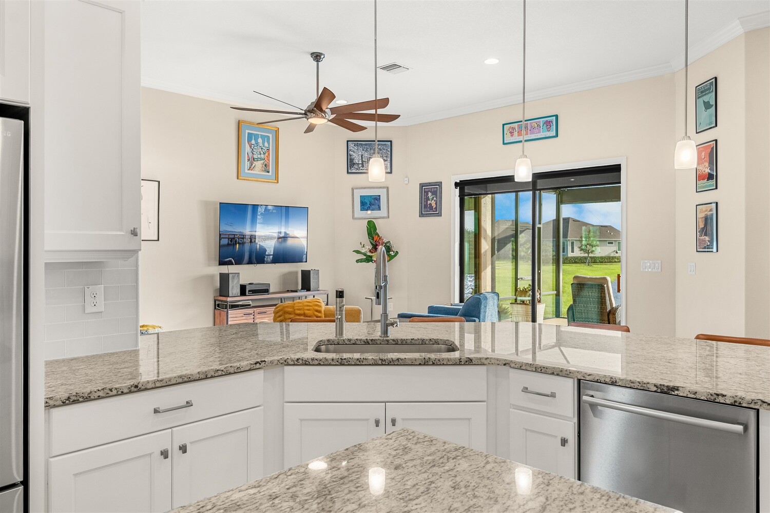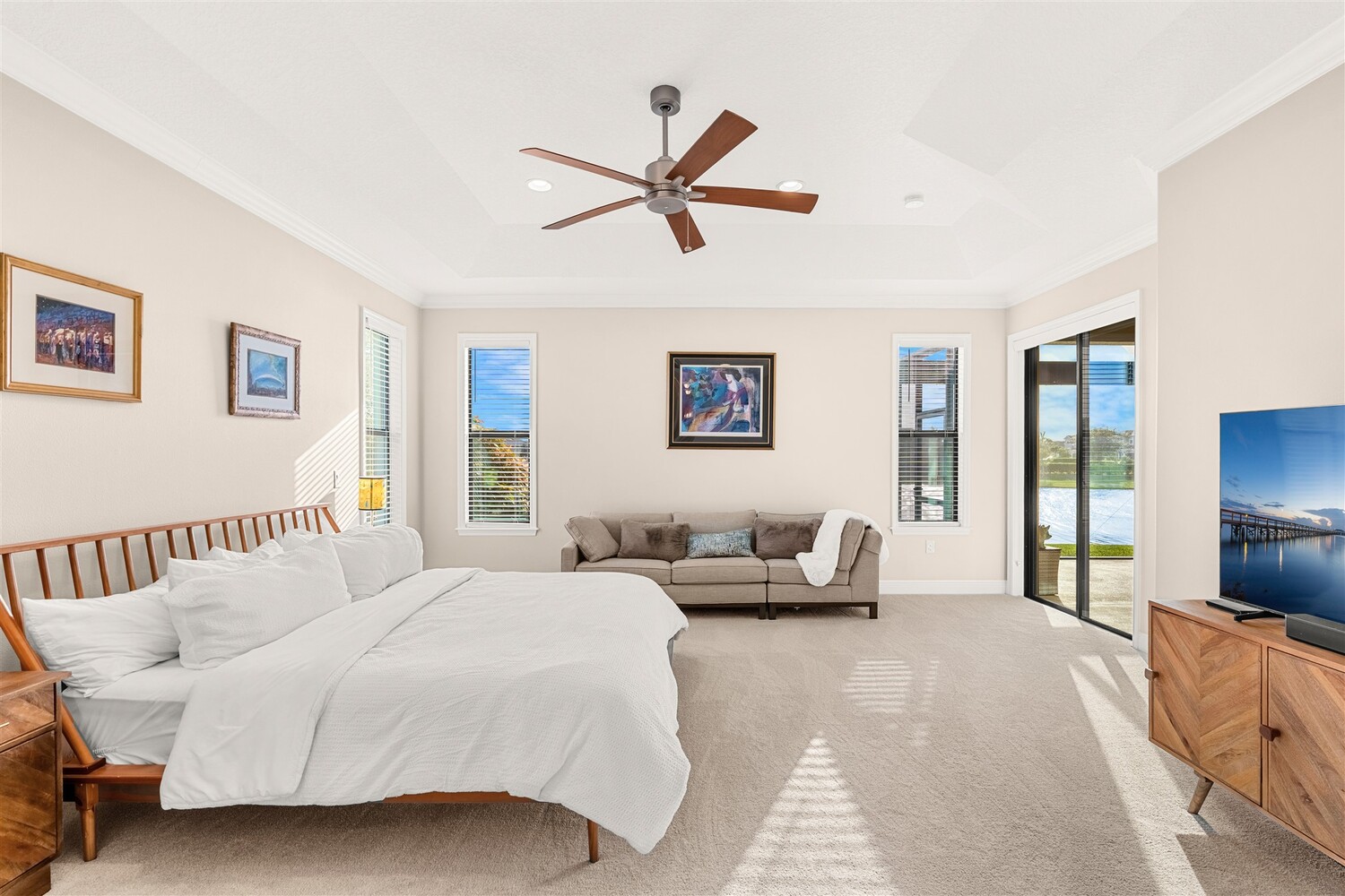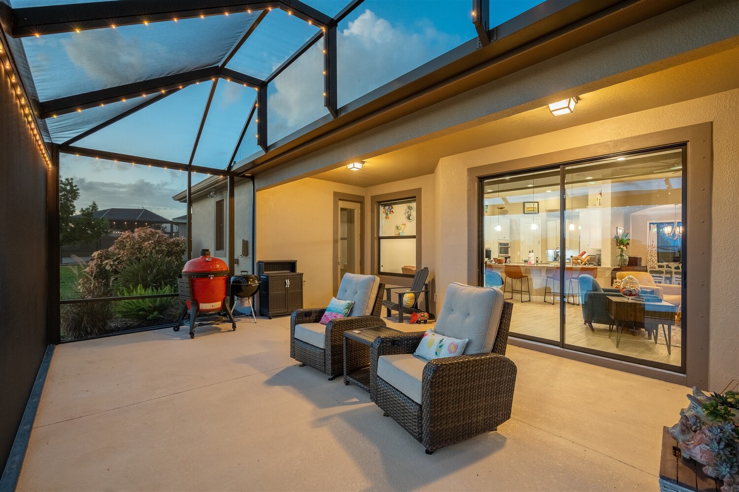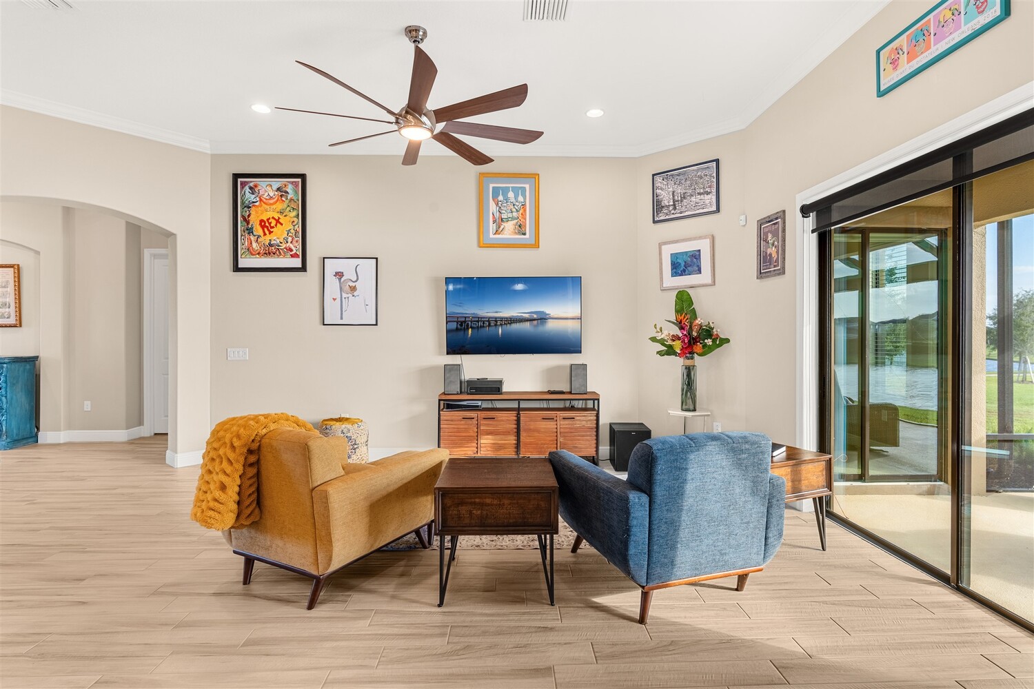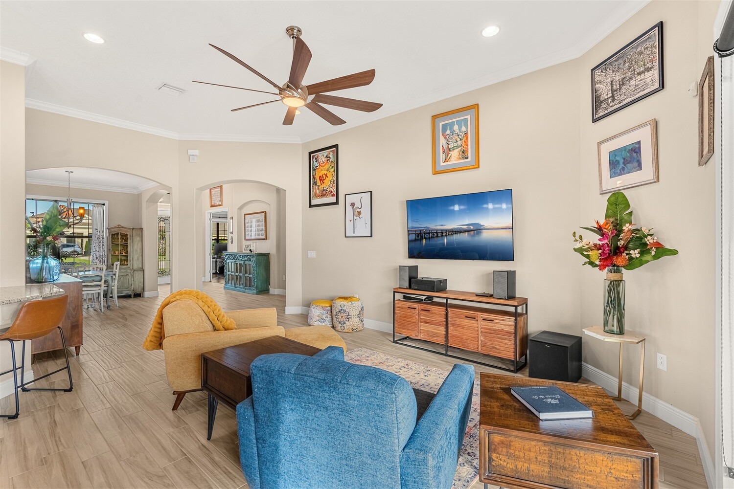 Enjoy gorgeous lakefront views in this meticulously maintained contemporary CBS home in the sought-after gated community of Stonecrest at Viera. Located on one of the larger lots in the neighborhood, this house boasts 117 ft of waterfront. Decorating for the seasons is as easy as pushing a button with the exterior custom lighting system. A glass-door entryway welcomes you into the open floorplan, with a formal dining room and flex/bonus room to either side of the foyer. Natural light from large double pane windows guide you through to the kitchen, great room, and breakfast nook. At the heart of the home, the light and bright kitchen offers stainless steel appliances, a vented hood, gas range, convention oven, a breakfast bar and pantry. Move through the 8 ft. sliders to the extended screened patio and take in the sparkling lake views while cooking on the grill. The expansive primary bedroom with its own sitting area includes a spacious ensuite with dual vanities, a soaking tub and a glass and tile shower. Three additional bedrooms offer space and functionality for a growing family, visitors, or even a studio workspace. Garage is oversized and can accommodate a golf cart plus 2 vehicles. The exclusive gated community of Stonecrest offers walking trails, sports courts, and access to Addison Village Club, and keeps you close to the very best restaurants, shopping, and entertainment that Brevard has to offer.