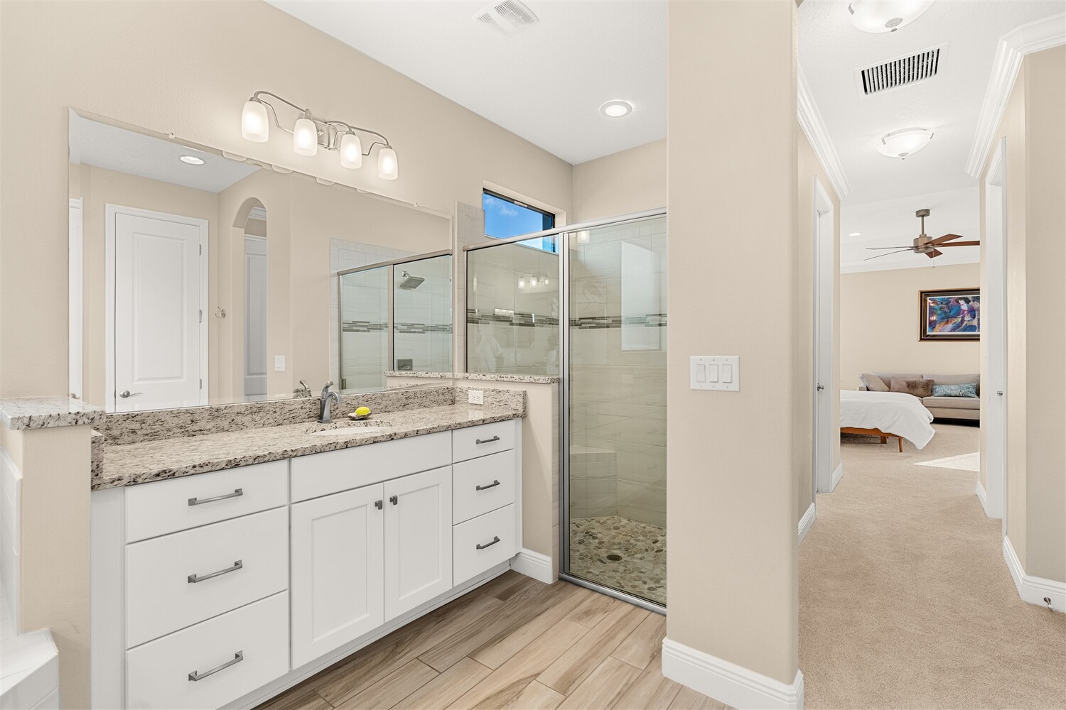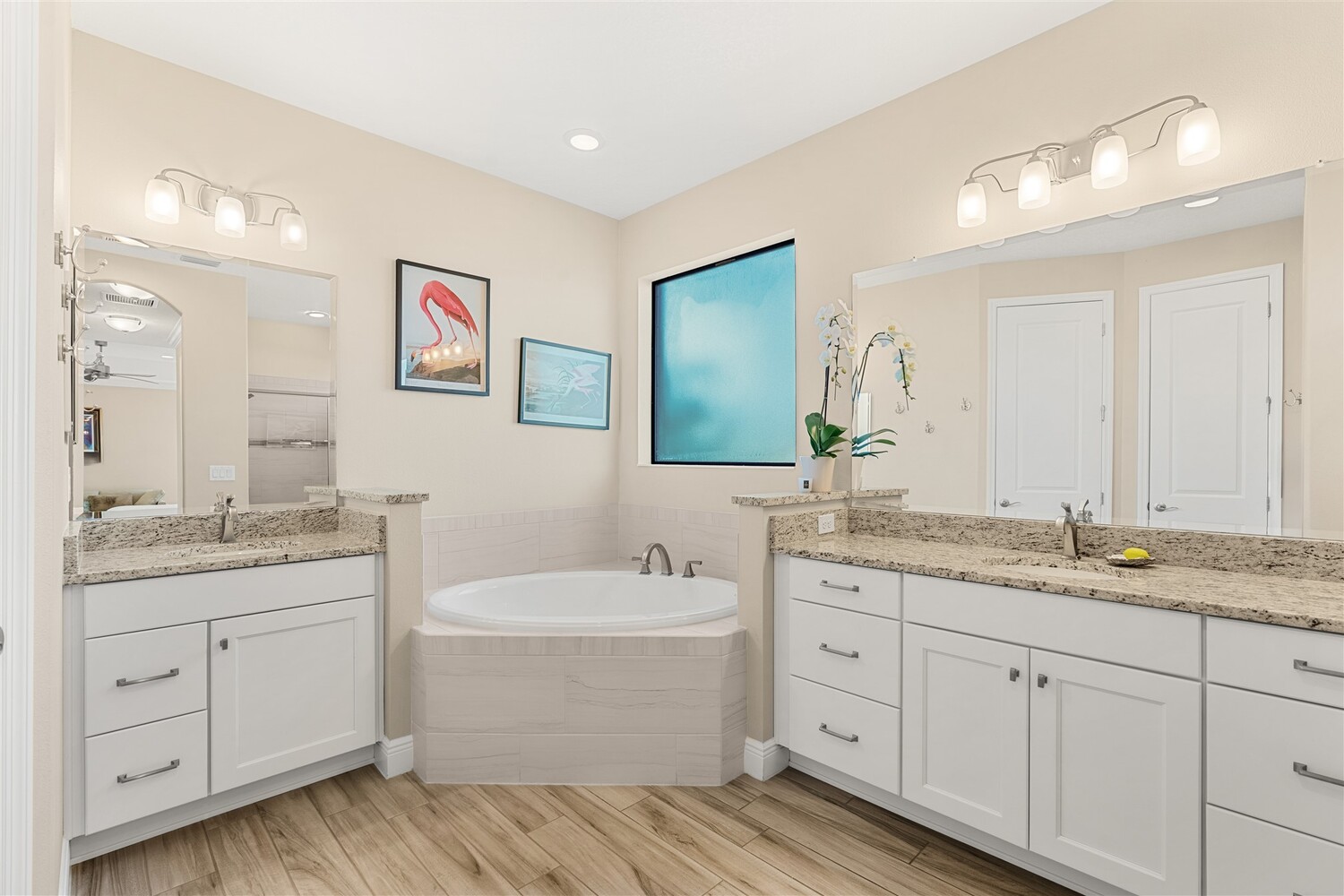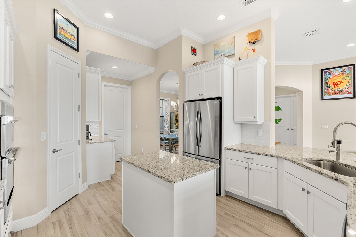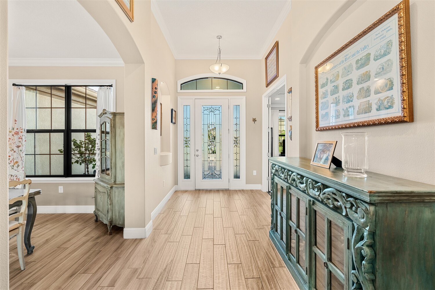 Enjoy gorgeous lakefront views in this meticulously maintained contemporary CBS home in the sought-after gated community of Stonecrest at Viera. Located on one of the larger lots in the neighborhood, this house boasts 117 ft of waterfront. Decorating for the seasons is as easy as pushing a button with the exterior custom lighting system. A glass-door entryway welcomes you into the open floorplan, with a formal dining room and flex/bonus room to either side of the foyer. Natural light from large double pane windows guide you through to the kitchen, great room, and breakfast nook. At the heart of the home, the light and bright kitchen offers stainless steel appliances, a vented hood, gas range, convention oven, a breakfast bar and pantry. Move through the 8 ft. sliders to the extended screened patio and take in the sparkling lake views while cooking on the grill. The expansive primary bedroom with its own sitting area includes a spacious ensuite with dual vanities, a soaking tub and a glass and tile shower. Three additional bedrooms offer space and functionality for a growing family, visitors, or even a studio workspace. Garage is oversized and can accommodate a golf cart plus 2 vehicles. The exclusive gated community of Stonecrest offers walking trails, sports courts, and access to Addison Village Club, and keeps you close to the very best restaurants, shopping, and entertainment that Brevard has to offer.