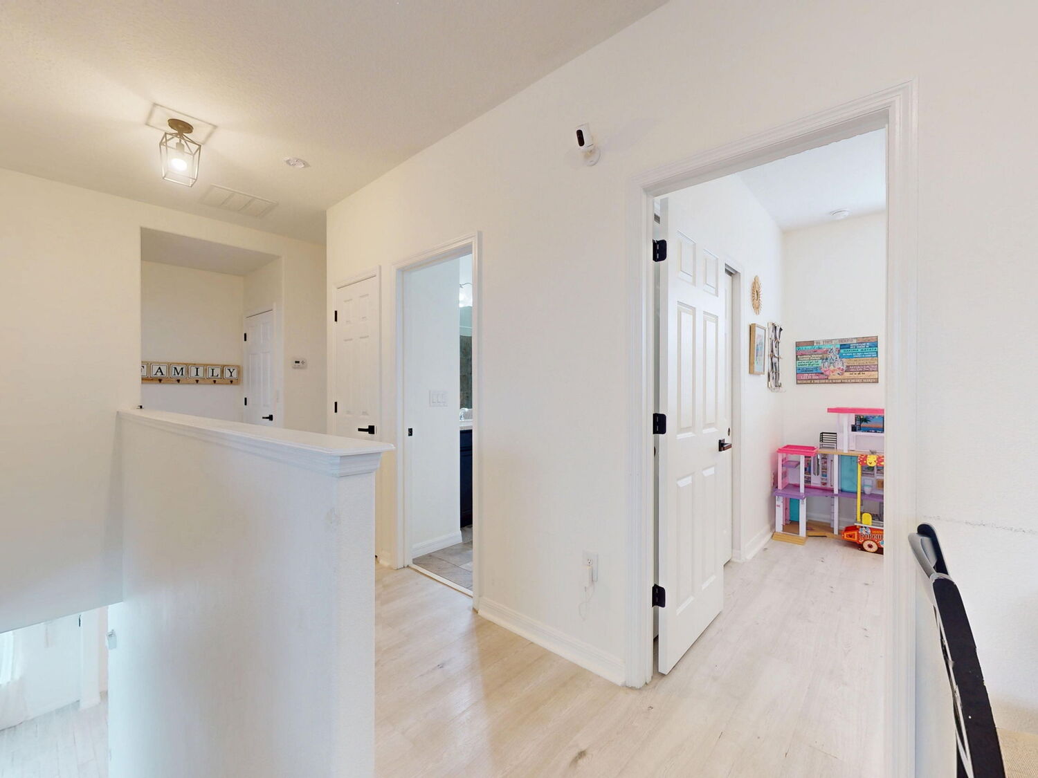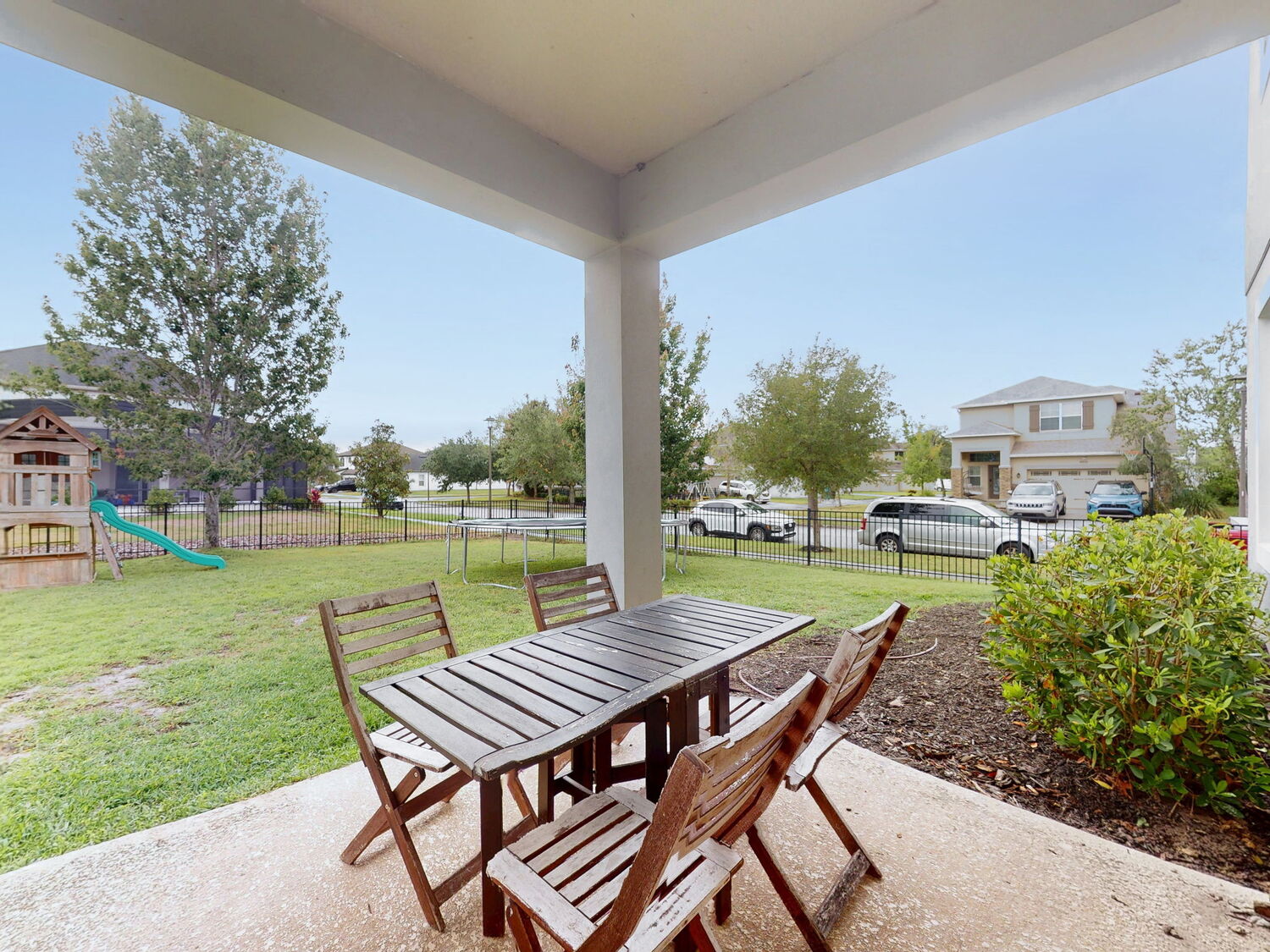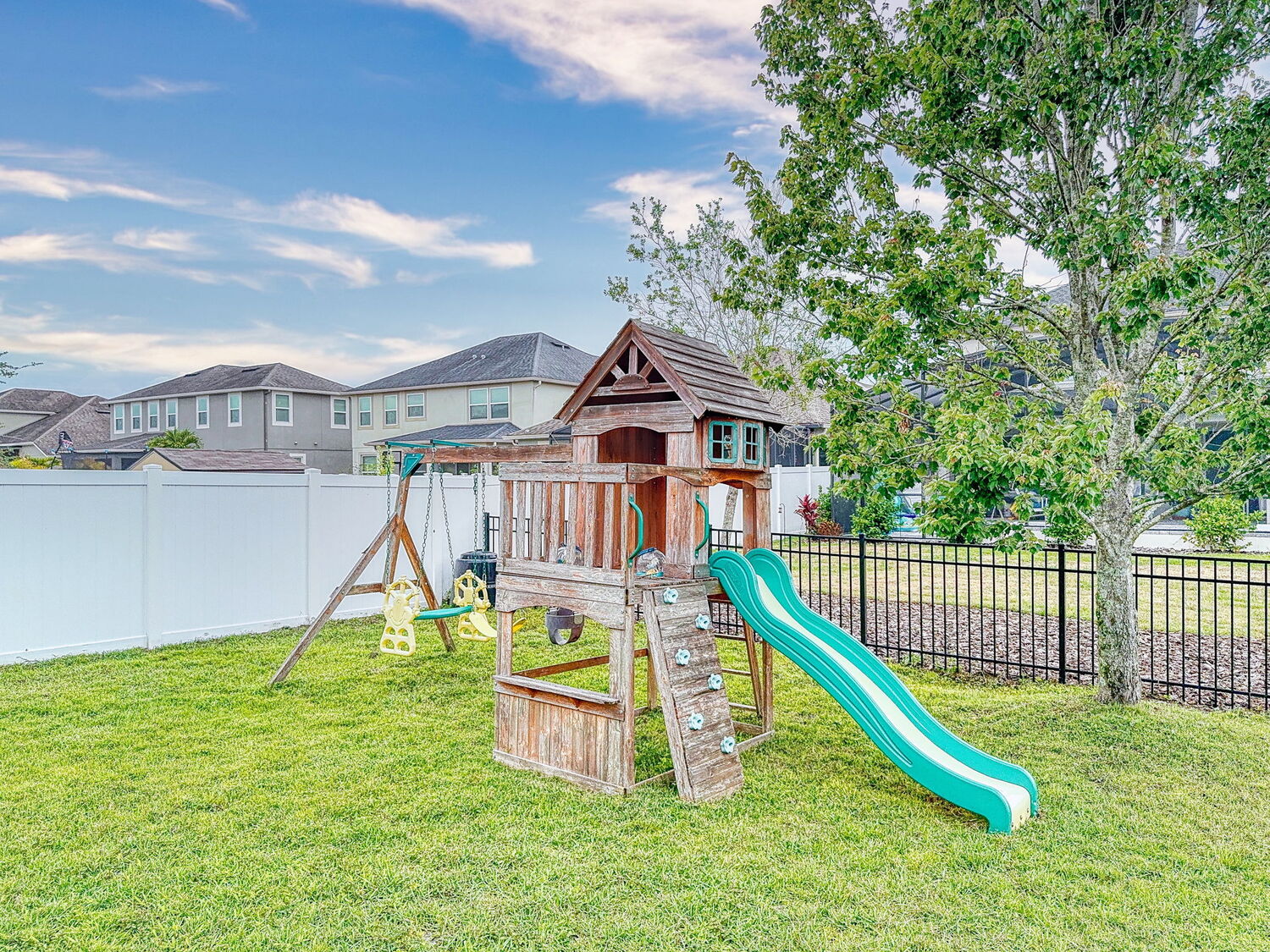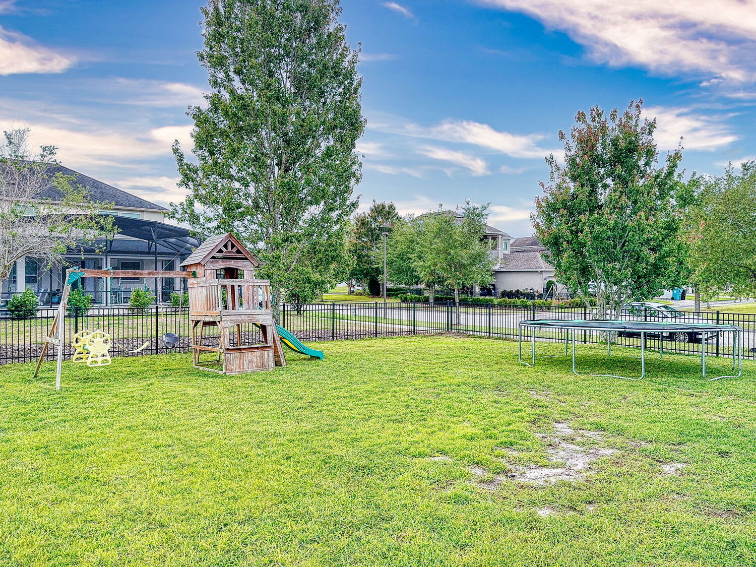 Nestled on a expansive corner lot, this exquisite two-story residence, crafted in 2015, spans an impressive 3,220 square feet of opulent living space. This architectural gem boasts four lavish bedrooms, three elegantly appointed bathrooms, and an expansive two-car garage. The interiors are adorned with luxurious vinyl plank and tile flooring, exuding timeless elegance. The state-of-the-art gourmet kitchen, resplendent with premium stainless steel appliances, offers an unrivaled setting for grand entertaining. Ascend to the upper level to discover a sprawling loft and an exclusive primary suite, a serene sanctuary of comfort. The expansive, meticulously fenced grounds provide an idyllic haven for leisure and recreation. Situated within an elite community, residents indulge in resort-caliber amenities, including a cutting-edge fitness center, a shimmering pool, and a delightful splash zone. Perfectly positioned mere moments from world-class theme parks, upscale shopping, and the airport, this home epitomizes refined living at its finest.