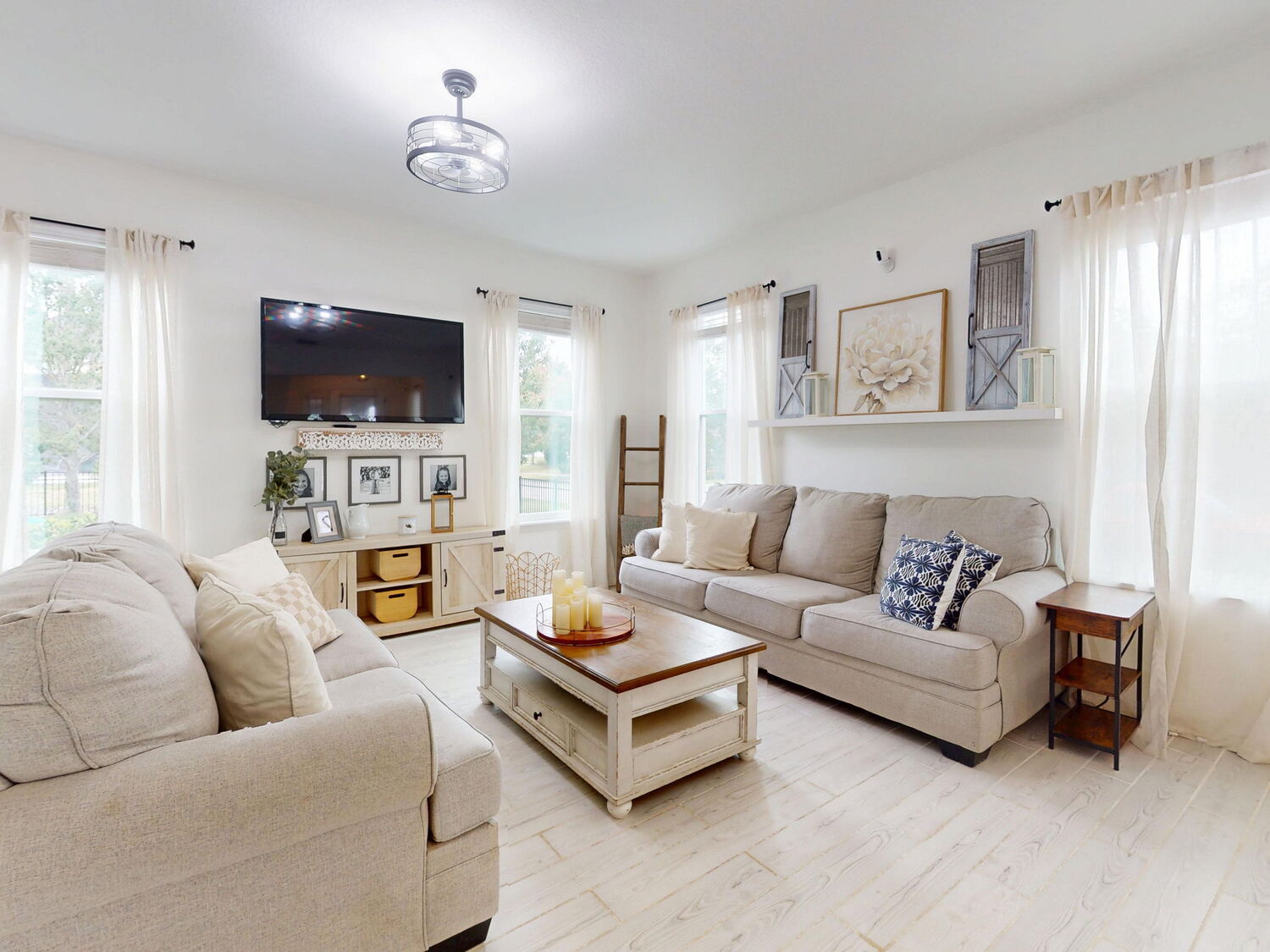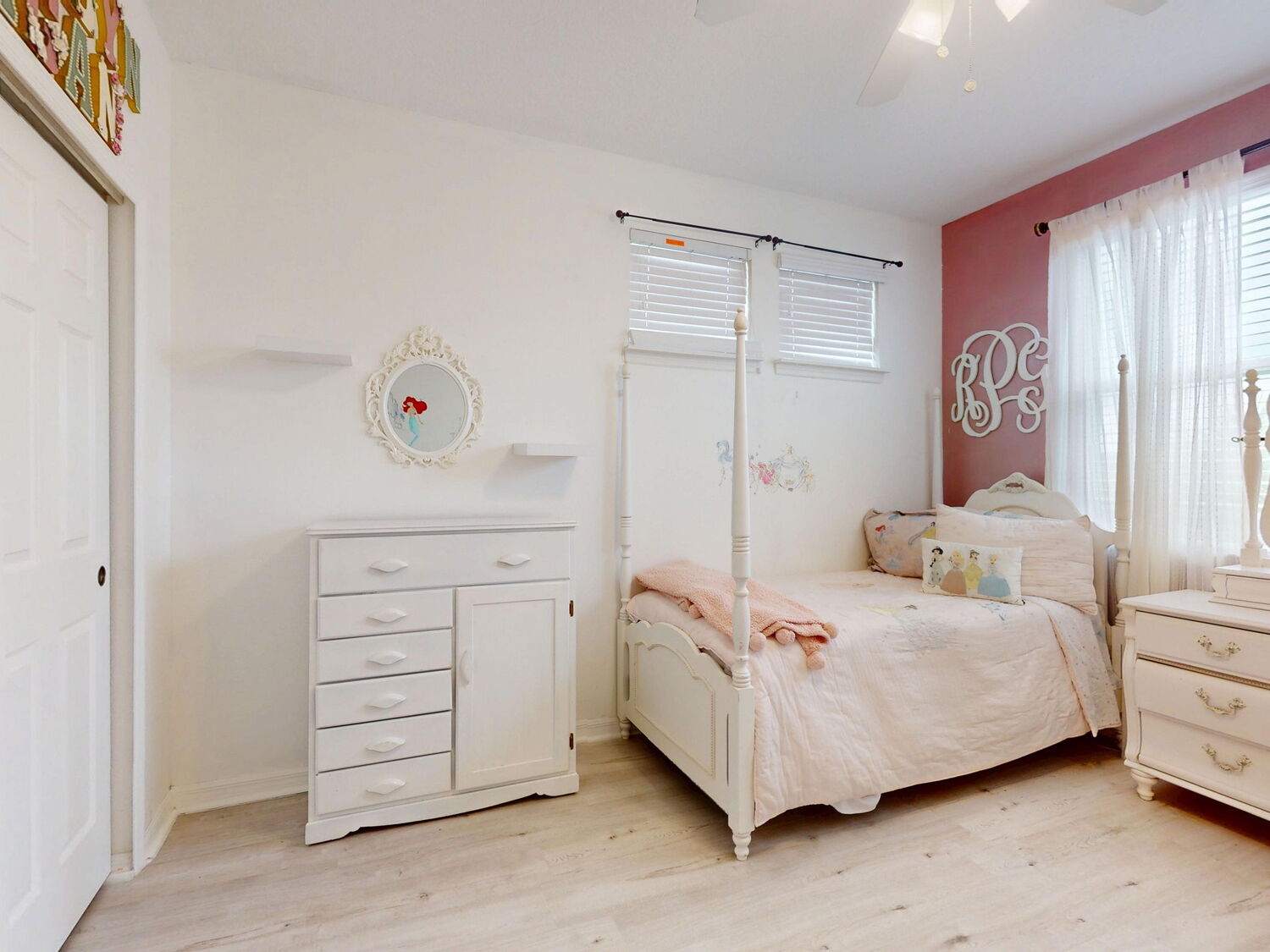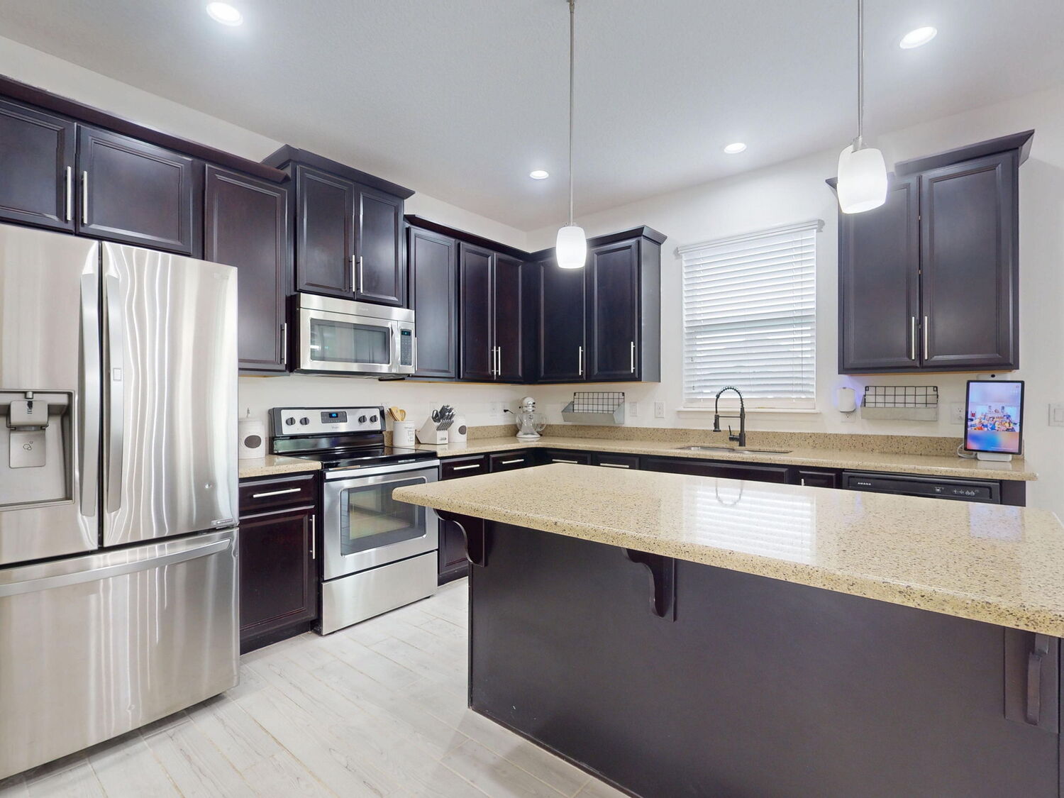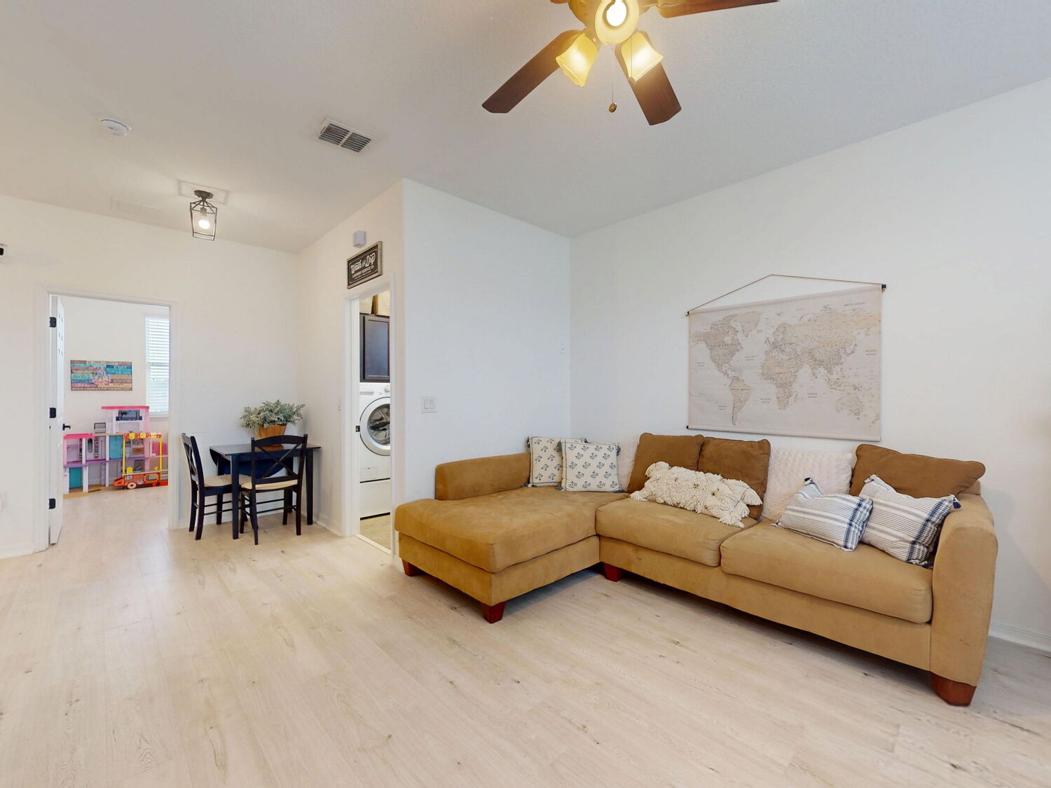 Nestled on a expansive corner lot, this exquisite two-story residence, crafted in 2015, spans an impressive 3,220 square feet of opulent living space. This architectural gem boasts four lavish bedrooms, three elegantly appointed bathrooms, and an expansive two-car garage. The interiors are adorned with luxurious vinyl plank and tile flooring, exuding timeless elegance. The state-of-the-art gourmet kitchen, resplendent with premium stainless steel appliances, offers an unrivaled setting for grand entertaining. Ascend to the upper level to discover a sprawling loft and an exclusive primary suite, a serene sanctuary of comfort. The expansive, meticulously fenced grounds provide an idyllic haven for leisure and recreation. Situated within an elite community, residents indulge in resort-caliber amenities, including a cutting-edge fitness center, a shimmering pool, and a delightful splash zone. Perfectly positioned mere moments from world-class theme parks, upscale shopping, and the airport, this home epitomizes refined living at its finest.