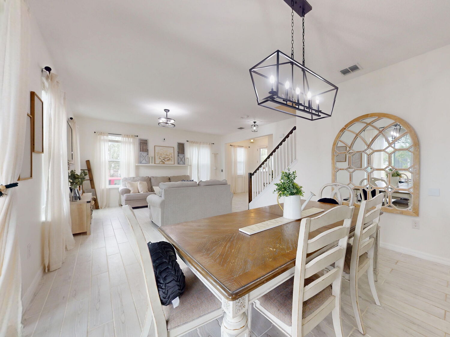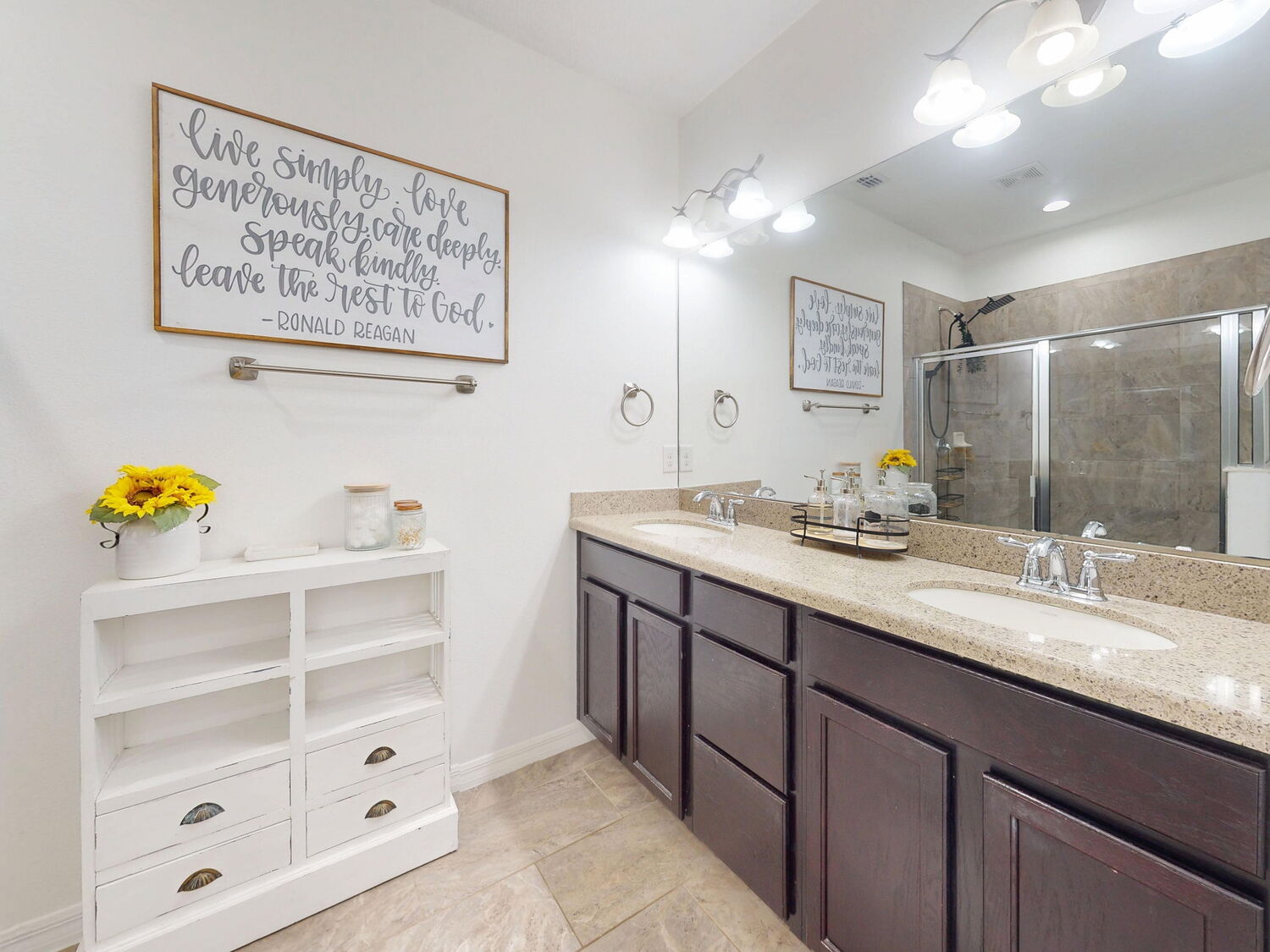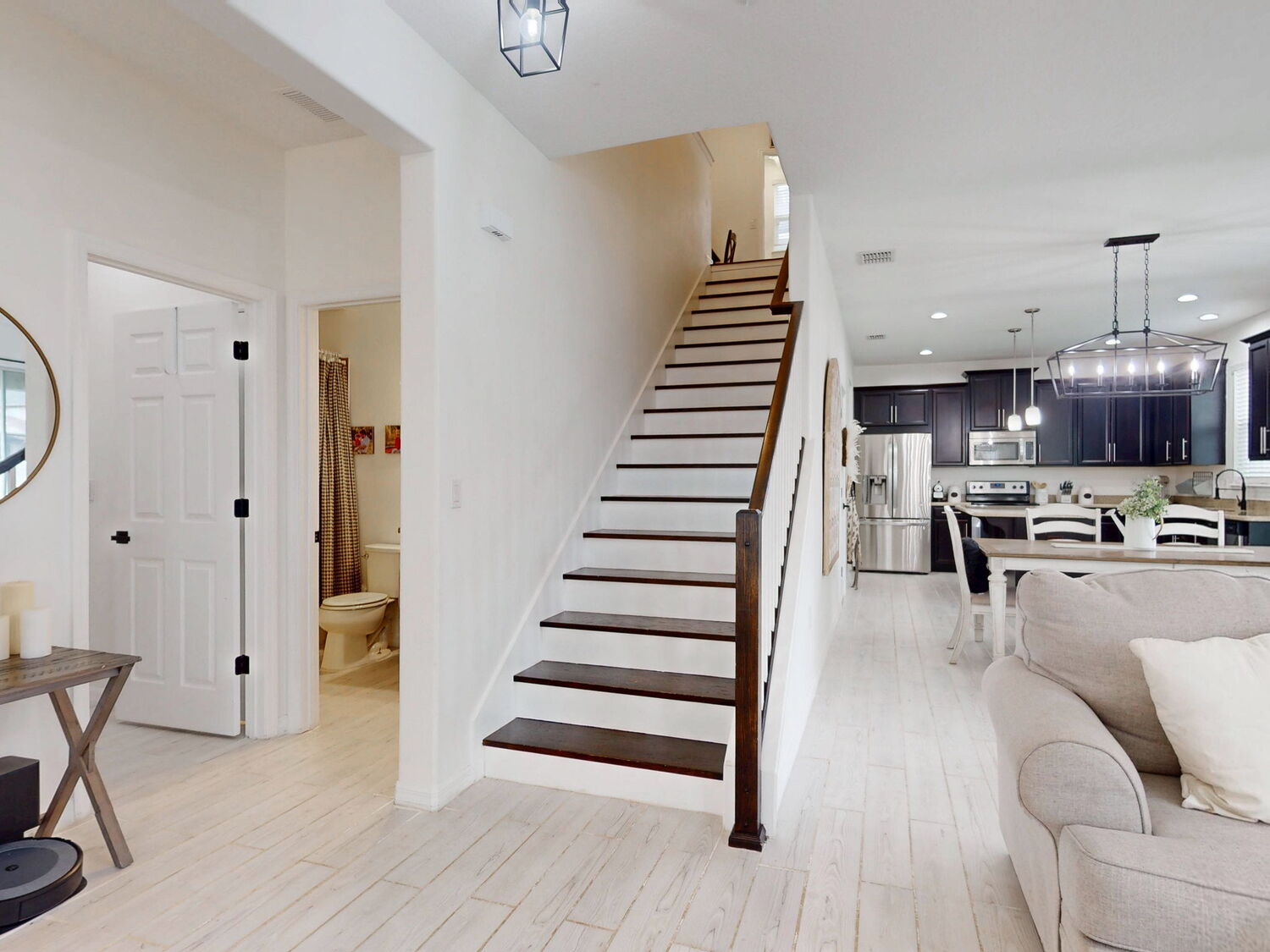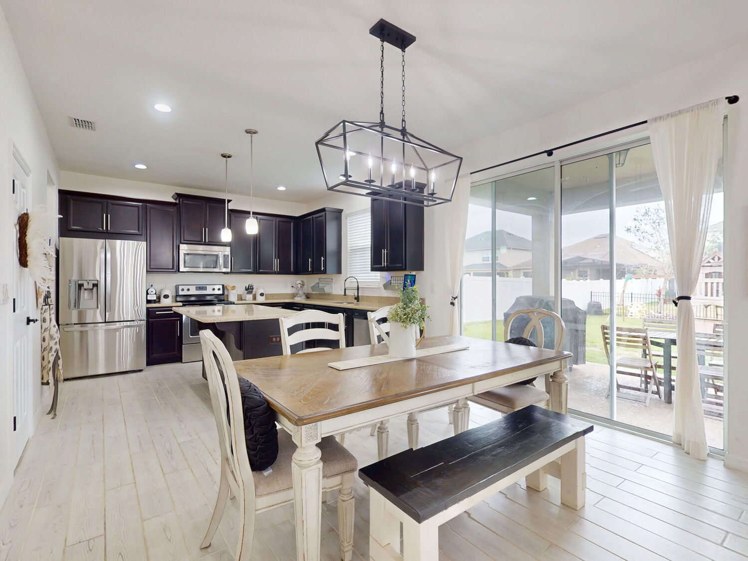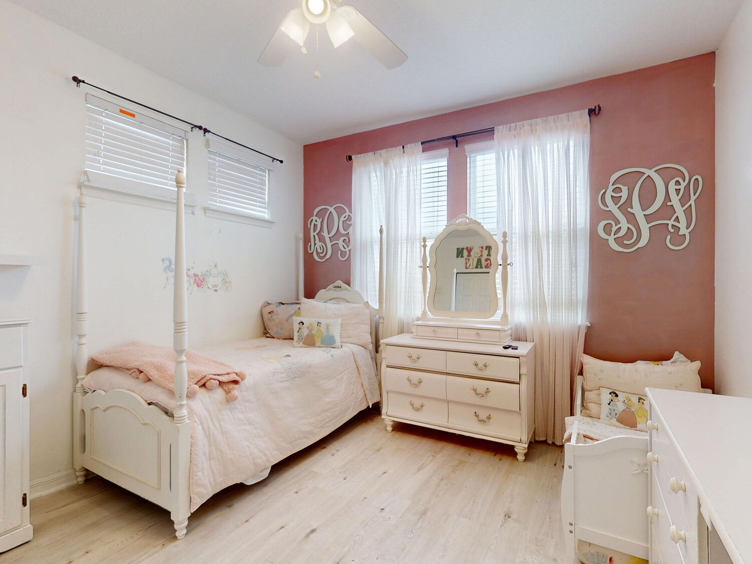 Nestled on a expansive corner lot, this exquisite two-story residence, crafted in 2015, spans an impressive 3,220 square feet of opulent living space. This architectural gem boasts four lavish bedrooms, three elegantly appointed bathrooms, and an expansive two-car garage. The interiors are adorned with luxurious vinyl plank and tile flooring, exuding timeless elegance. The state-of-the-art gourmet kitchen, resplendent with premium stainless steel appliances, offers an unrivaled setting for grand entertaining. Ascend to the upper level to discover a sprawling loft and an exclusive primary suite, a serene sanctuary of comfort. The expansive, meticulously fenced grounds provide an idyllic haven for leisure and recreation. Situated within an elite community, residents indulge in resort-caliber amenities, including a cutting-edge fitness center, a shimmering pool, and a delightful splash zone. Perfectly positioned mere moments from world-class theme parks, upscale shopping, and the airport, this home epitomizes refined living at its finest.