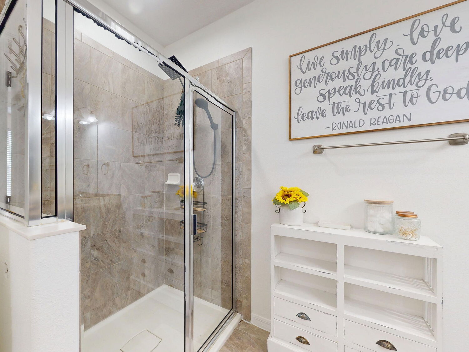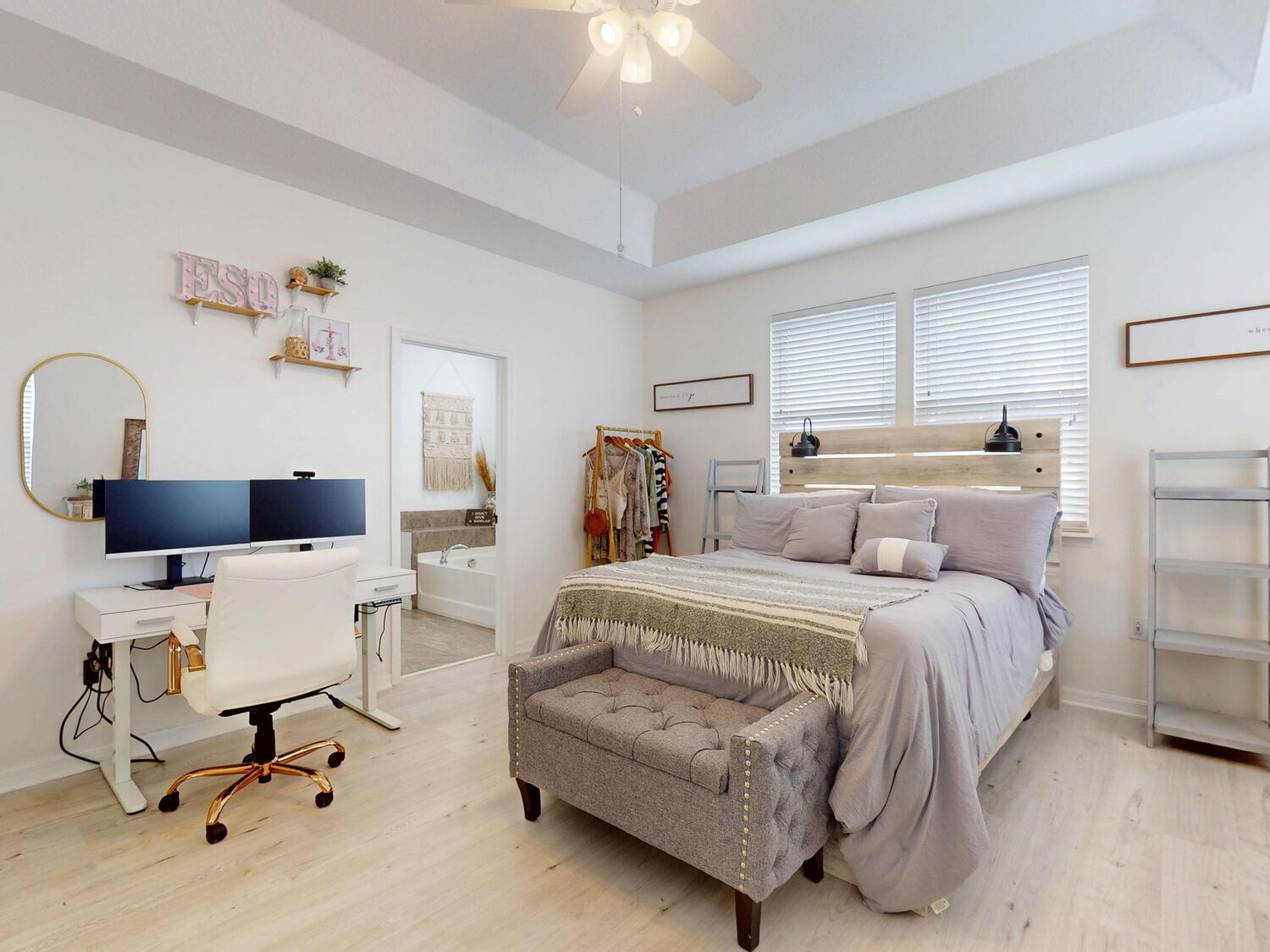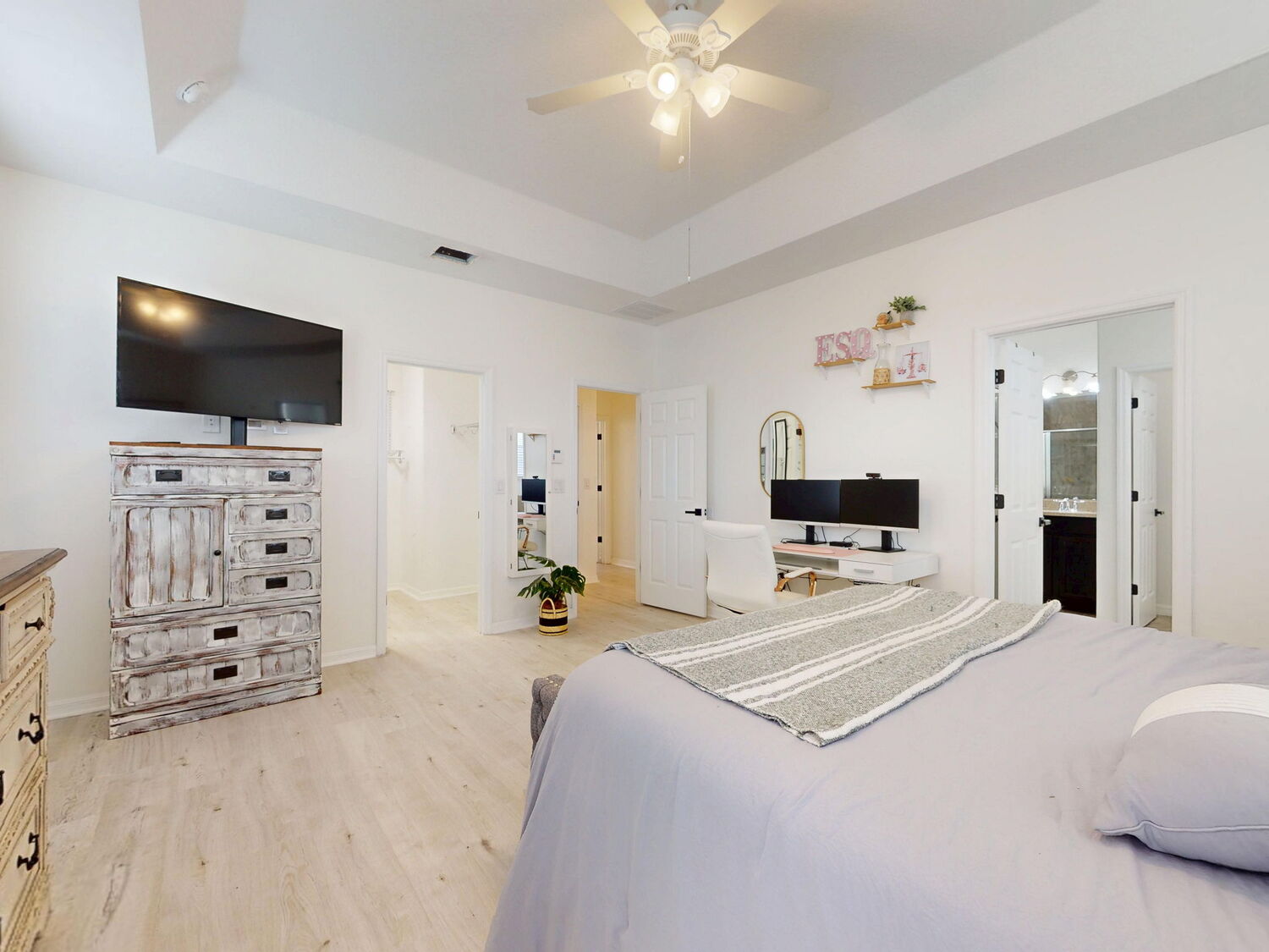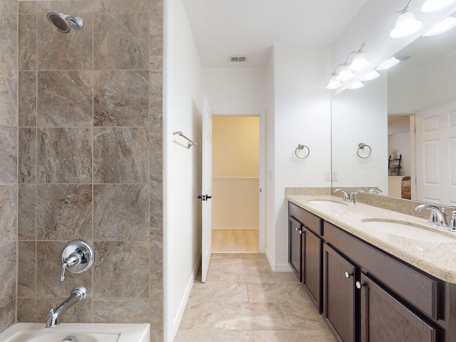 Nestled on a expansive corner lot, this exquisite two-story residence, crafted in 2015, spans an impressive 3,220 square feet of opulent living space. This architectural gem boasts four lavish bedrooms, three elegantly appointed bathrooms, and an expansive two-car garage. The interiors are adorned with luxurious vinyl plank and tile flooring, exuding timeless elegance. The state-of-the-art gourmet kitchen, resplendent with premium stainless steel appliances, offers an unrivaled setting for grand entertaining. Ascend to the upper level to discover a sprawling loft and an exclusive primary suite, a serene sanctuary of comfort. The expansive, meticulously fenced grounds provide an idyllic haven for leisure and recreation. Situated within an elite community, residents indulge in resort-caliber amenities, including a cutting-edge fitness center, a shimmering pool, and a delightful splash zone. Perfectly positioned mere moments from world-class theme parks, upscale shopping, and the airport, this home epitomizes refined living at its finest.