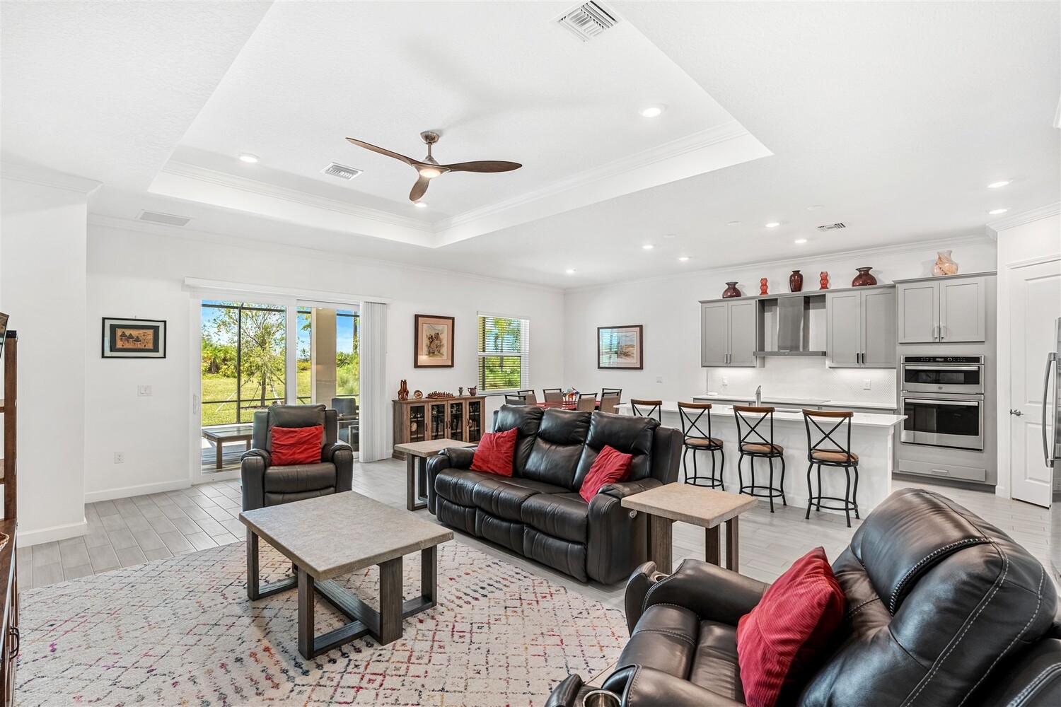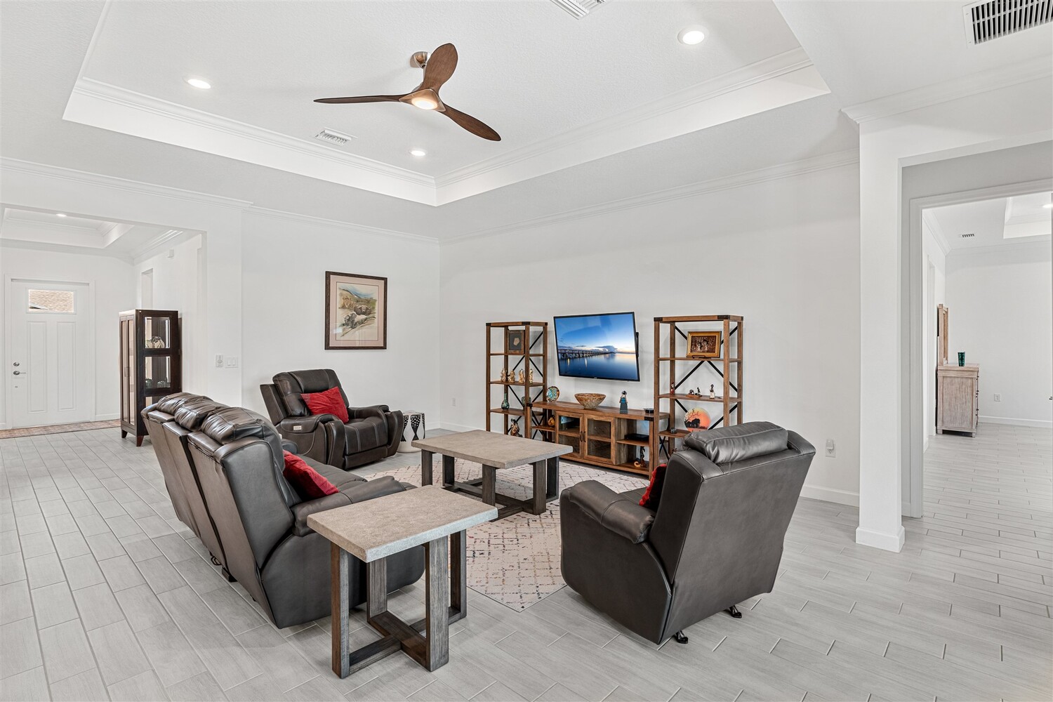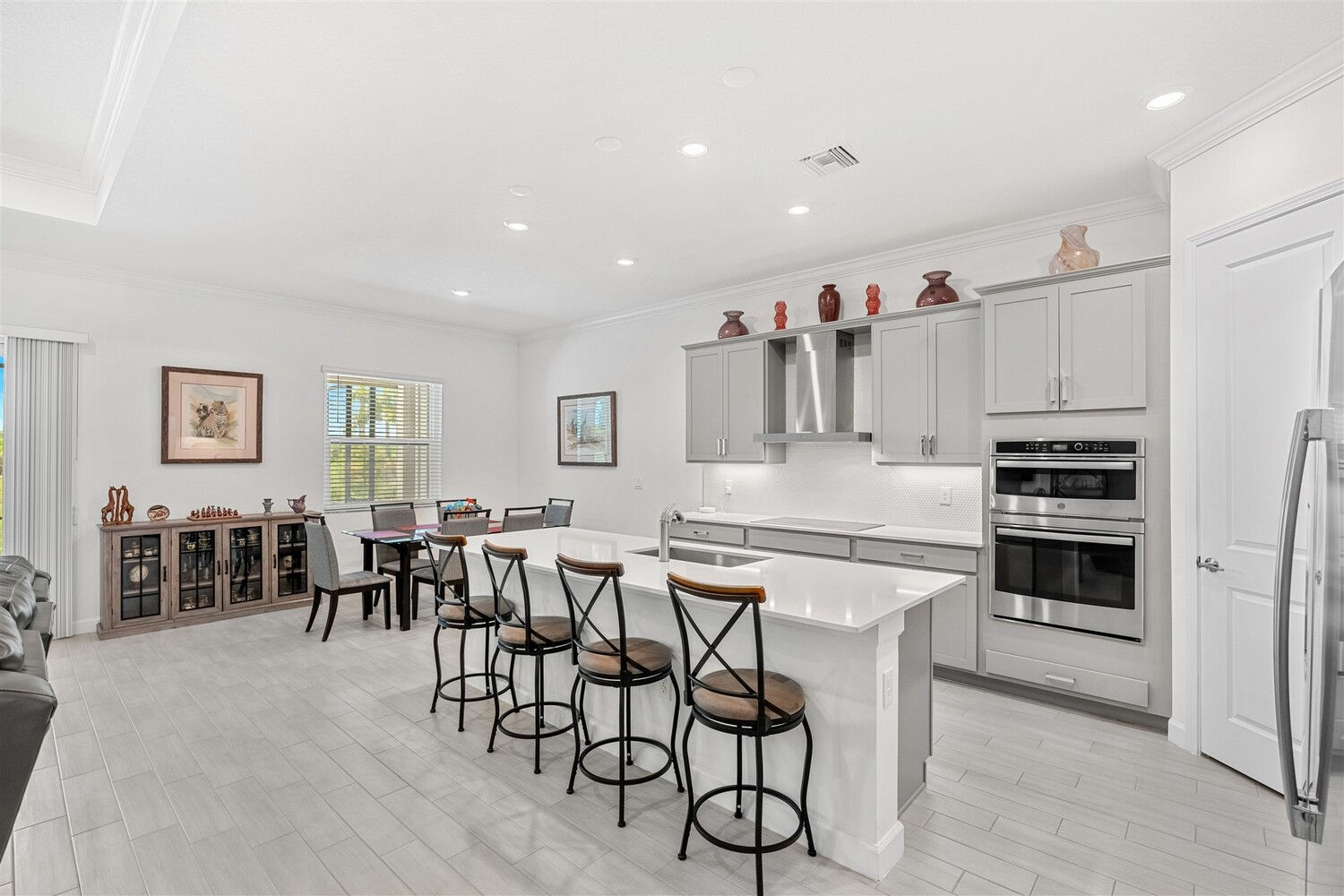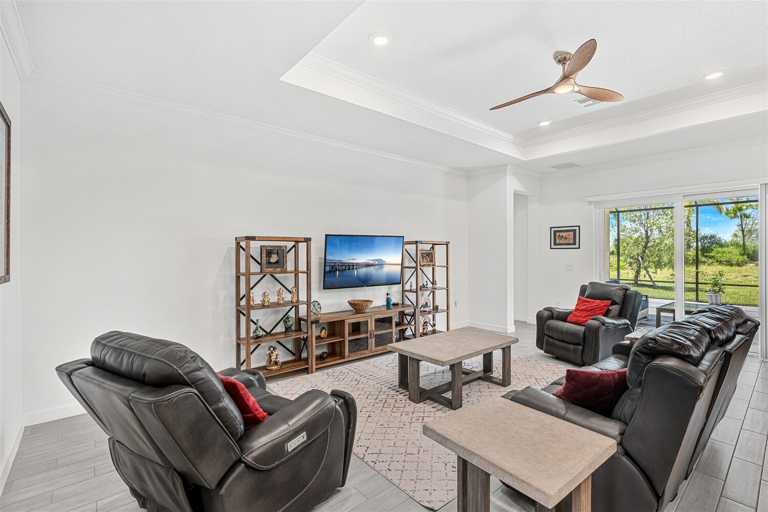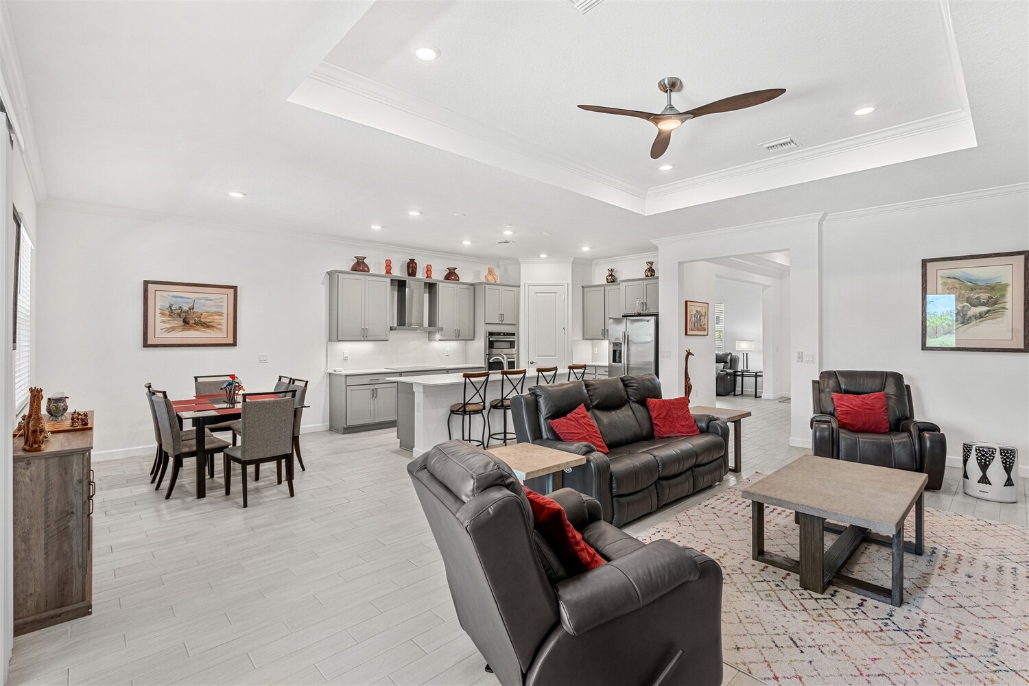 Like new, 3 bedroom, 3 car garage home in Bridgewater, Viera's popular 55+ resort style community! This stunning home has all the extras: New IMPACT WINDOWS AND SLIDERS, crown molding and tile plank floors throughout, and a gourmet kitchen with tiled backsplash, convection wall oven & microwave, cooktop, and designer hood. Enjoy the upgraded lighting package with undercabinet kitchen lights, and smart home features! Remote control roll-down hurricane screens on the back patio allow you to keep furniture outdoors during storms! And the extended screened lanai expands your outdoor living space! Even the garage doesn't disappoint with an epoxy floor! Whole house water treatment system, upgraded HVAC w/ultraviolet lights complete the package! Your dream life continues at the private clubhouse with a heated pool and spa, fitness center, tennis, pickleball and bocce ball, billiards room, ballroom, coffee lounge and even a movie theater! Close to the ocean, dining, shopping, cruises!