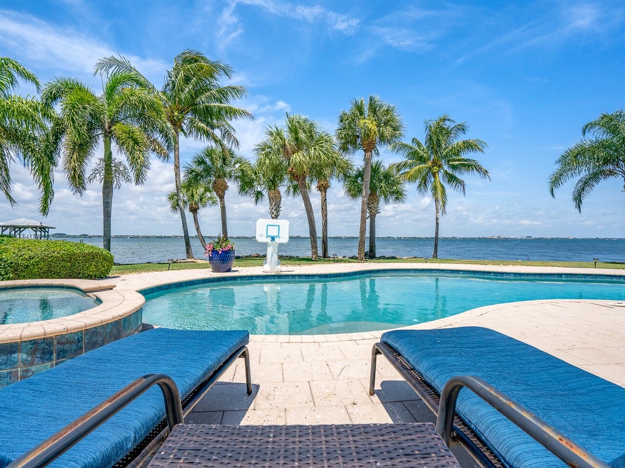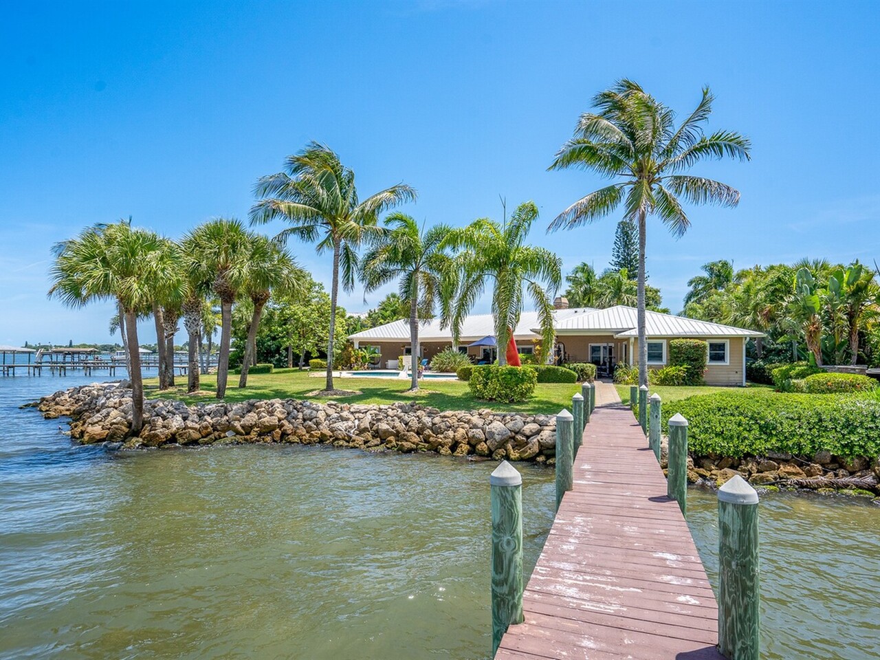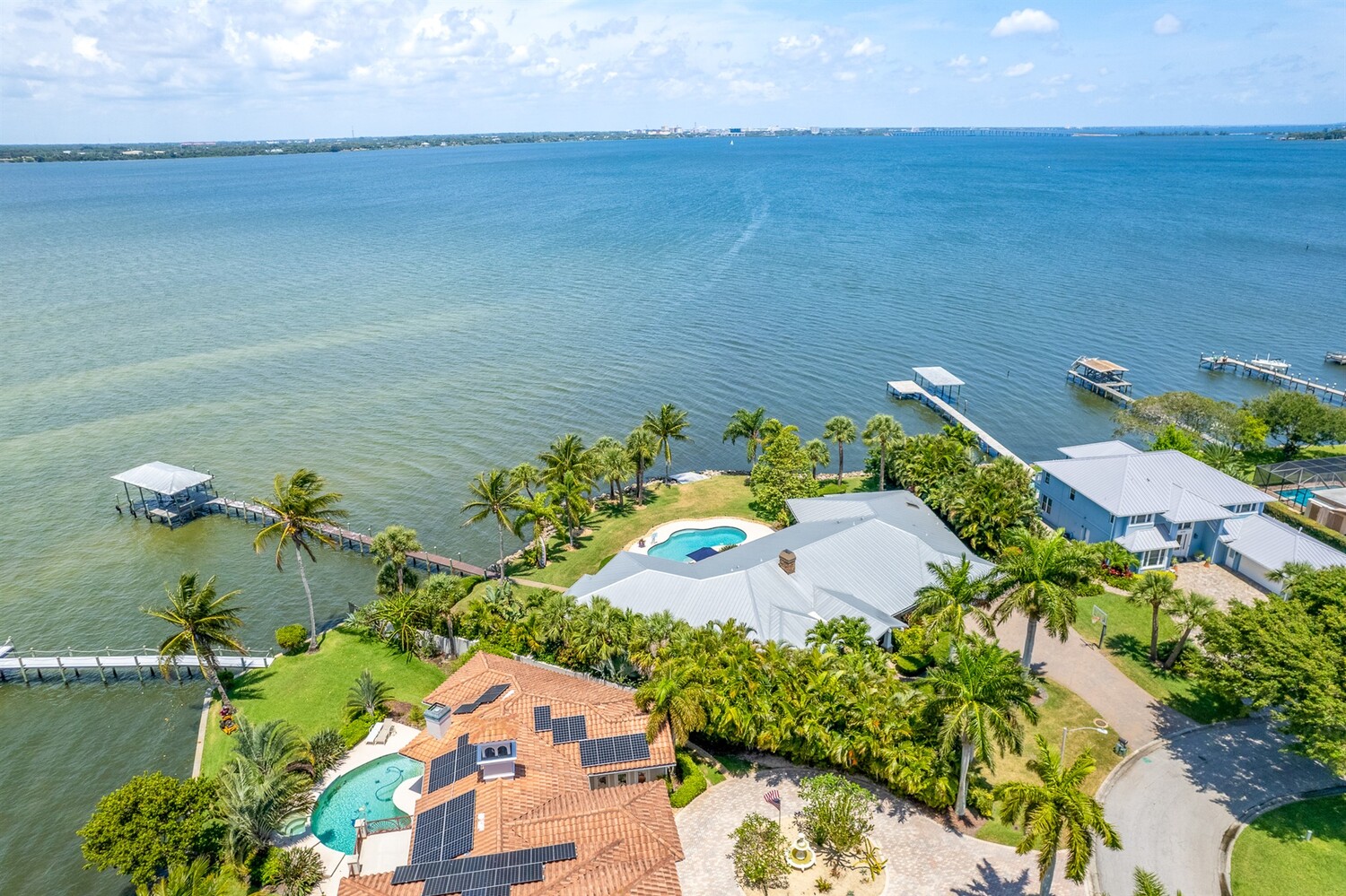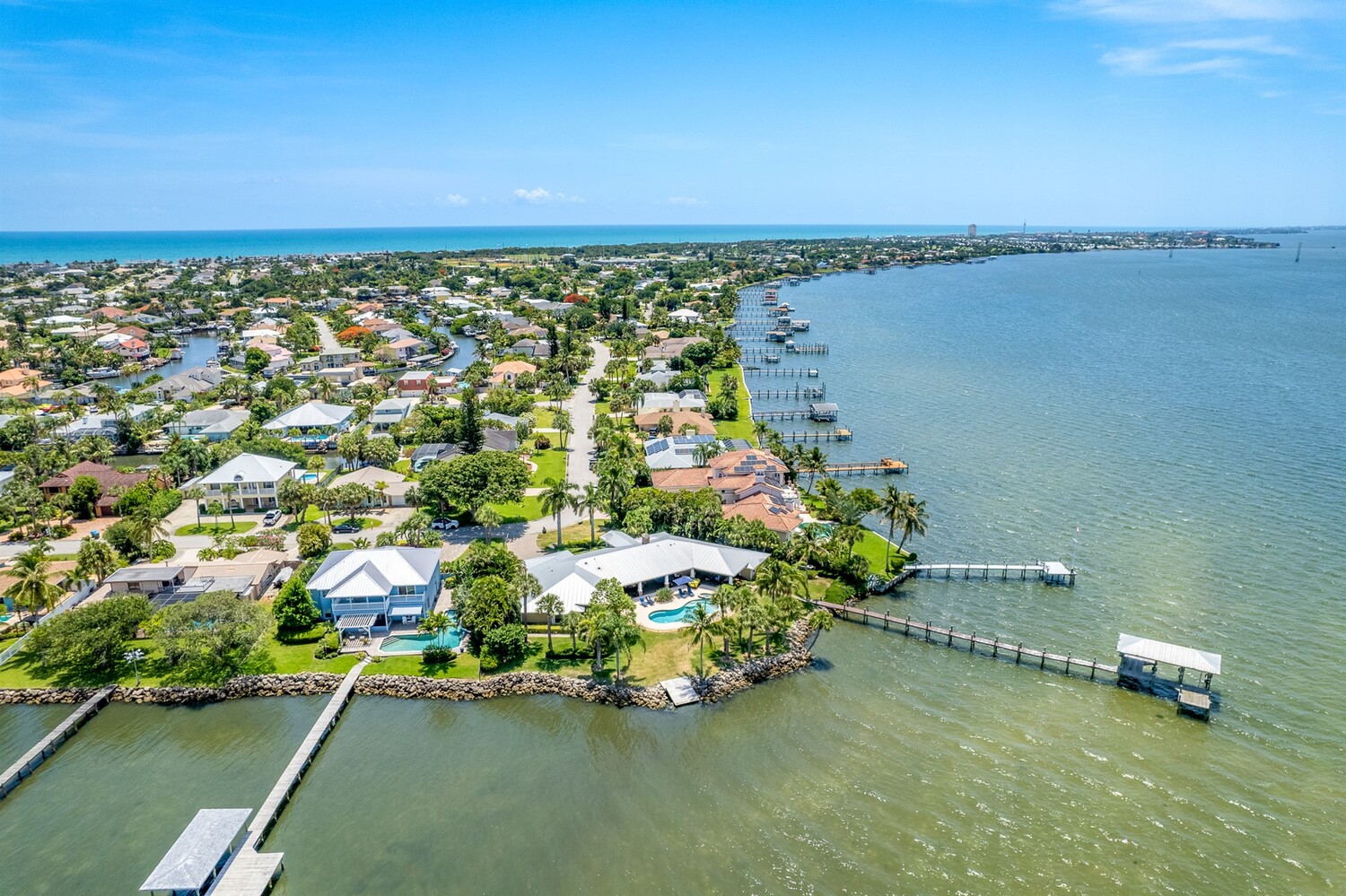 Welcome to 437 River View Ln. Featuring Epic Riverfront Views all while boasting over 220 linear feet of River frontage. A premier location and a rare find this property sits on the scenic tip of ''Crab Point'' in Melbourne Beach. All the best of beachside living, this home is just a few block stroll to fine dining, parks, tennis courts, shopping or the beach. If you prefer to relax poolside, stay home and enjoy playful dolphins in the morning and spectacular sunsets at night. This home is close to 192 within walking distance of historic downtown Melbourne Beach. Nestled on the corner lot of a cul-de-sac, the extensive backyard oasis leads to the pool, boat & wading dock and boat lift. The lush tropical landscaping and large driveway invite you to this private retreat. Enter through ouble glass doors and admire the natural lighting and open floor plan of this house. Hardwood floors, a neutral color palate and double hung impact windows/sliders offer an immediate sense of serenity. Enjoy stunning views of the river throughout the home. Featuring 4 bedrooms, 3 full bathrooms home includes two master suites on opposing wings of the home. The fifth room leaves alternative for a game, toy or possible fifth bedroom as well. The kitchen is a chef's paradise with quartz countertops, custom wood cabinets, Top of the line built in stainless side by side refrigerator/freezer, Top of the line gas 6 burner cook top and double oven, warming oven, built-in microwave, wine fridge and double oversized pantries. These are all situated around a large kitchen island with breakfast bar seating. Ideal area to host family and friends or entertain. Crown molding, modern lighting, a venetian plaster wall with gas fireplace is accented by the plantation shutters, large baseboards, trim work and tray ceilings throughout the home. The main master suite opens to the covered lanai with tropical foliage and river views. The fourth and largest master closet is an oversized walk in. This leads to the master bathroom with Jacuzzi tub and oversized walk-in shower. The second master suite mimics the first with similar views of the river, pool and foliage from both the bedroom and the parallel covered Lanai. With over 1000 ft.² of paneled lanai step outside to enjoy all that riverfront living has to offer. Enjoy barbecuing or entertaining at the stone accented summer kitchen, relax on the deck, catch a few fish, take a dip in the pool or soak in the hot tub under the stars. Enjoy boating and jet skiing from your own dock and boat lift or take advantage of your paddle board and Jet Ski's from the riverfront wake area. Abutting Crab Point, this spacious back yard along 220+ ft of Riverfront is truly unique in all that it has to offer. Savor the breathtaking Riverfront views and enjoy living in your own oasis.