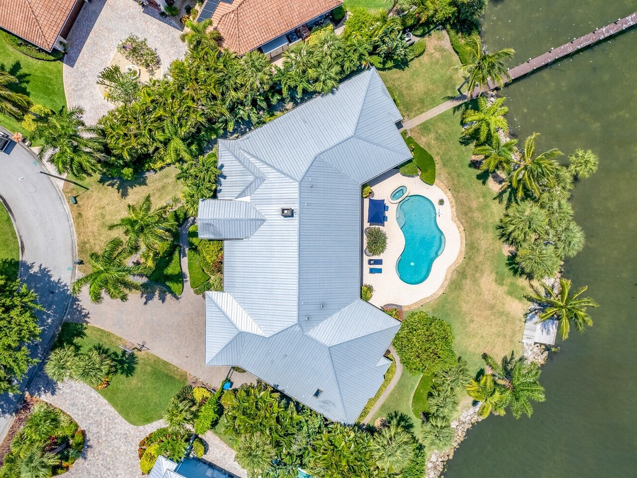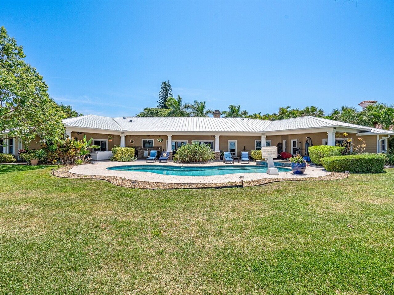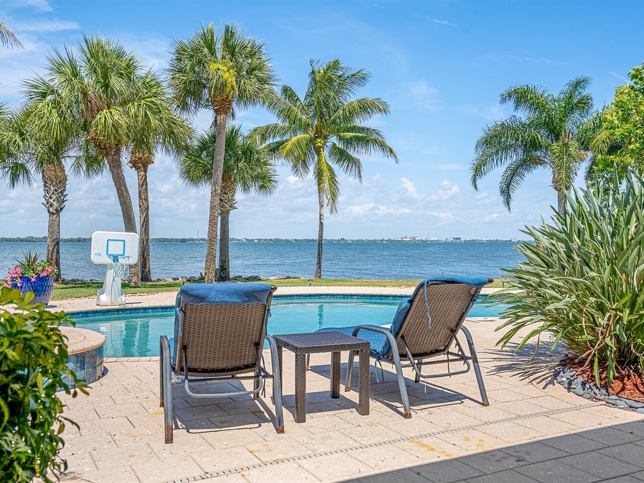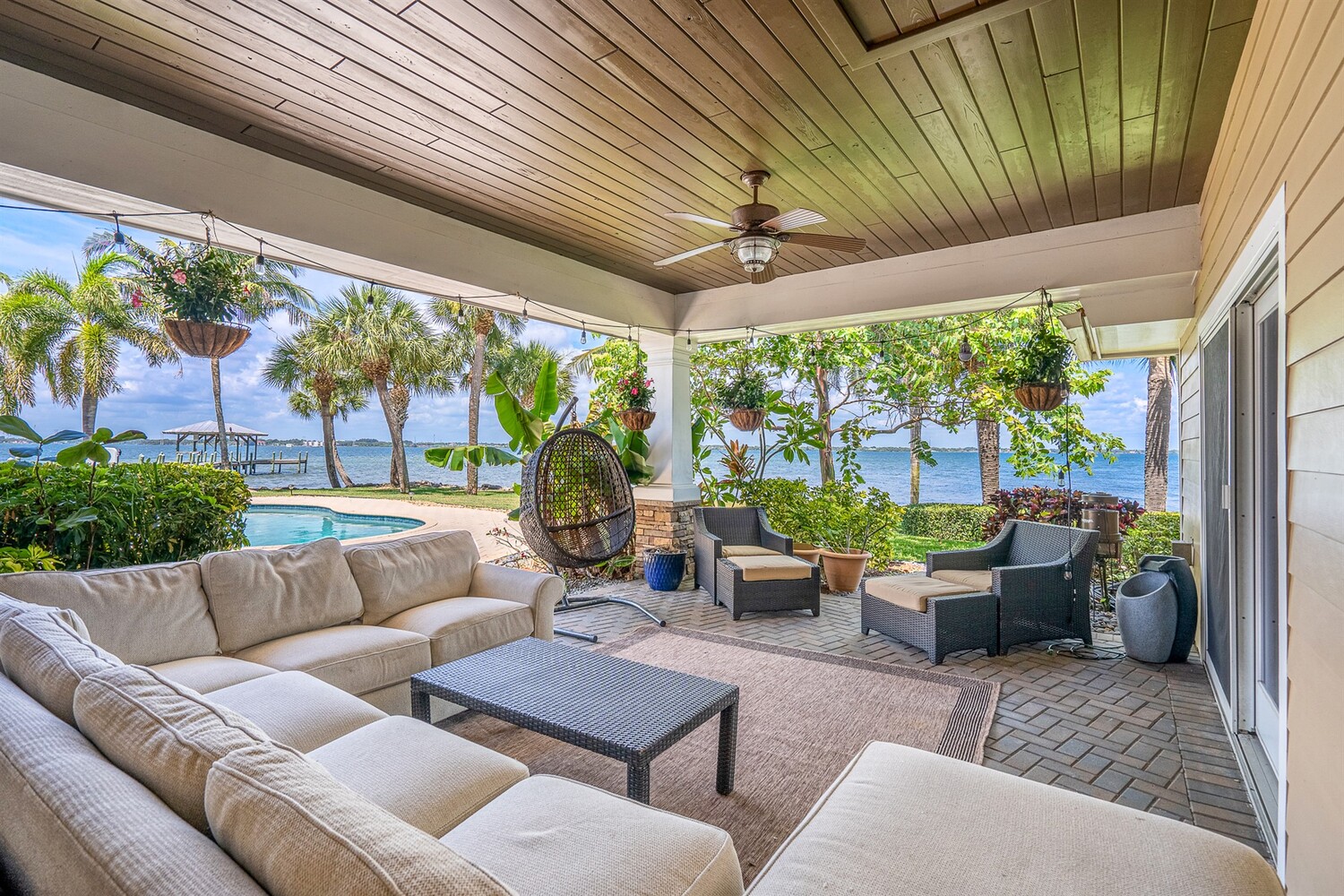 Welcome to 437 River View Ln. Featuring Epic Riverfront Views all while boasting over 220 linear feet of River frontage. A premier location and a rare find this property sits on the scenic tip of ''Crab Point'' in Melbourne Beach. All the best of beachside living, this home is just a few block stroll to fine dining, parks, tennis courts, shopping or the beach. If you prefer to relax poolside, stay home and enjoy playful dolphins in the morning and spectacular sunsets at night. This home is close to 192 within walking distance of historic downtown Melbourne Beach. Nestled on the corner lot of a cul-de-sac, the extensive backyard oasis leads to the pool, boat & wading dock and boat lift. The lush tropical landscaping and large driveway invite you to this private retreat. Enter through ouble glass doors and admire the natural lighting and open floor plan of this house. Hardwood floors, a neutral color palate and double hung impact windows/sliders offer an immediate sense of serenity. Enjoy stunning views of the river throughout the home. Featuring 4 bedrooms, 3 full bathrooms home includes two master suites on opposing wings of the home. The fifth room leaves alternative for a game, toy or possible fifth bedroom as well. The kitchen is a chef's paradise with quartz countertops, custom wood cabinets, Top of the line built in stainless side by side refrigerator/freezer, Top of the line gas 6 burner cook top and double oven, warming oven, built-in microwave, wine fridge and double oversized pantries. These are all situated around a large kitchen island with breakfast bar seating. Ideal area to host family and friends or entertain. Crown molding, modern lighting, a venetian plaster wall with gas fireplace is accented by the plantation shutters, large baseboards, trim work and tray ceilings throughout the home. The main master suite opens to the covered lanai with tropical foliage and river views. The fourth and largest master closet is an oversized walk in. This leads to the master bathroom with Jacuzzi tub and oversized walk-in shower. The second master suite mimics the first with similar views of the river, pool and foliage from both the bedroom and the parallel covered Lanai. With over 1000 ft.² of paneled lanai step outside to enjoy all that riverfront living has to offer. Enjoy barbecuing or entertaining at the stone accented summer kitchen, relax on the deck, catch a few fish, take a dip in the pool or soak in the hot tub under the stars. Enjoy boating and jet skiing from your own dock and boat lift or take advantage of your paddle board and Jet Ski's from the riverfront wake area. Abutting Crab Point, this spacious back yard along 220+ ft of Riverfront is truly unique in all that it has to offer. Savor the breathtaking Riverfront views and enjoy living in your own oasis.