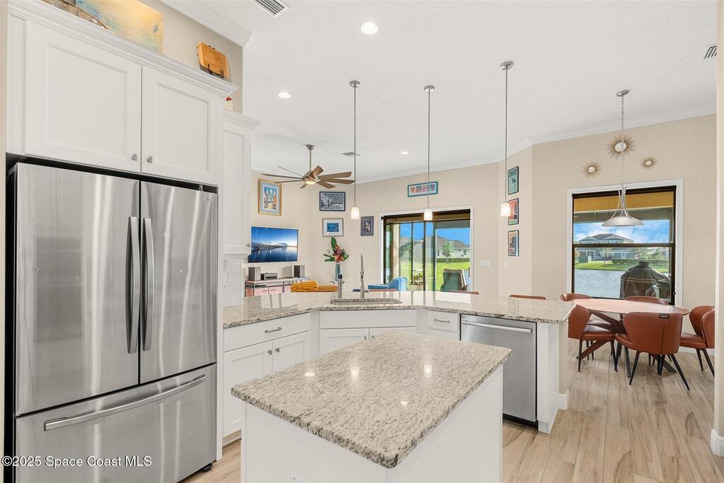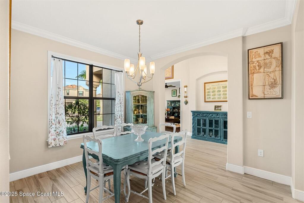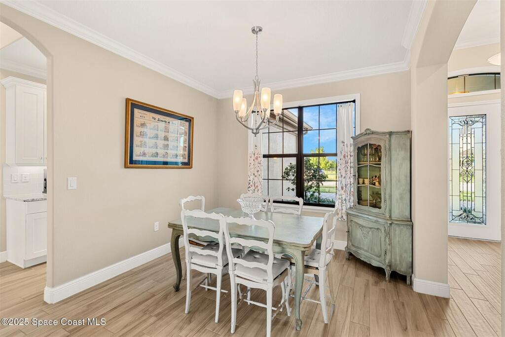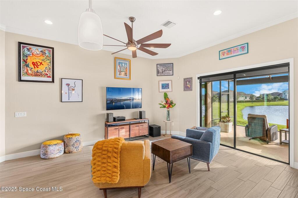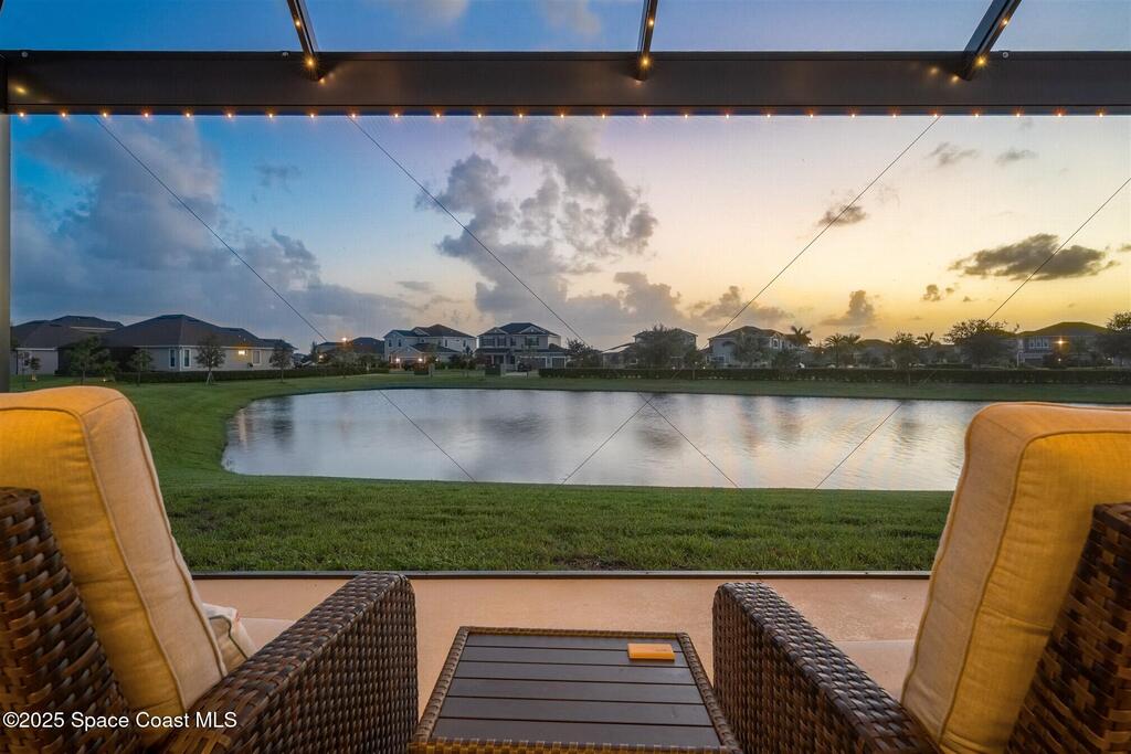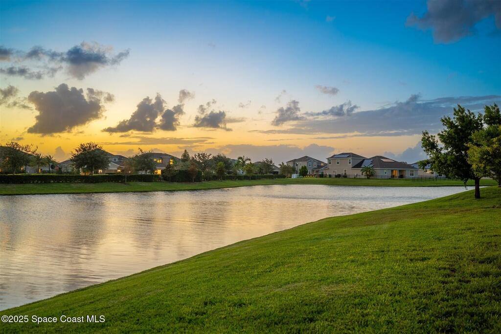 Enjoy gorgeous lakefront views in this meticulously maintained contemporary CBS home in the sought-after gated community of Stonecrest at Viera. Located on one of the larger lots in the neighborhood, this house boasts double water views. Decorating for the seasons is as easy as pushing a button with the exterior custom lighting system. A glass-door entryway welcomes you into the open floorplan, with a formal dining room and flex/bonus room to either side of the foyer. Natural light from large double pane windows guide you through to the kitchen, great room, and breakfast nook. At the heart of the home, the light and bright kitchen offers stainless steel appliances, a vented hood, gas range, convention oven, a breakfast bar and pantry. Move through the 8 ft. sliders to the extended screened patio and take in the sparkling lake views while cooking on the grill. The expansive primary bedroom with its own sitting area includes a spacious ensuite SEE ''MORE