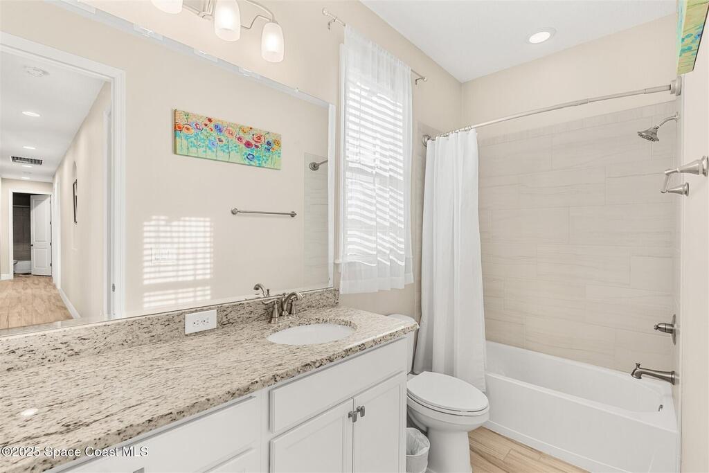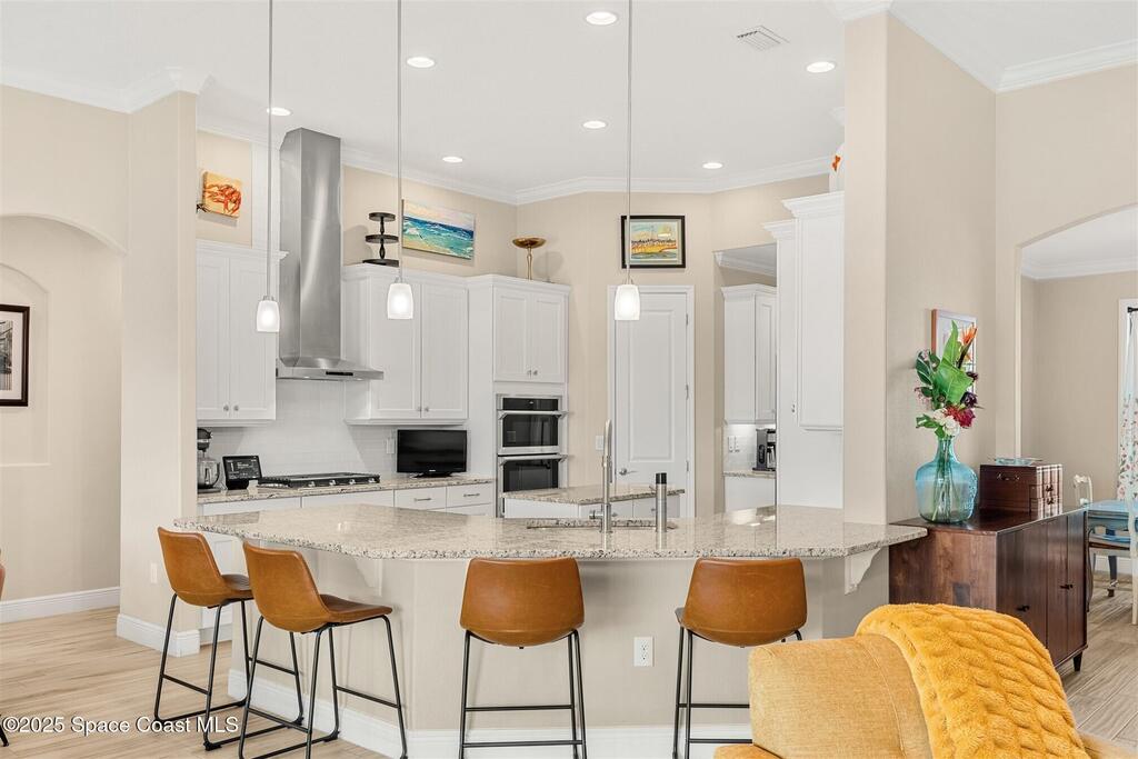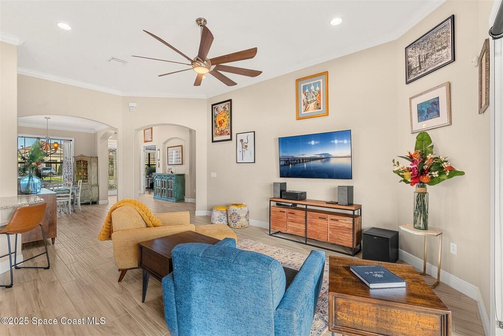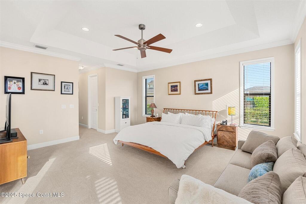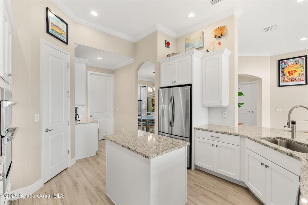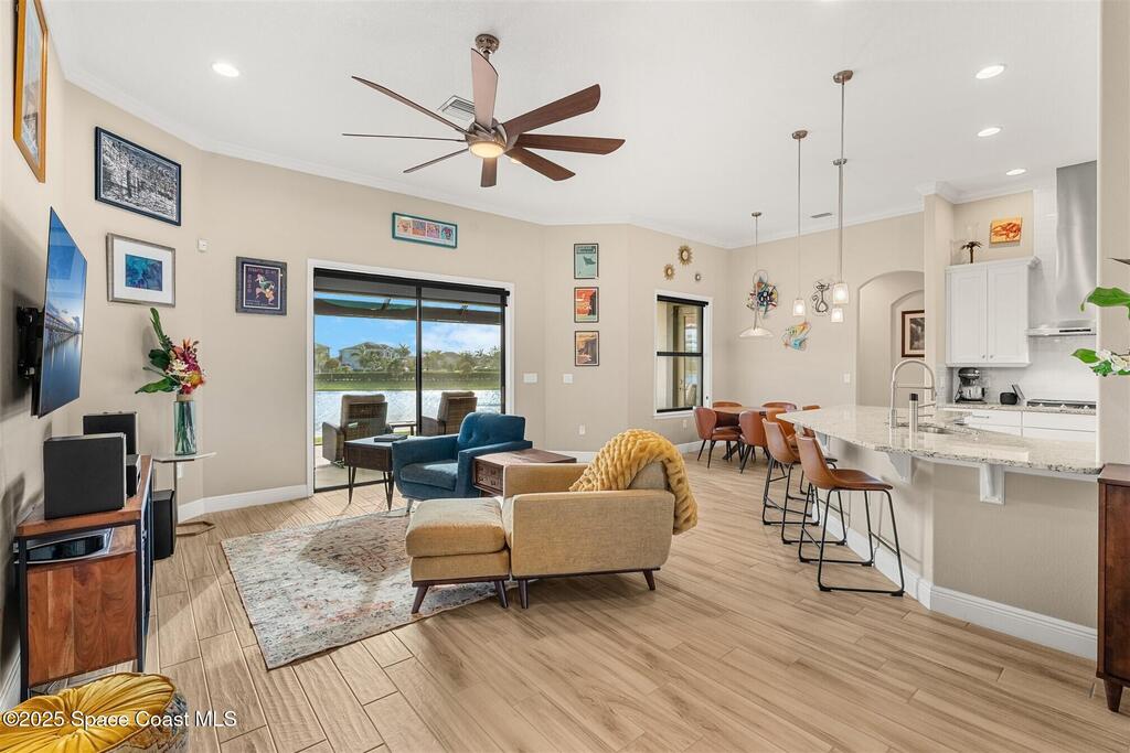 Enjoy gorgeous lakefront views in this meticulously maintained contemporary CBS home in the sought-after gated community of Stonecrest at Viera. Located on one of the larger lots in the neighborhood, this house boasts double water views. Decorating for the seasons is as easy as pushing a button with the exterior custom lighting system. A glass-door entryway welcomes you into the open floorplan, with a formal dining room and flex/bonus room to either side of the foyer. Natural light from large double pane windows guide you through to the kitchen, great room, and breakfast nook. At the heart of the home, the light and bright kitchen offers stainless steel appliances, a vented hood, gas range, convention oven, a breakfast bar and pantry. Move through the 8 ft. sliders to the extended screened patio and take in the sparkling lake views while cooking on the grill. The expansive primary bedroom with its own sitting area includes a spacious ensuite SEE ''MORE
