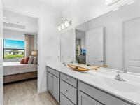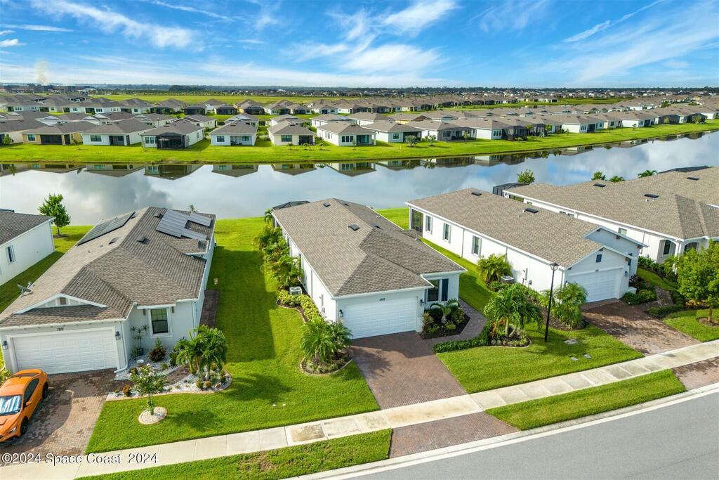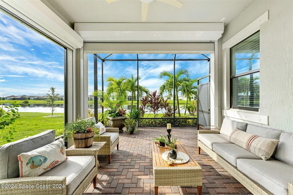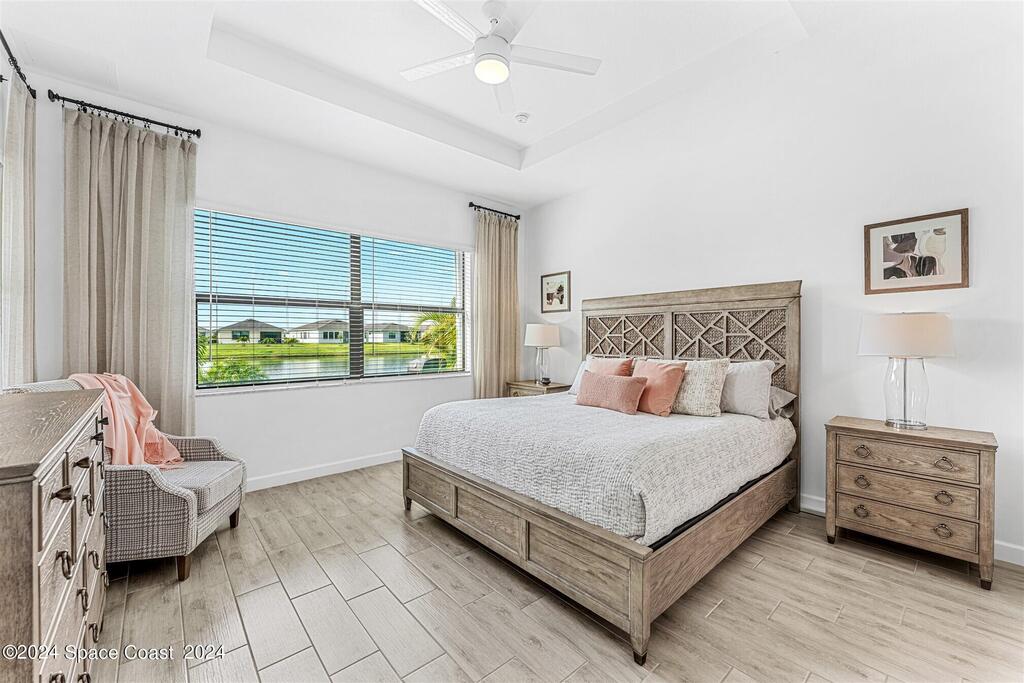 Out of the pages of a decorator magazine, this stunning home in Bridgewater, Viera's resort like 55+ community, will not disappoint. Decorated in today's palette of grays and whites, the extra features will amaze you. Brand new plank tile throughout with sealed grout, decorator lighting and ceiling fans, new interior paint, tray ceilings in great room and primary, and laundry sink with custom cabinet are just a few of your must haves! Kitchen island overlooks the great room and the breathtaking views of the lake and extended lanai with electric hurricane roll-downs and even an enclosed shower for gardeners or pets! The exterior will delight you with extra landscaping, hardwired landscape lighting, accordion hurricane shutters, and all brick pavers are sealed. Garage upgrades include cabinets and workbench, dedicated circuit for golf cart, and added hose bib! Bridgewater's private clubhouse includes a heated pool, tennis & pickleball courts, a movie theater, fitness room, billiards!