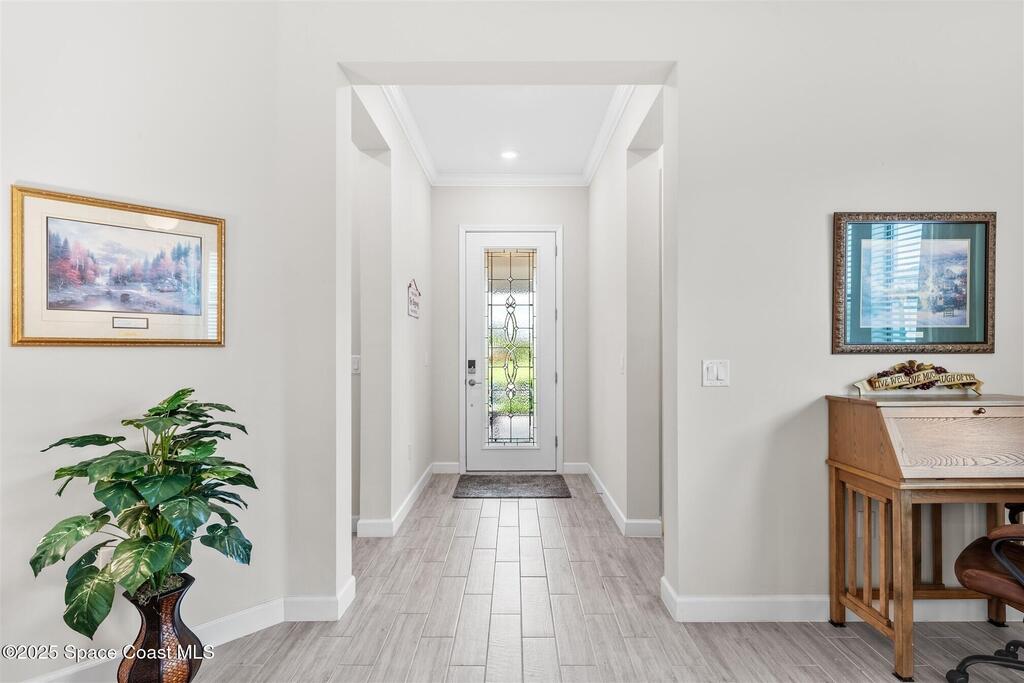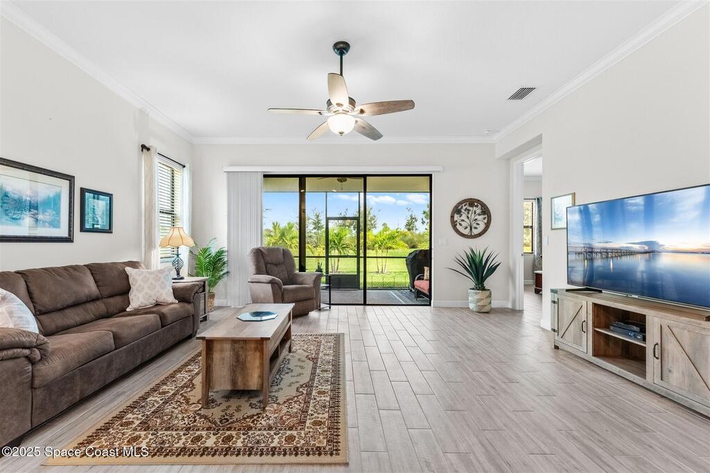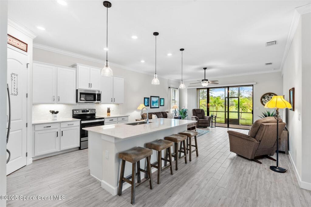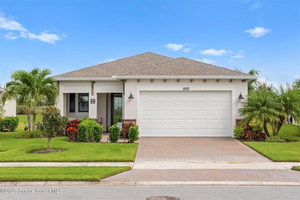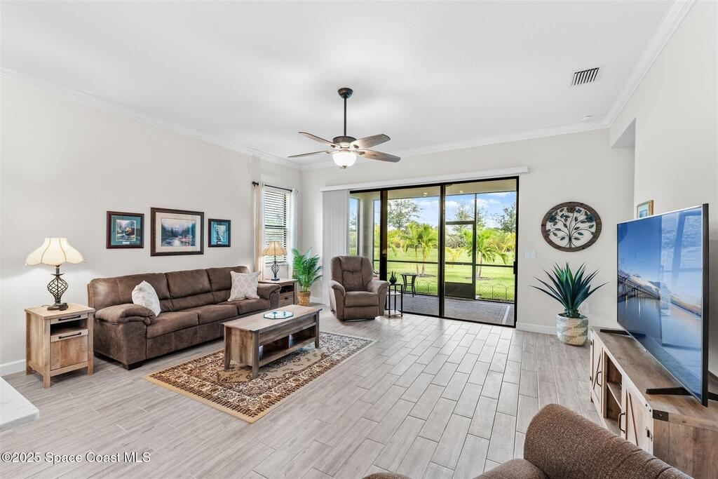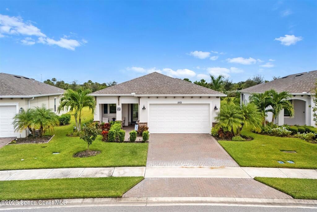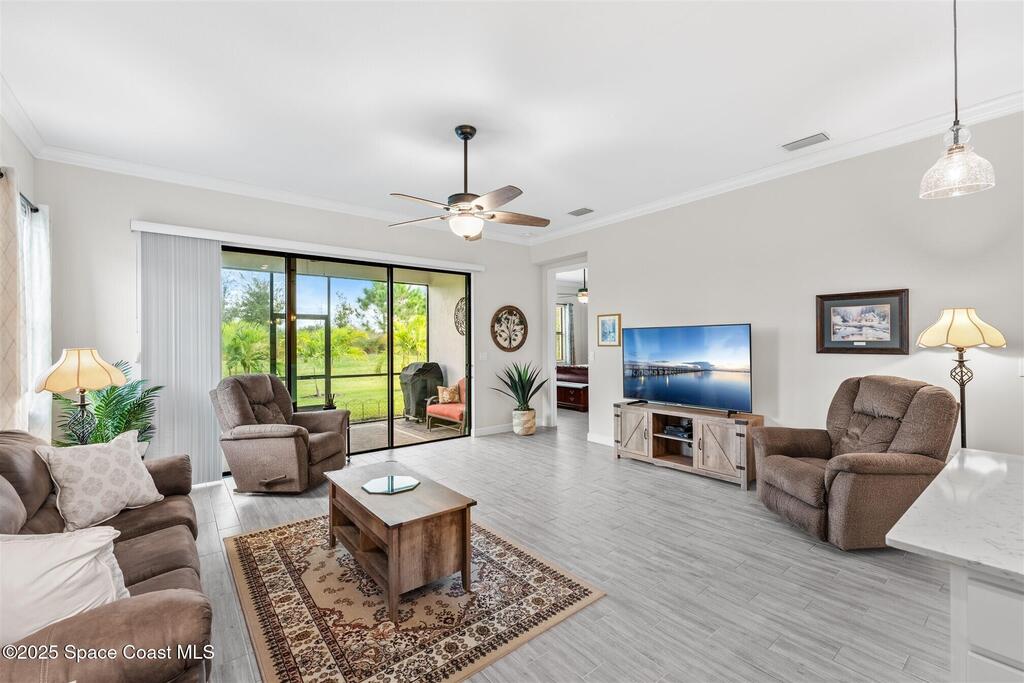 From the exterior with stone accents and inviting front porch to the screened-in lanai, this 2 bedroom plus flex room home in Bridgewater, Viera's sought after 55+ resort style community, epitomizes Florida living! Decorated in today's sought after palette of whites and grays, this ''open floor plan'' home checks off all the boxes. White kitchen cabinets, upscale backsplash, undercabinet and pendent lighting, marble look quartz counters in kitchen and baths, new porcelain tile flooring throughout (no carpet!), and elegant crown molding in main areas and bedrooms are the highlights of this home! New Palm Trees in backyard July 2025! The state-of-the-art refrigerator brews your favorite coffee before you retreat to the front porch or the screened in rear lanai. The HOA provides lawn care and includes a stunning private clubhouse, complete with heated pool and spa, fitness center, tennis and pickleball courts, billiards room and its own movie theater! Close to shopping & restaurants!