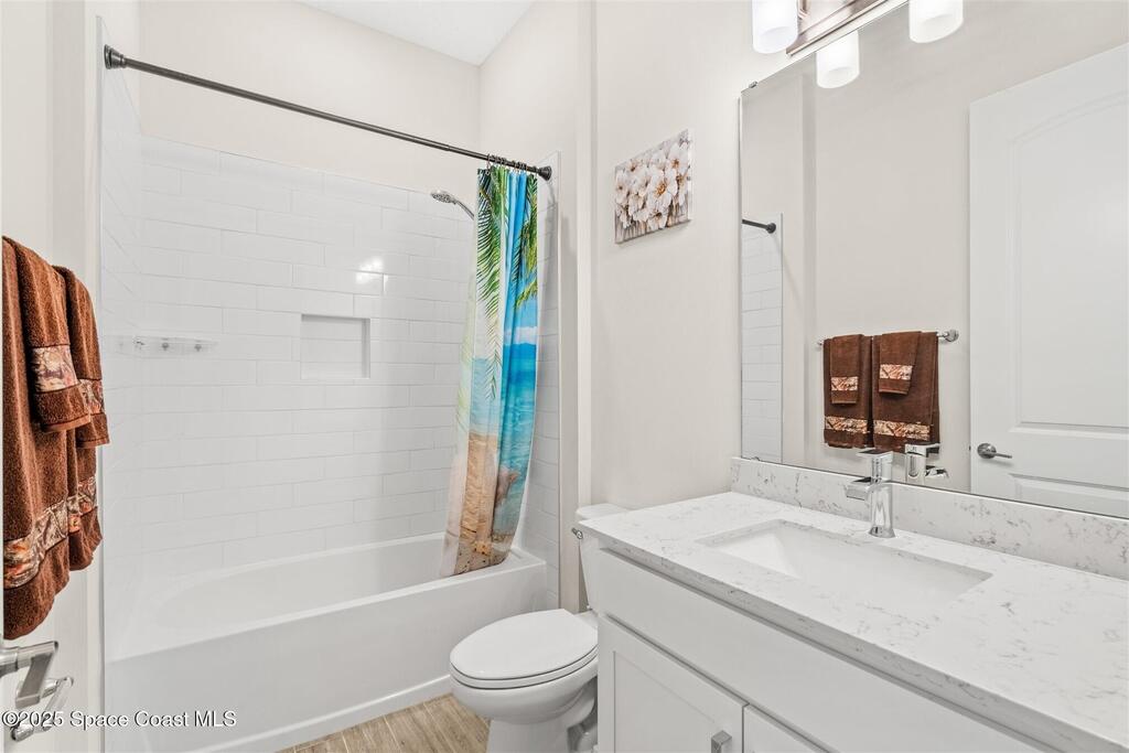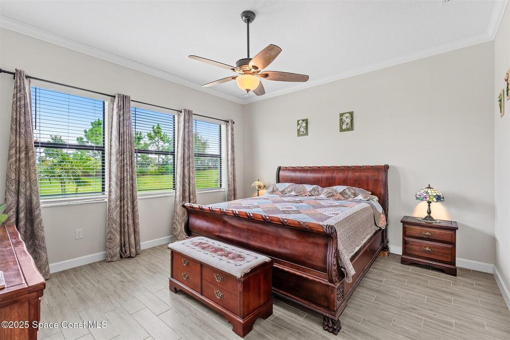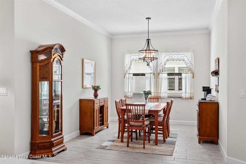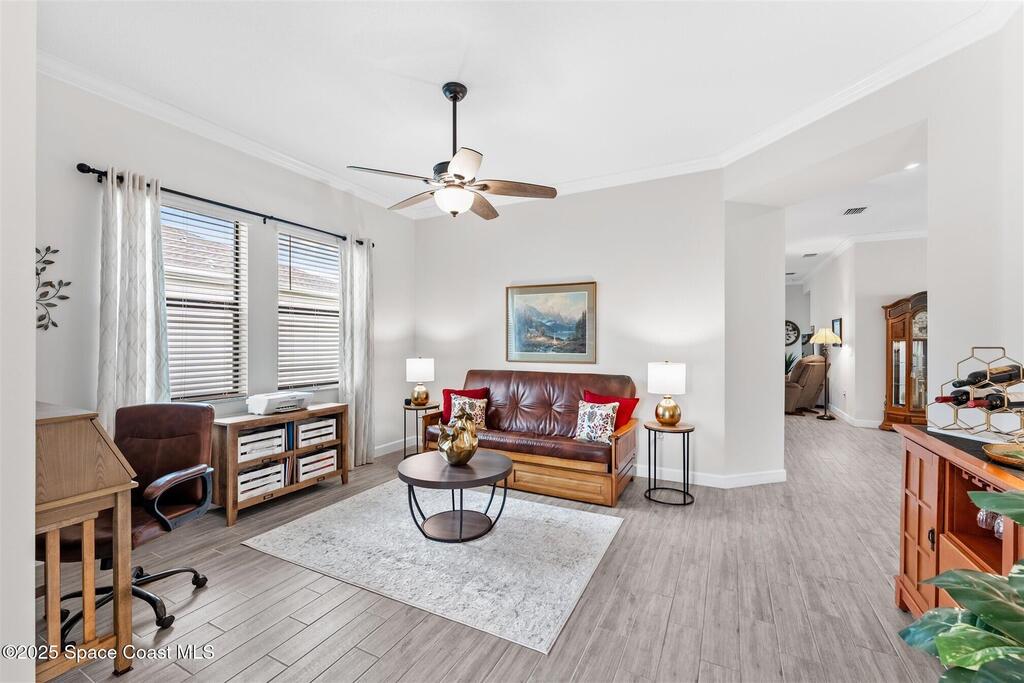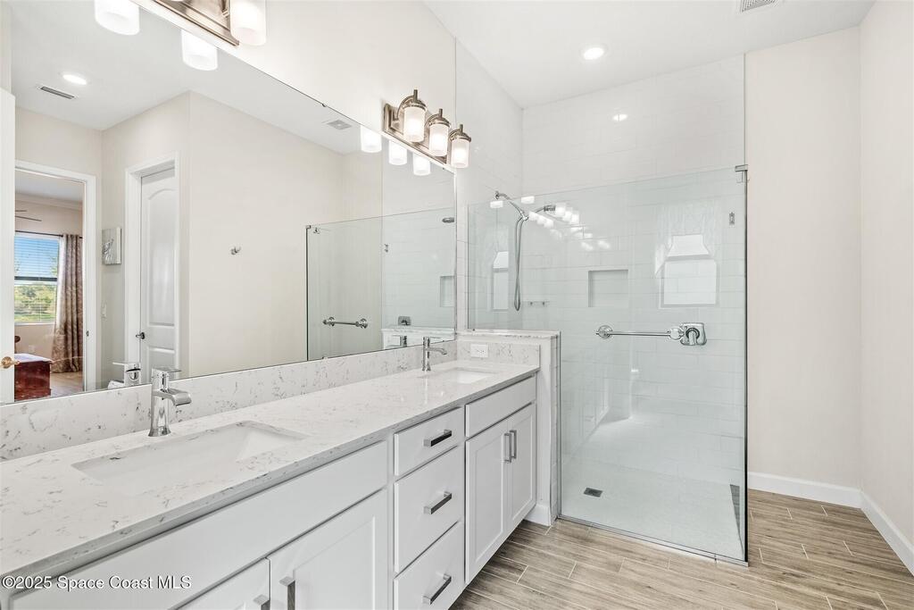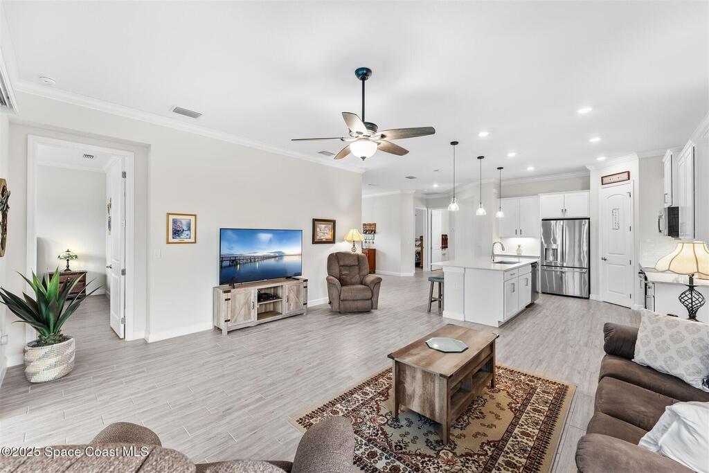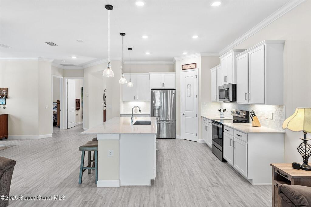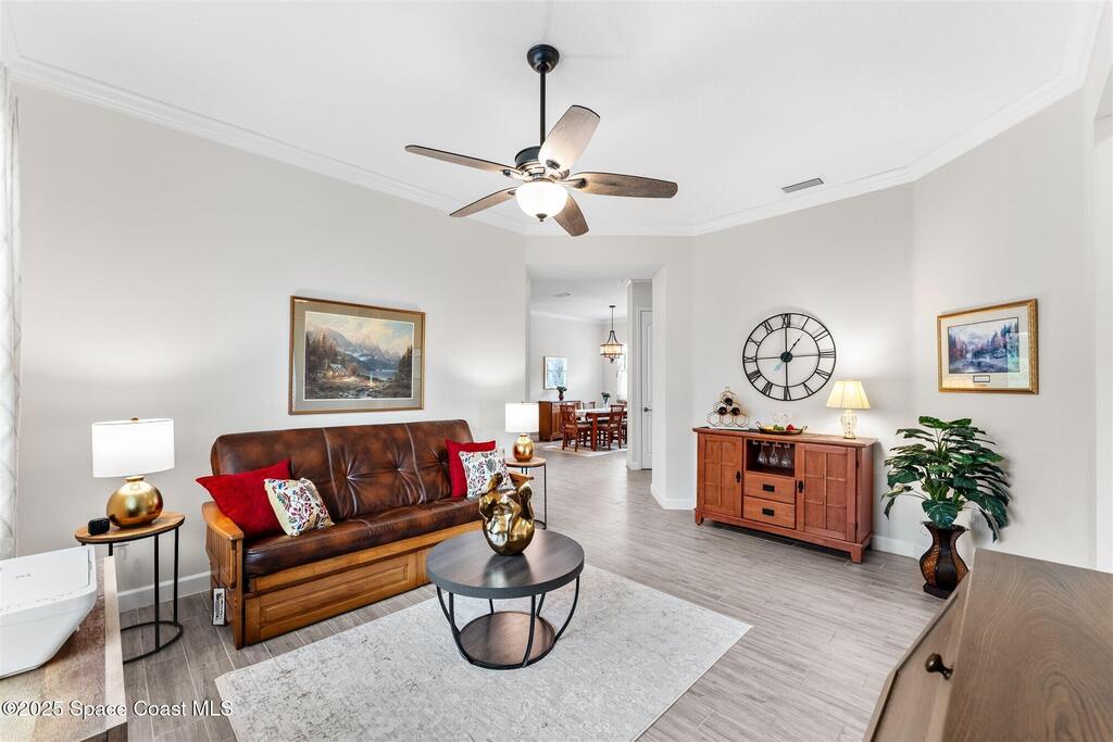 From the exterior with stone accents and inviting front porch to the screened-in lanai, this 2 bedroom plus flex room home in Bridgewater, Viera's sought after 55+ resort style community, epitomizes Florida living! Decorated in today's sought after palette of whites and grays, this ''open floor plan'' home checks off all the boxes. White kitchen cabinets, upscale backsplash, undercabinet and pendent lighting, marble look quartz counters in kitchen and baths, new porcelain tile flooring throughout (no carpet!), and elegant crown molding in main areas and bedrooms are the highlights of this home! New Palm Trees in backyard July 2025! The state-of-the-art refrigerator brews your favorite coffee before you retreat to the front porch or the screened in rear lanai. The HOA provides lawn care and includes a stunning private clubhouse, complete with heated pool and spa, fitness center, tennis and pickleball courts, billiards room and its own movie theater! Close to shopping & restaurants!