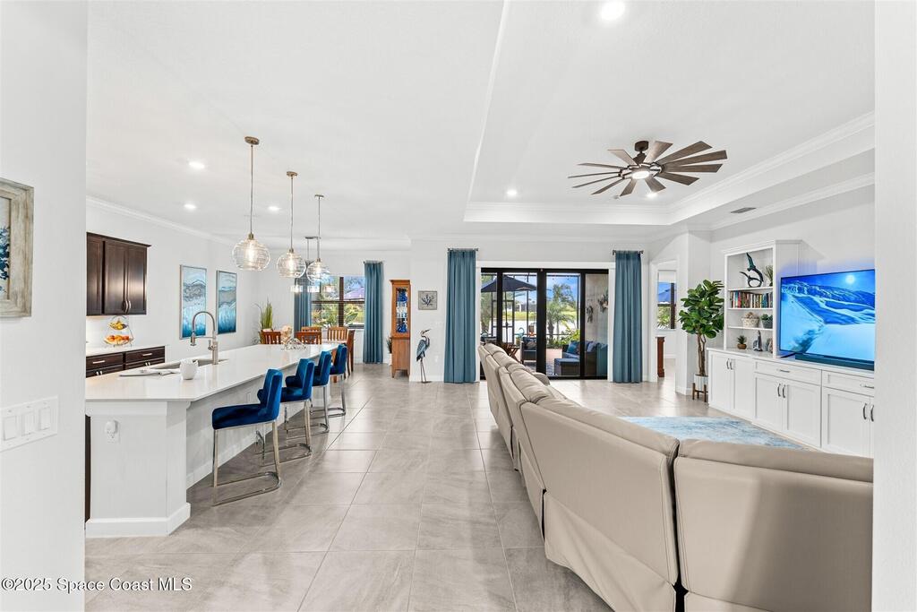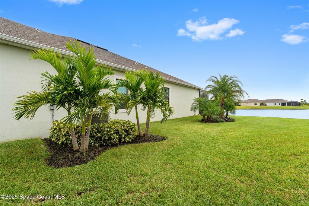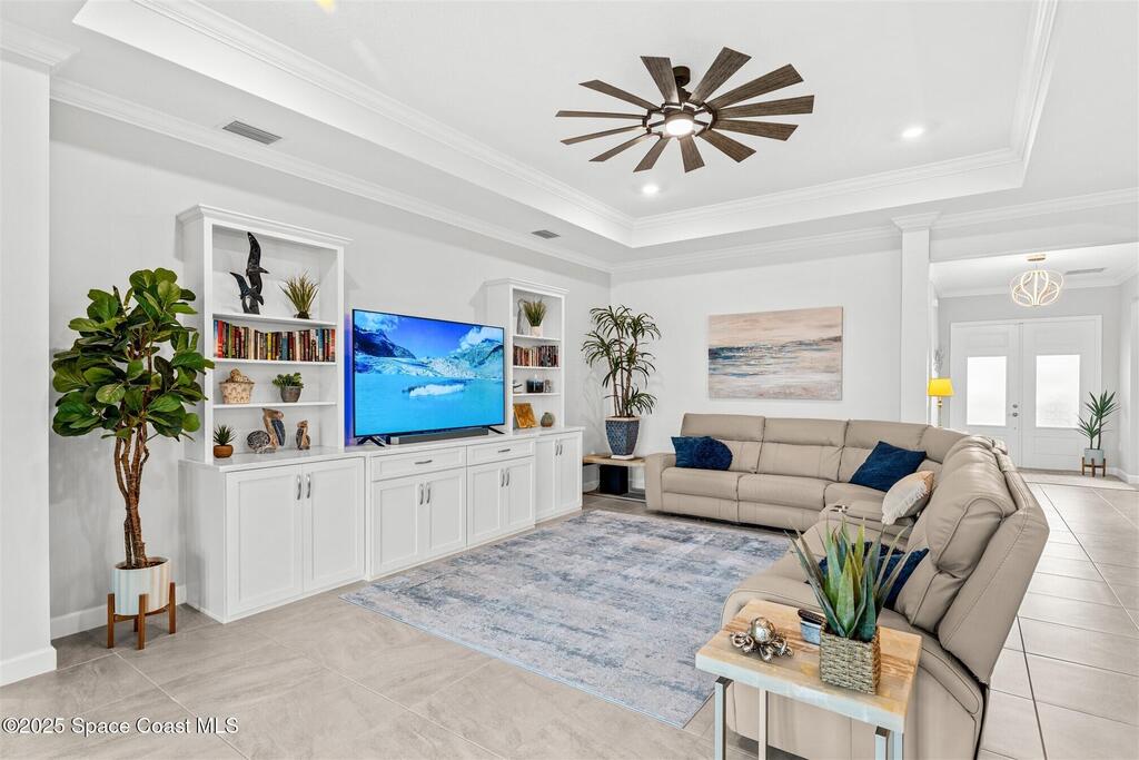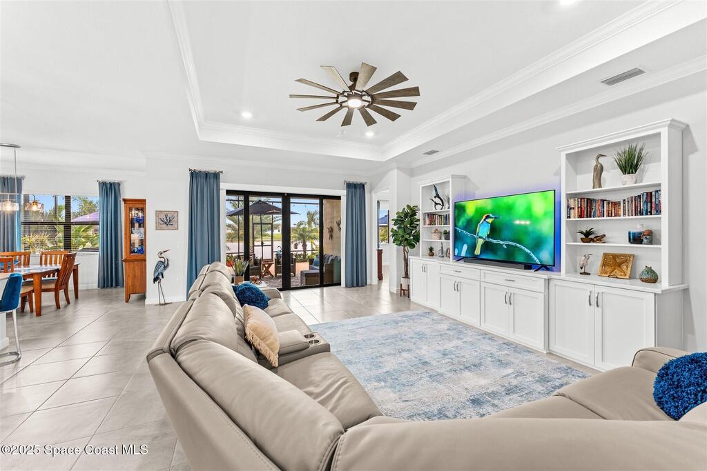 Waterfront luxury in Bridgewater, Viera's 55+ resort style gated community! This striking 3-bedroom + den, 3-bath, 3-car garage home was inspired by the builder's decorated model and features elegant upgrades such as custom shiplap accent walls and designer trim plus great room built-ins! Additional ''must-have'' features include IMPACT WINDOWS & SLIDERS, tile and crown molding throughout, a gourmet kitchen w/ wall ovens, cooktop and an oversized island. The primary suite boasts a sumptuous bath w/ walk-in shower, soaking tub, and dual walk-in custom closets. Perfect for entertaining, the great room's expansive sliders lead to a stunning 50'x15' screened lanai overlooking the water. And overnight guests enjoy their own en-suite retreat for comfort and privacy. Even the garage impresses with epoxy floors, overhead storage, and 240V outlet for an electric car. Bridgewater's private clubhouse offers a heated pool, spa, fitness center, tennis & pickleball courts, and even a movie theater