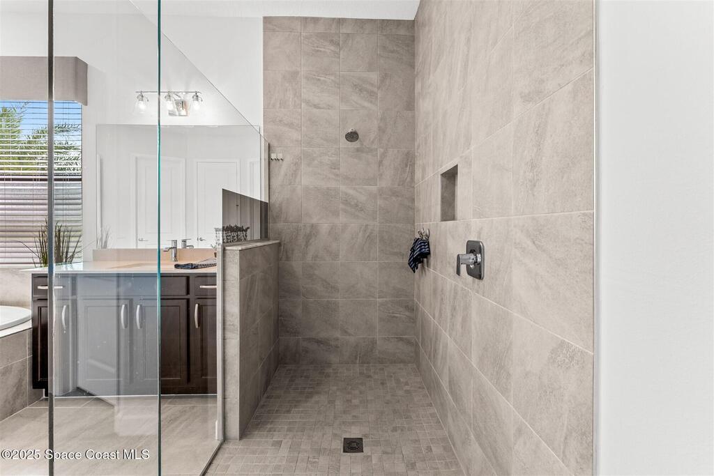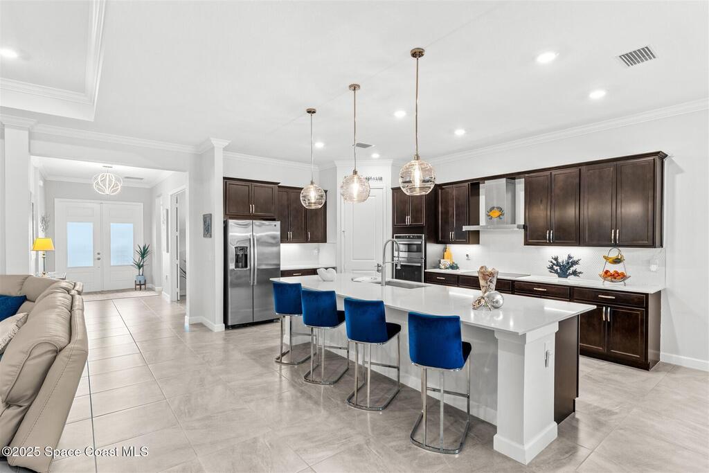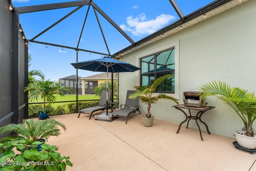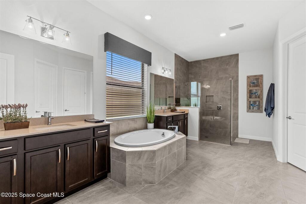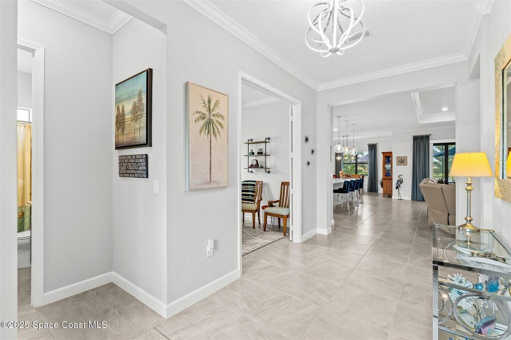 Waterfront luxury in Bridgewater, Viera's 55+ resort style gated community! This striking 3-bedroom + den, 3-bath, 3-car garage home was inspired by the builder's decorated model and features elegant upgrades such as custom shiplap accent walls and designer trim plus great room built-ins! Additional ''must-have'' features include IMPACT WINDOWS & SLIDERS, tile and crown molding throughout, a gourmet kitchen w/ wall ovens, cooktop and an oversized island. The primary suite boasts a sumptuous bath w/ walk-in shower, soaking tub, and dual walk-in custom closets. Perfect for entertaining, the great room's expansive sliders lead to a stunning 50'x15' screened lanai overlooking the water. And overnight guests enjoy their own en-suite retreat for comfort and privacy. Even the garage impresses with epoxy floors, overhead storage, and 240V outlet for an electric car. Bridgewater's private clubhouse offers a heated pool, spa, fitness center, tennis & pickleball courts, and even a movie theater