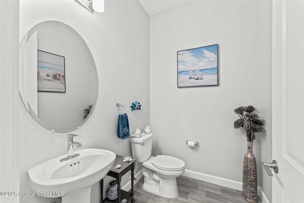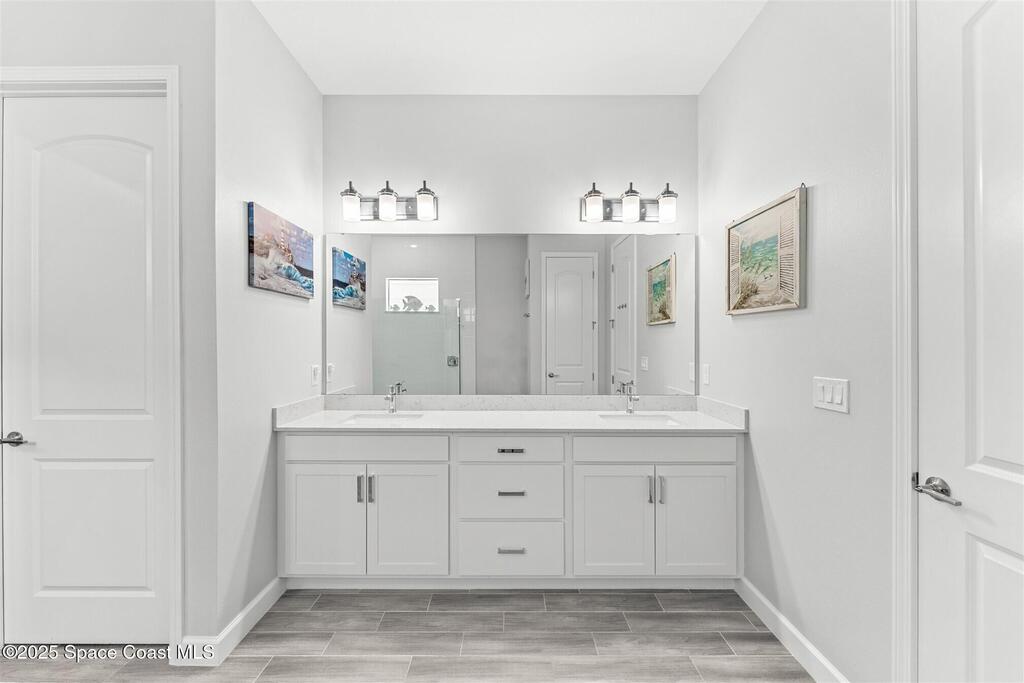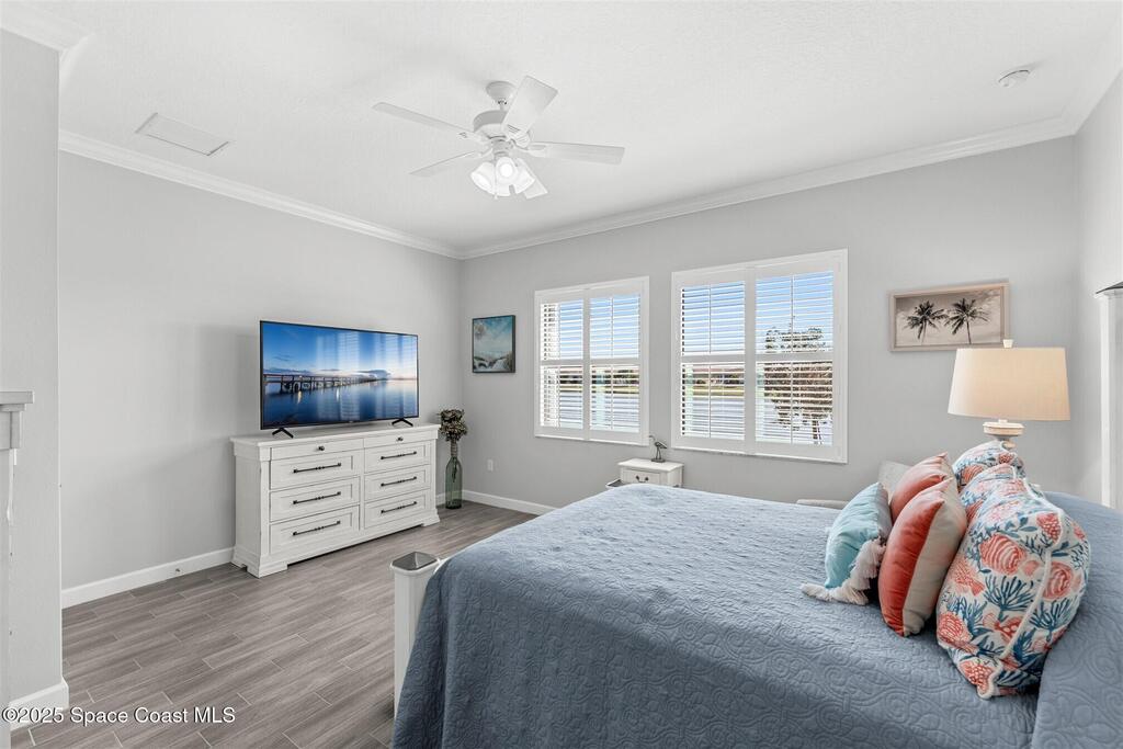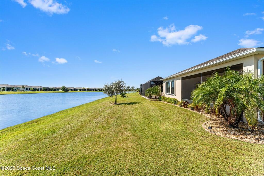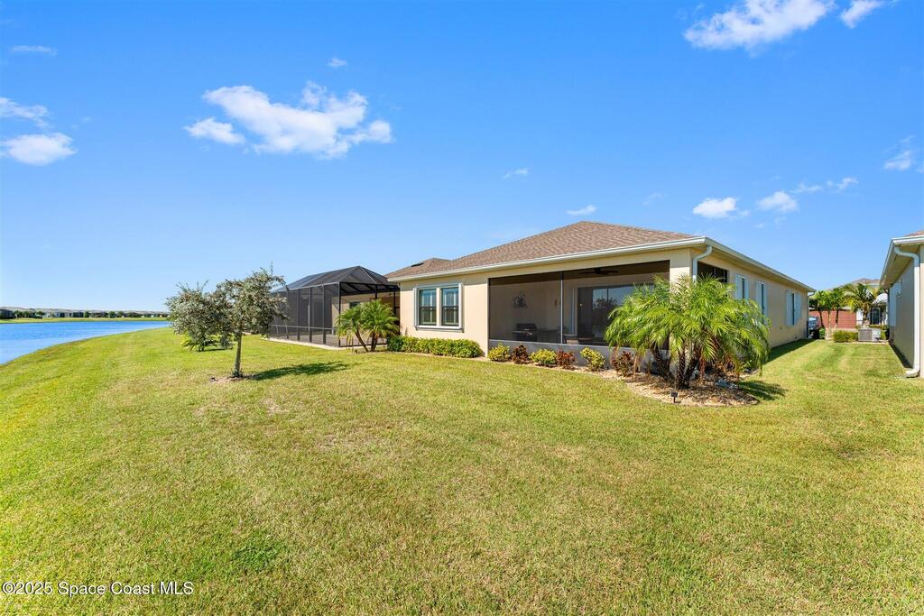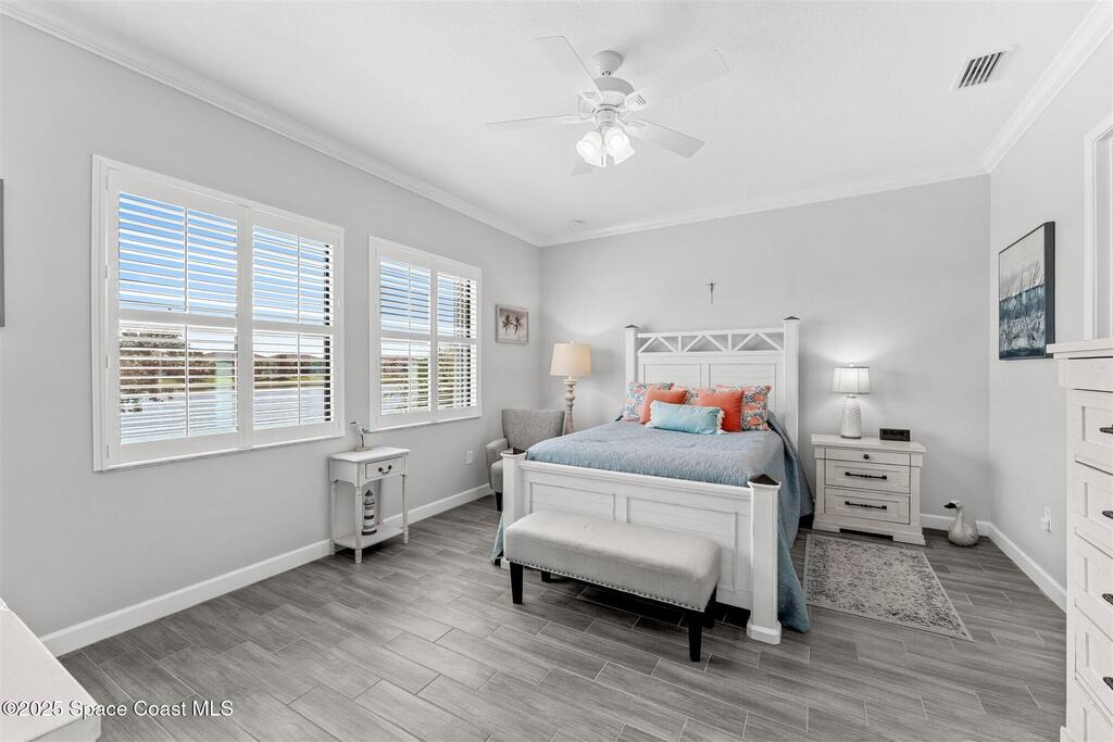 Pristine 3 bedroom plus study, 3 1/2 bath home in Bridgewater, Viera's popular 55+ resort style community! Move in ready with every upgrade: new porcelain tile plank floors throughout, crown molding, plantation shutters, screened in lanai, 8' doors, epoxy garage floors and more! Perfect for guests, every bedroom is an ensuite with its own bath! Large three panel sliders in great room bring the beautiful lake views into your home and set it apart from similar key largo style homes! The outside is as meticulous as the interior with stone trim enhancing the freshly painted exterior. As you approach the home, you will notice the stone landscape beds and impact glass etched front door. Accordion shutters are on all windows and sliders and a portable generator w/transformer switch add to your peace of mind. The private clubhouse offers a large, heated pool and spa, fitness center, tennis & pickleball courts and a movie theater! Short drive to ocean beaches, cruise ships, shopping, dining!