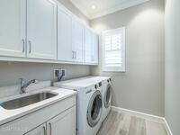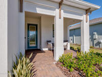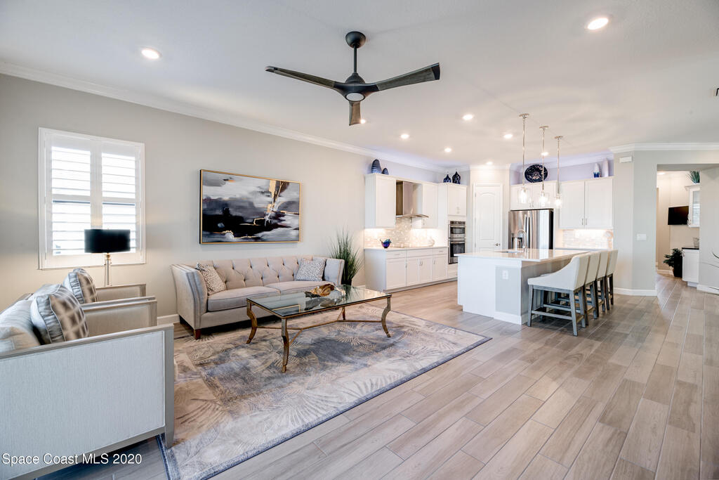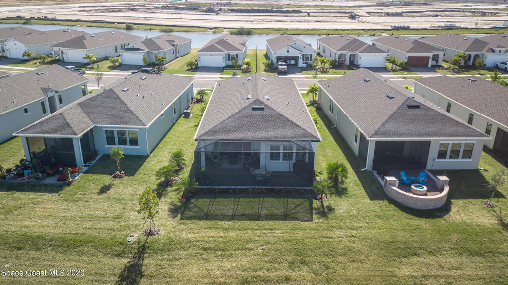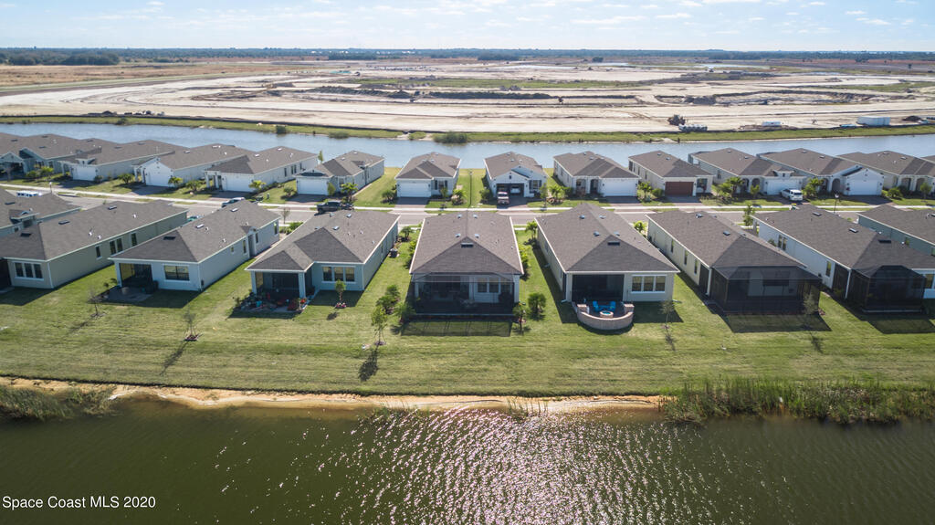 Less than one year old, stunning upgraded resale on a lake lot in Bridgewater, Viera's newest 55+gated resort community! Breathtaking gourmet kitchen w/ white cabinets with soft close doors and drawers, double ovens, cooktop, designer range hood, French door fridge with built in coffee maker, and 3 drawer DW! Must see huge island with large farmer's sink! Custom built-ins in flex room make entertaining guests delightful! Porcelain tile plank floors (no carpet!), crown molding, soft gray walls, plantation shutters, custom lighting & fans throughout, Outside will not disappoint with an extended screened paver lanai overlooking lake and rocket launches, accordion shutters on sliders and rear windows, beautiful impact etched glass front door, and extensive palm trees and landscaping.
