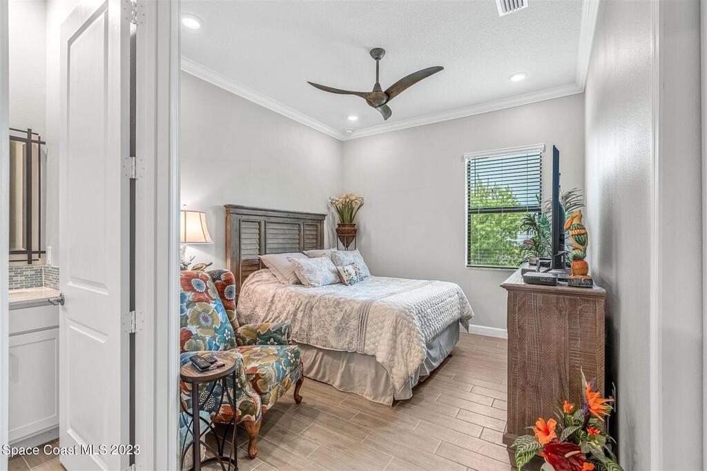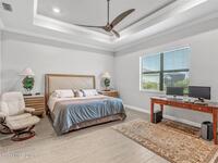 Rare opportunity to have the most sought-after floor plan on one of the largest lake front lots in Bridgewater, Viera's resort style 55+ gated community! This stunning nearly new 3 bedroom plus den, 3 bath, 3 car garage home, custom painted and decorated in the popular palette of whites and grays, has every option: plank tile and crown molding throughout, hurricane rated impact windows and slider, 8' doors, gourmet kitchen with wall ovens & cooktop and largest island offered, luxury bath package with quartz counters, decorator lighting and fans, epoxy garage floor, and over $20,000 in professional landscaping! Privacy abounds on this over half-acre lake lot with extended paver patio and additional trees. Less than one year old w/ Builder's Warranty! Smart Home! Amazing Clubhouse and Pool.