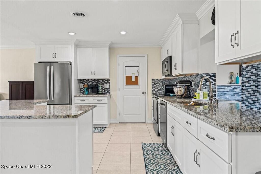 BRING YOUR BOAT! Completely remodeled 3 bedrooms, 2 baths, 2 car garage home on deep water canal with easy access to the Banana River. Roof replaced in 2020. A/C in 2019. 2022 new sewer line replaced with 50 year transferable warranty for Buyer. Natural Gas water heater in 2019. Beautiful kitchen with white shaker cabinets, granite countertops, stainless steel appliances, and tile backsplash. Bright and open floor plan. Huge family room with gorgeous water views. Beautifully remodeled bathrooms with matching shaker cabinets, granite counters, and frameless glass. Huge, fenced backyard with gorgeous mature oak tree, outdoor patio areas, dock, and boathouse. Large separate laundry and mudroom for tons of additional storage. This is an absolute can't miss property!