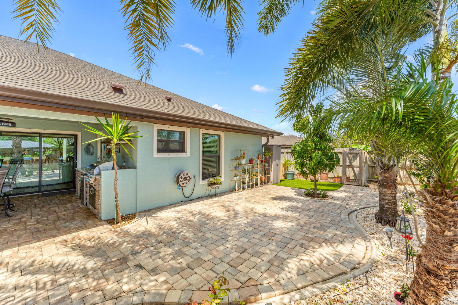 Welcome HOME! This stunning 3-bedroom, 3-bathroom home in the gated community of Brookhaven is ready for its new owners. Featuring beautiful wood-look ceramic tile throughout, this home boasts granite countertops in both the kitchen and bathrooms. The kitchen is equipped with stainless steel appliances, upgraded wood cabinets, a double pantry, a gas stove, and under-cabinet lighting. The great room is enhanced with a double tray ceiling, complete with lighting to create a sophisticated atmosphere. You'll also find elegant crown molding in the living room and owner's suite. The fully fenced backyard is a private oasis with numerous fruit trees, a serene outdoor koi pond, and a fully equipped outdoor summer kitchen featuring a granite countertop and pergola perfect for entertaining. Additional features include hurricane shutters, exterior security lighting, a security system, and a tankless water heater for efficiency. Schedule your appointment today to see all this home has to offer
