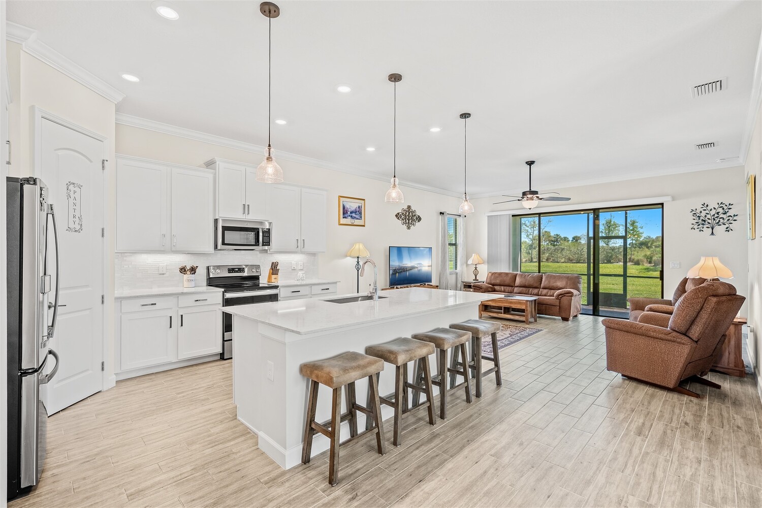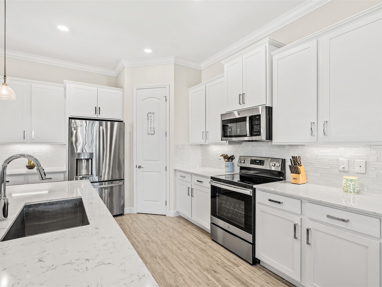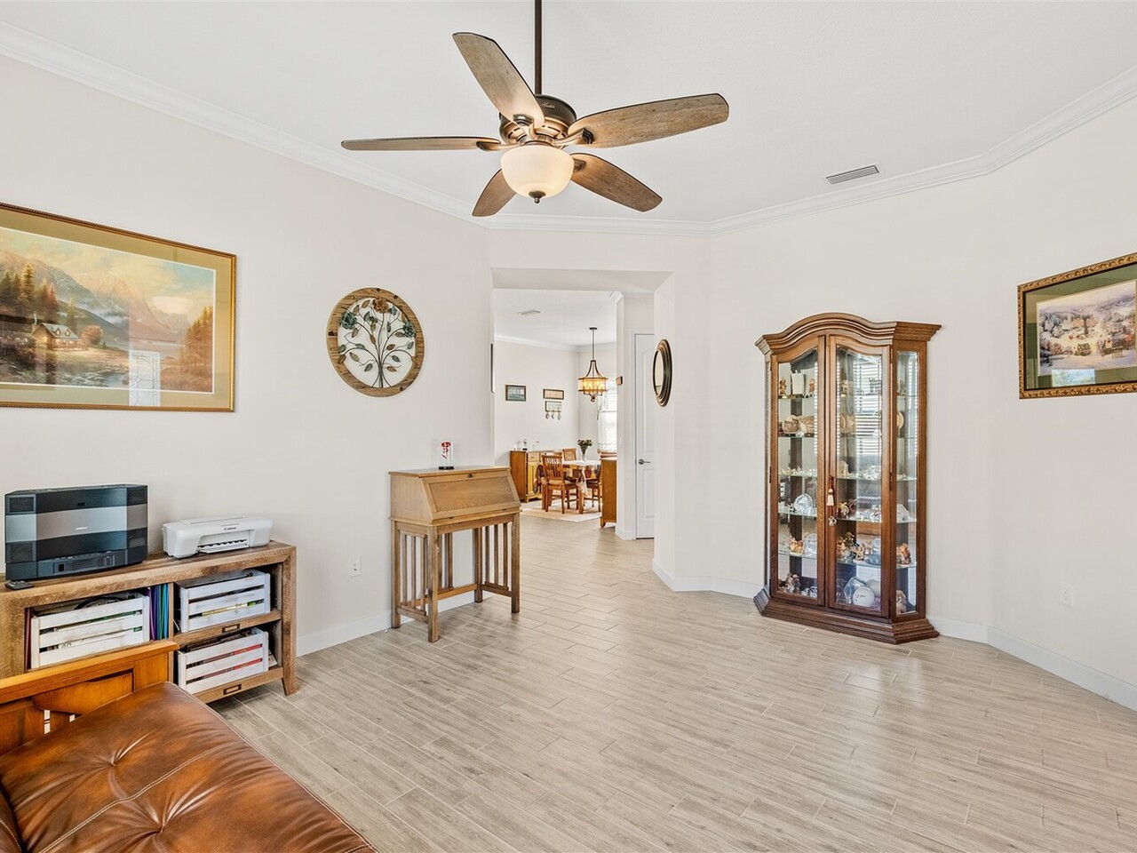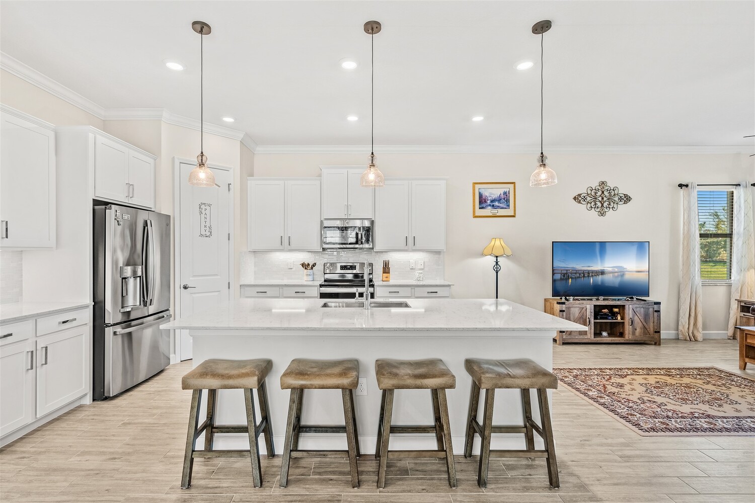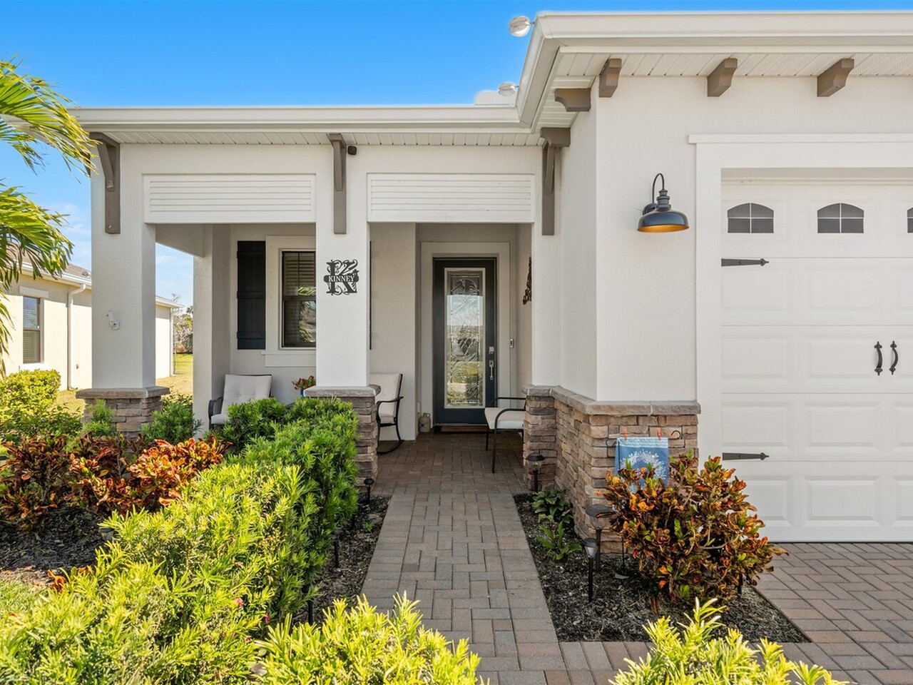 From the exterior with stone accents and inviting front porch to the screened-in lanai, this 2 bedroom plus flex room home in Bridgewater, Viera's sought after 55+ resort style community, epitomizes Florida living! Decorated in today's sought after palette of whites and grays, this ''open floor plan'' home checks off all the boxes. White kitchen cabinets, upscale backsplash, undercabinet and pendent lighting, marble look quartz counters in kitchen and baths, new porcelain tile flooring throughout (no carpet!), and elegant crown molding in main areas and bedrooms are the highlights of this home! New embossed impact glass front door! The state-of-the-art refrigerator brews your favorite coffee before you retreat to the front porch or the screened in rear lanai. The HOA provides lawn care and includes a stunning private clubhouse, complete with heated pool and spa, fitness center, tennis and pickleball courts, billiards room and its own movie theater! Close to shopping & restaurants!